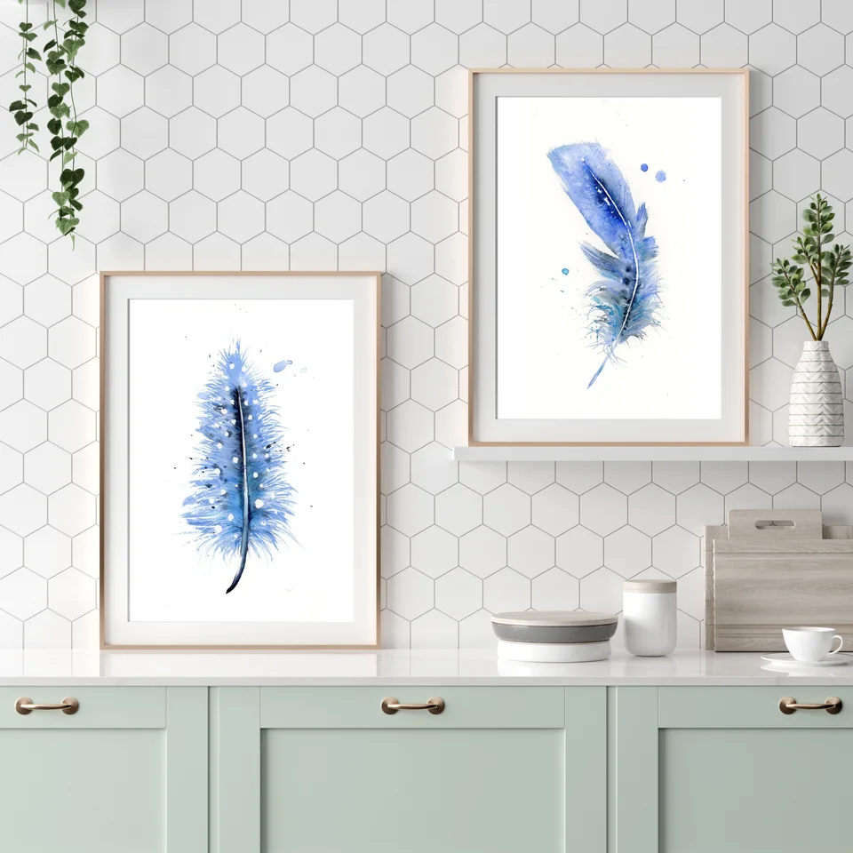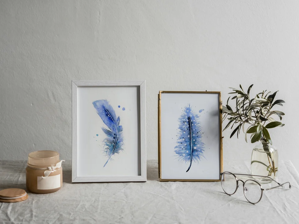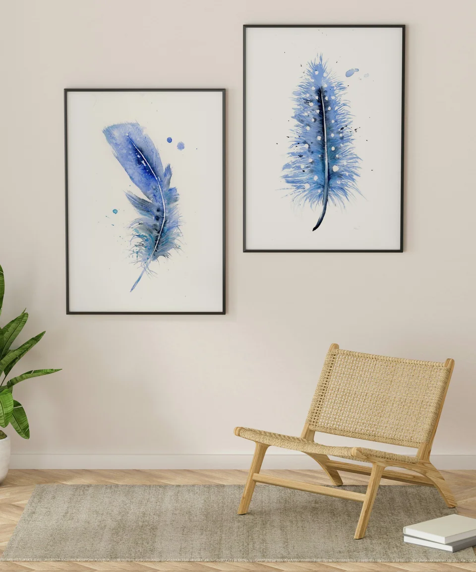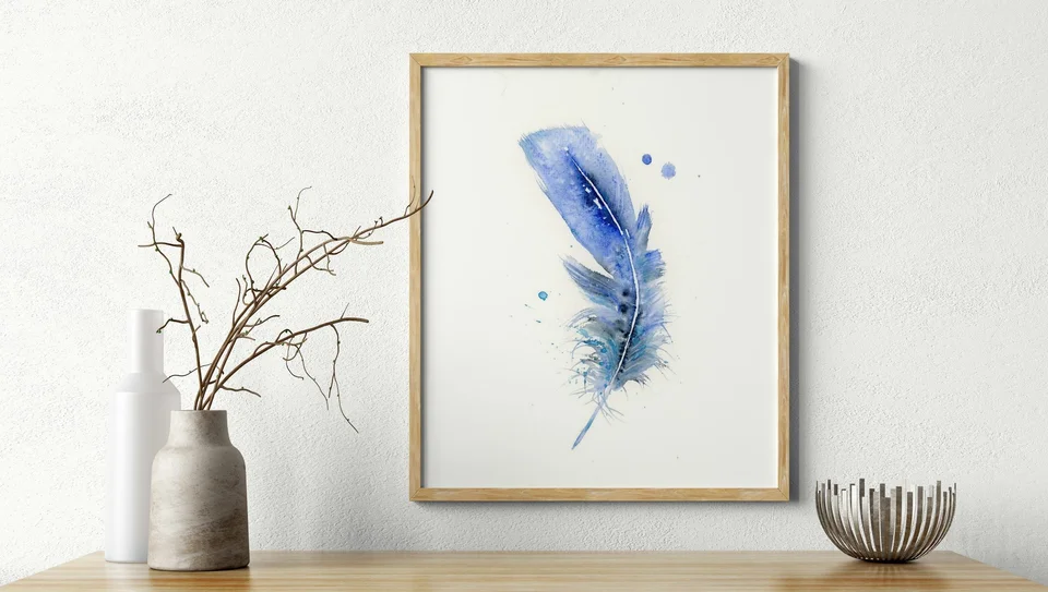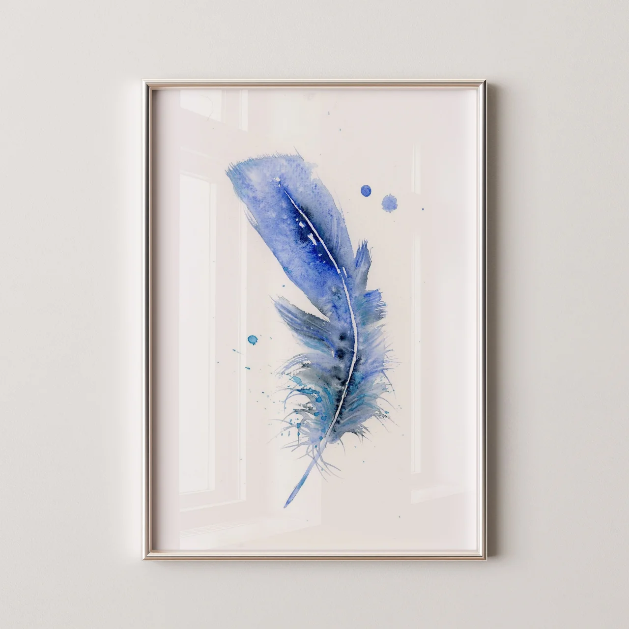 In this piece, I used varying shades of blue and gentle washes to create a feather floating effortlessly on the canvas. The soft transitions and delicate layering of watercolor capture the lightness and grace, while the subtle splatters and drips add a playful touch. My brushstrokes are gentle yet intentional, giving the feather a sense of calm and natural order that I find truly soothing. — Shayna, August 2023