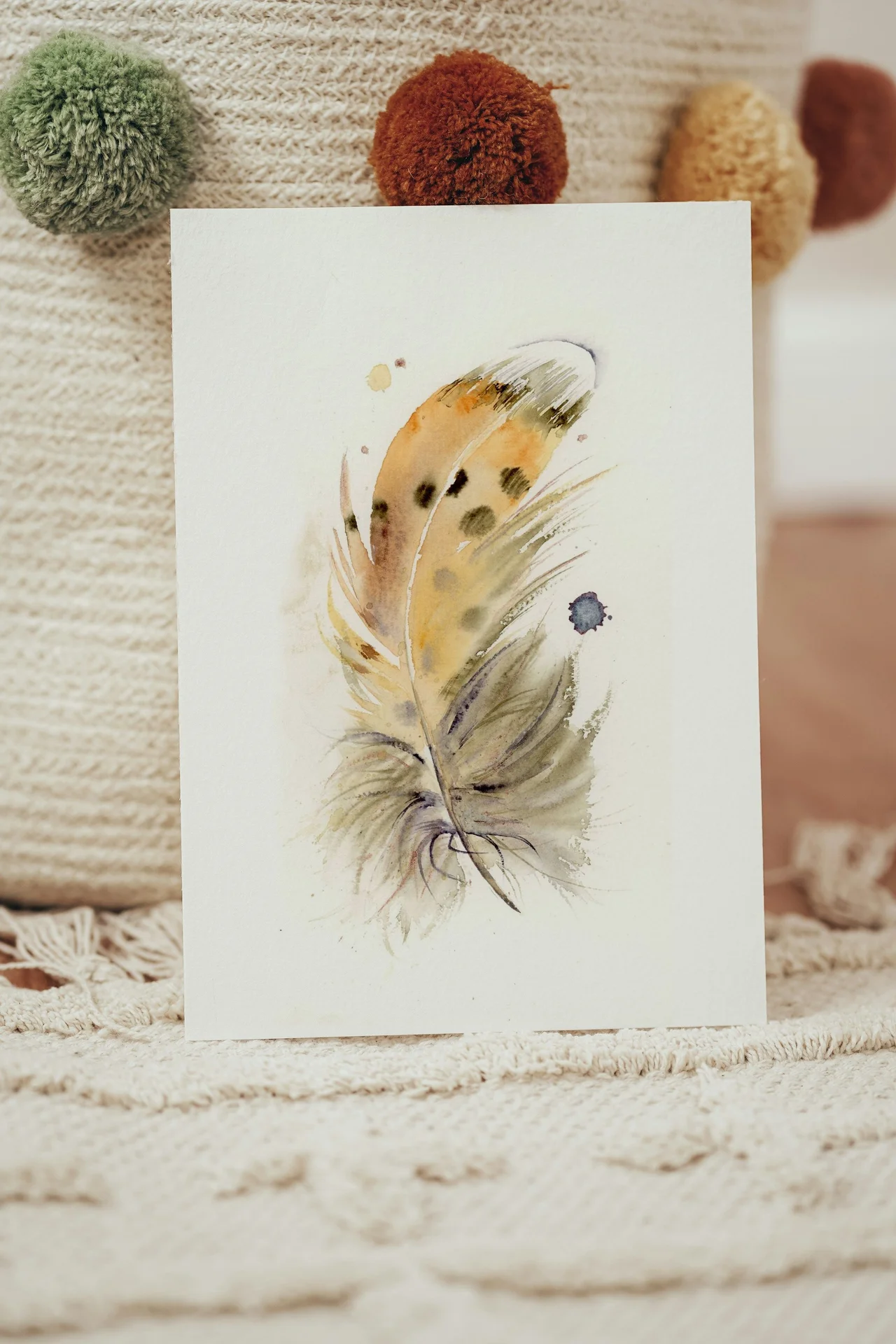 In this painting, I used a custom palette featuring my handmade pigment, Rocky Mountain #7, to bring a subtle vibrancy to the feather's delicate and earthy tones. The gentle layering and soft transitions of color create a sense of interconnectedness, while the light brushstrokes and strategic splatters offer movement and life. Through this work, I hope to convey a sense of comfort and deep affection, inviting viewers to feel a connection to the beauty found in the smallest details. — Shayna, September 2023