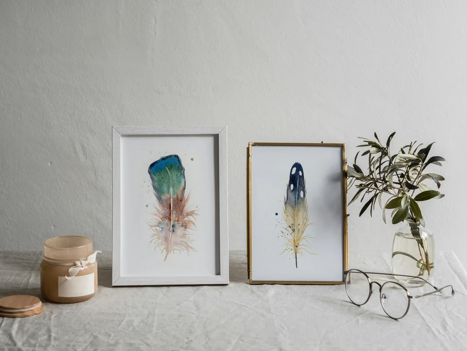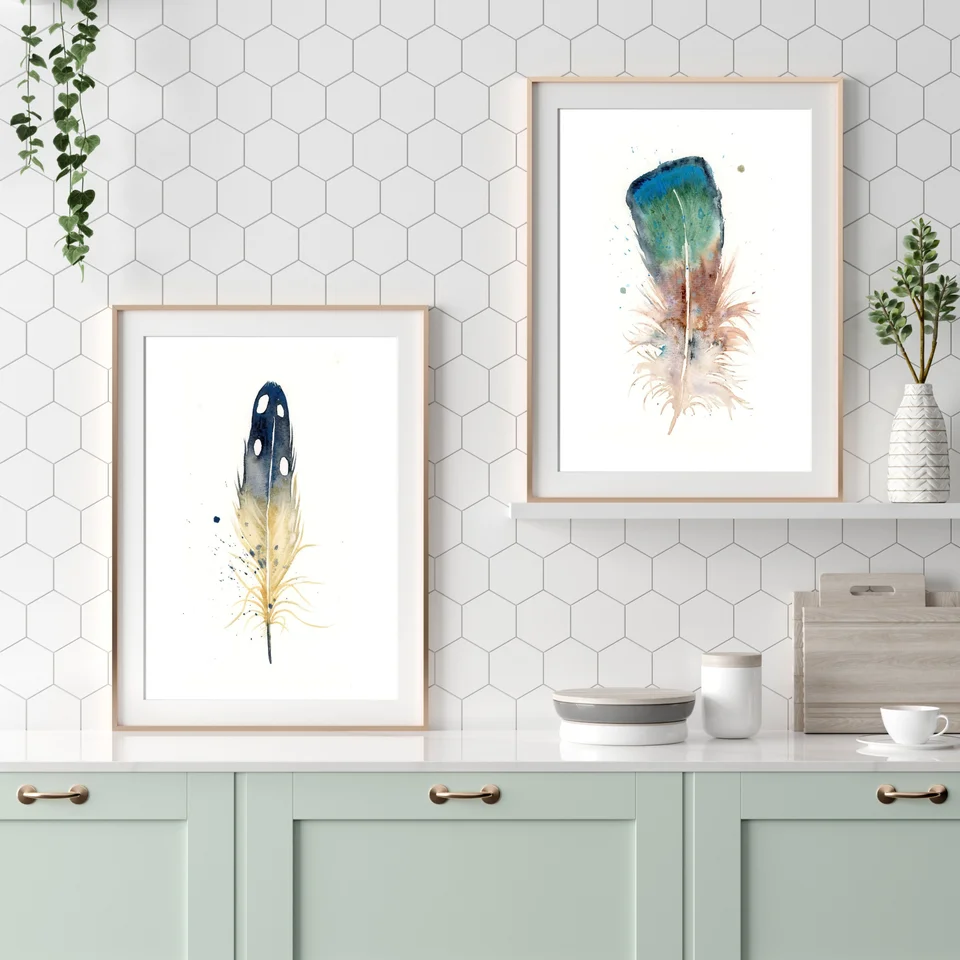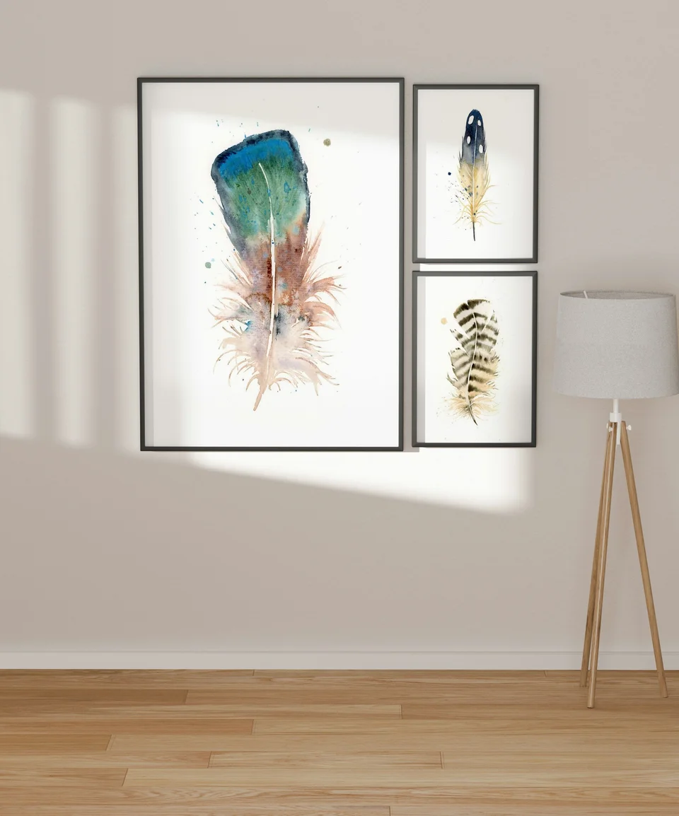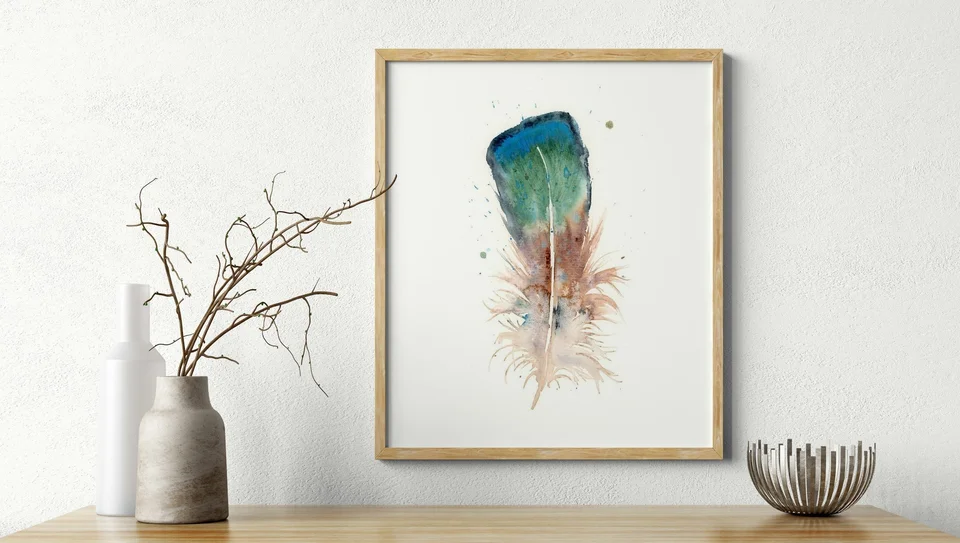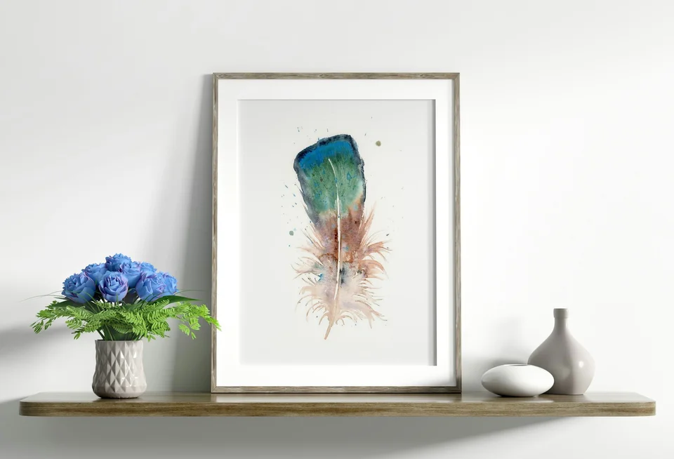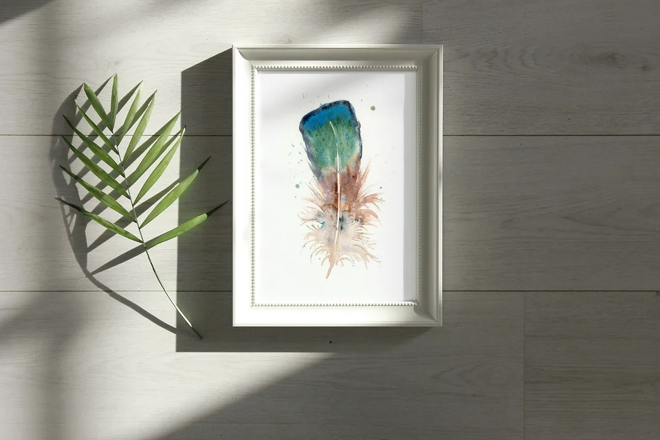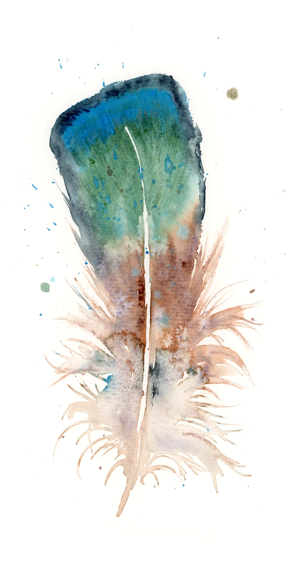 I chose to weave together deep blues, rich greens, and warm earthy browns with my hand-made Rocky Mountain Green #1 pigment. The soft brushstrokes meld these colors into a feather that feels both free and grounded, with gentle splatters and… read more