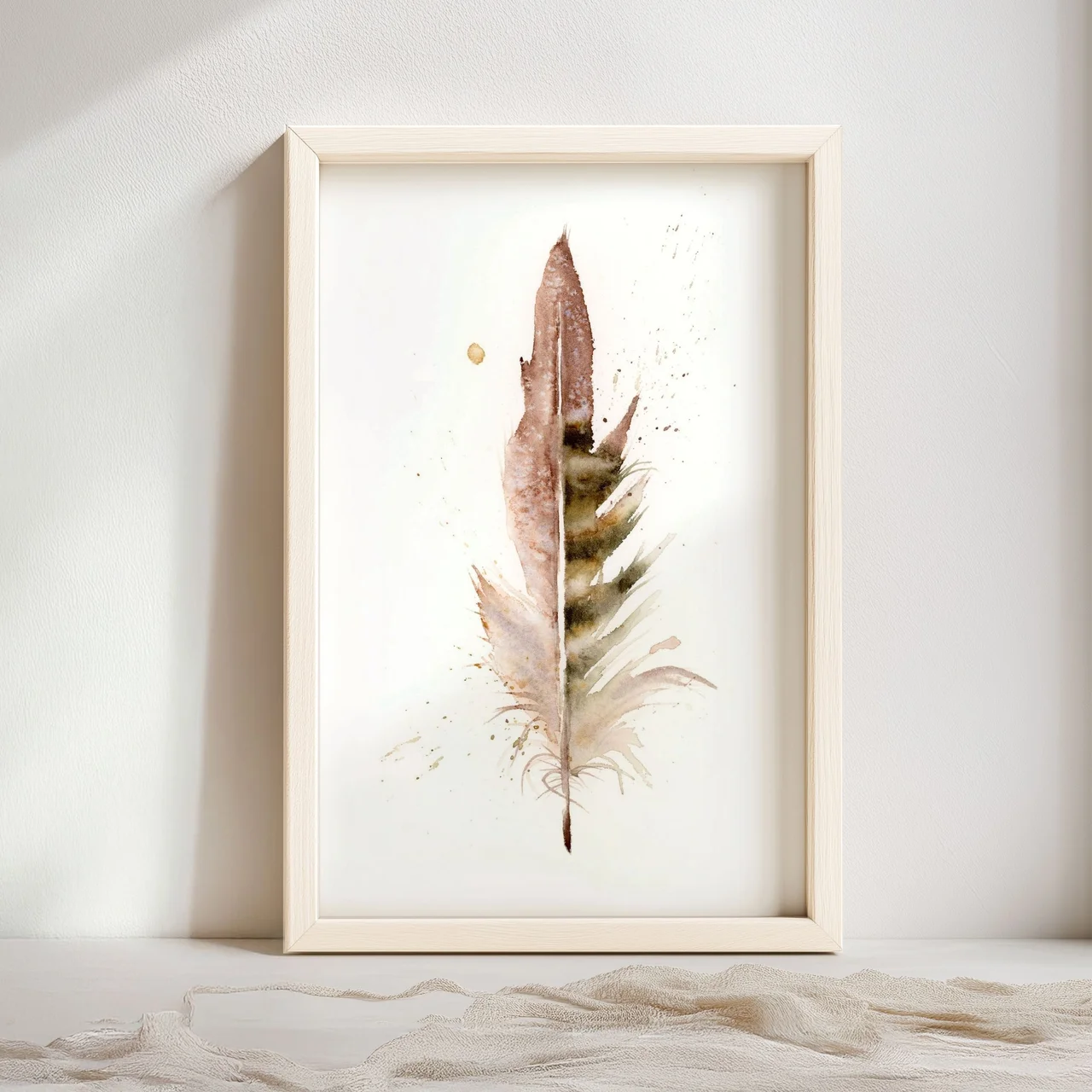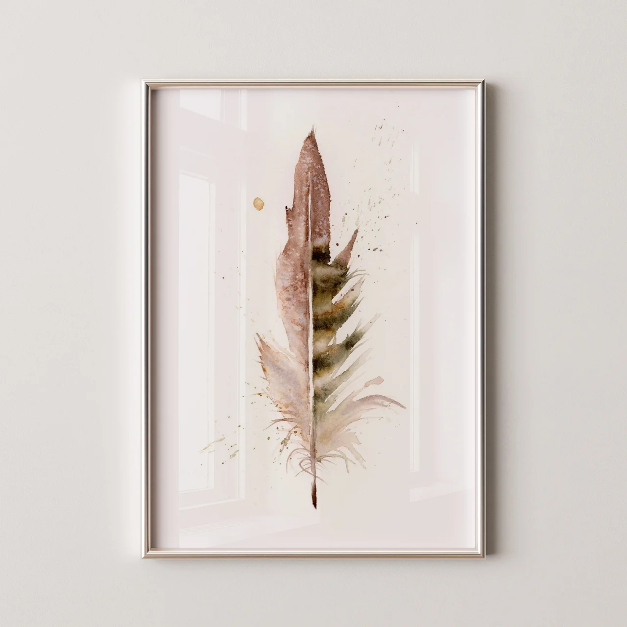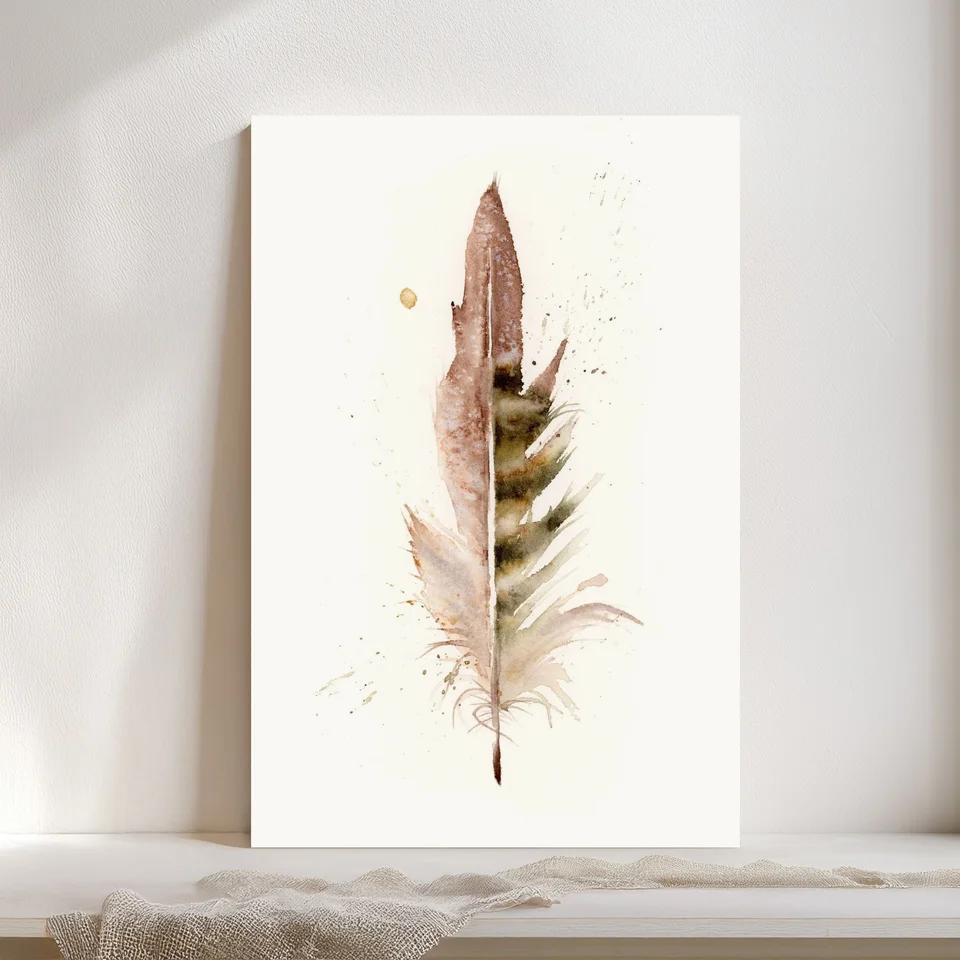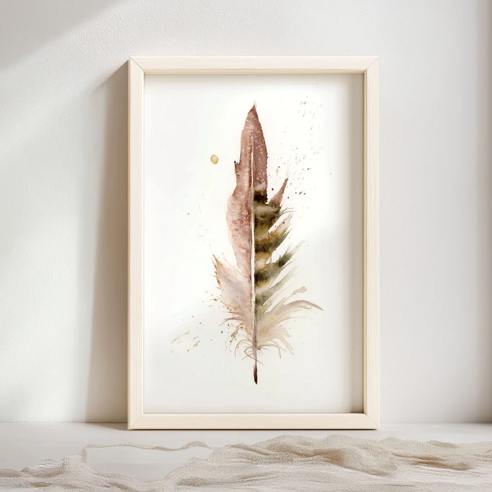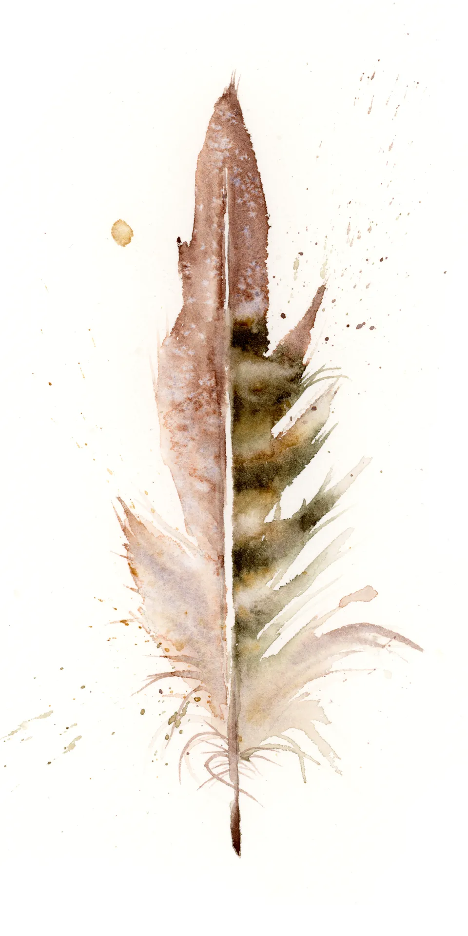 I poured my heart into this piece, using the hand-made pigment Rocky Mountain #5 to capture the warm, earthy tones that flow through the feather's structure. The delicate transitions and subtle layering speak to an inner strength, while gentle brushstrokes and splatters reflect a spirit that refuses to be subdued. As I worked, I felt a quiet assurance in my ability to transform simple pigments into something that speaks to the enduring nature of triumph and perseverance. — Shayna, November 2023