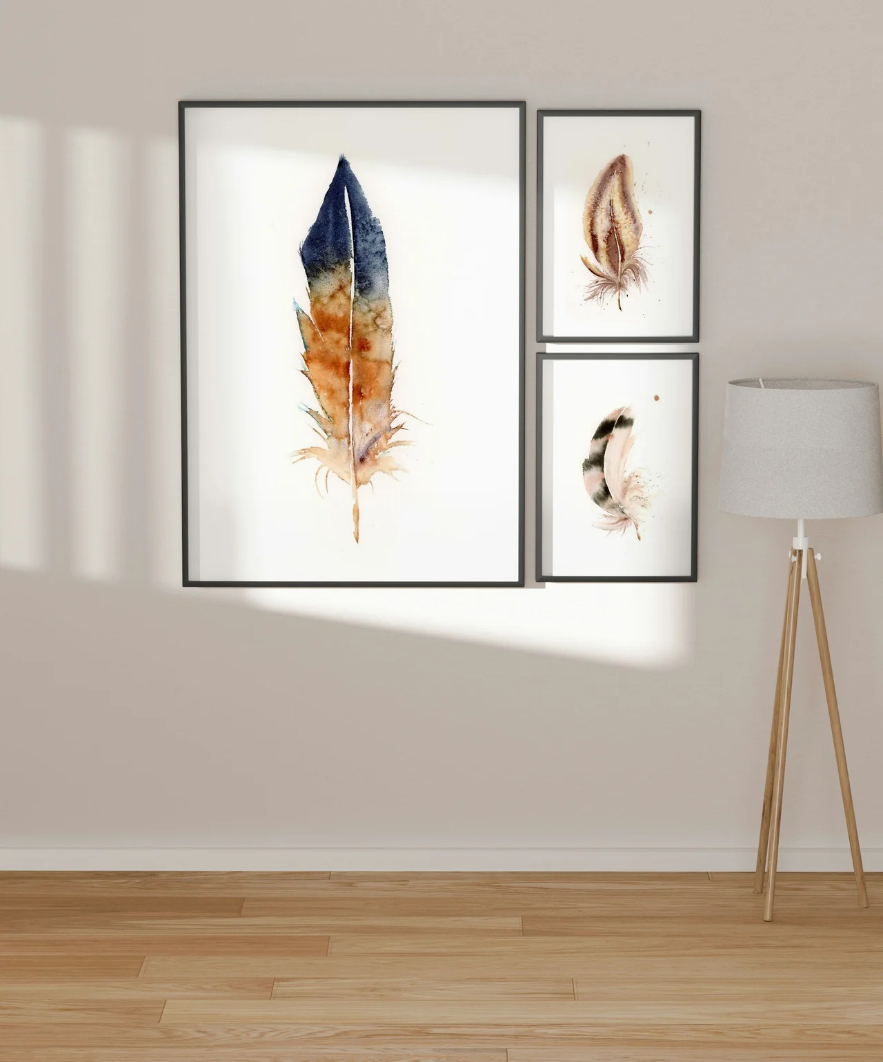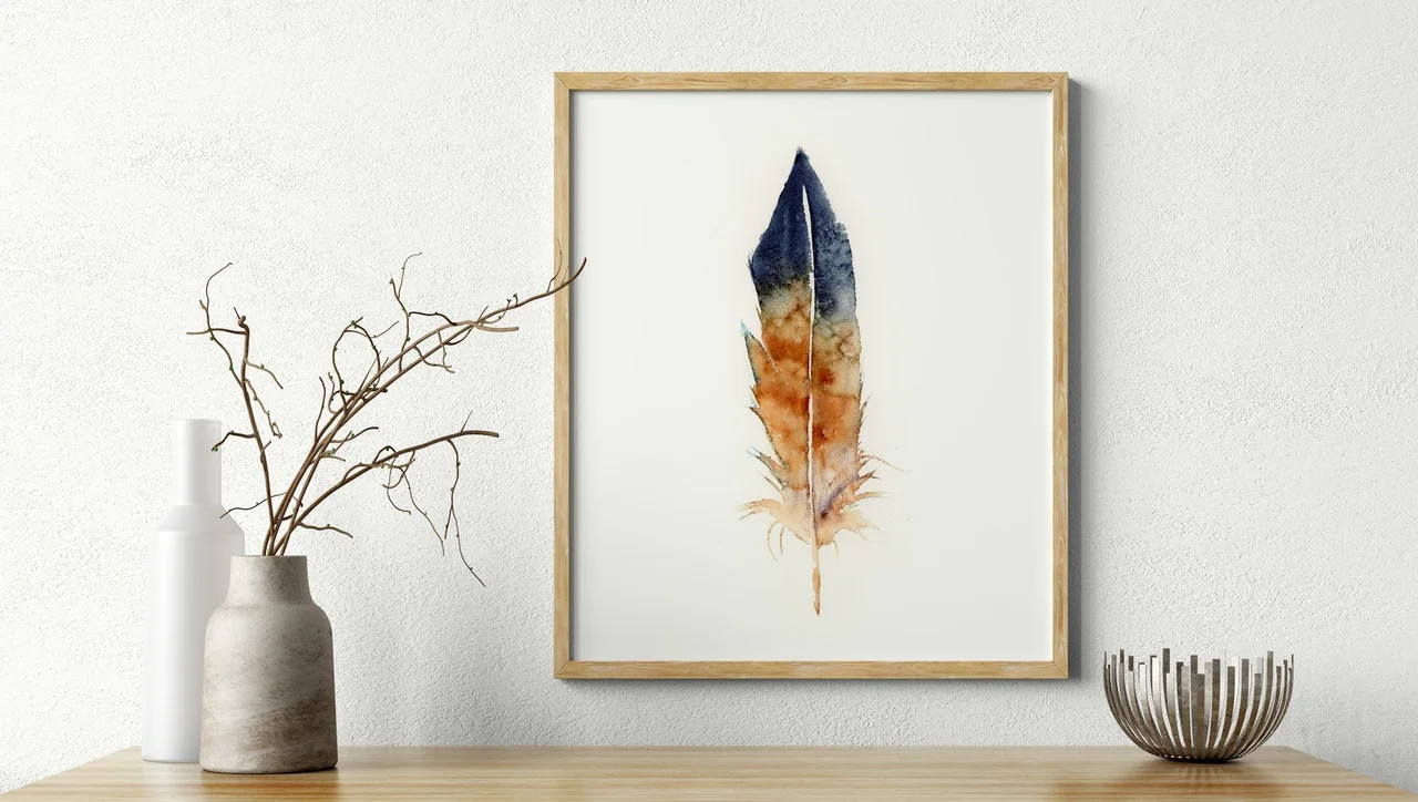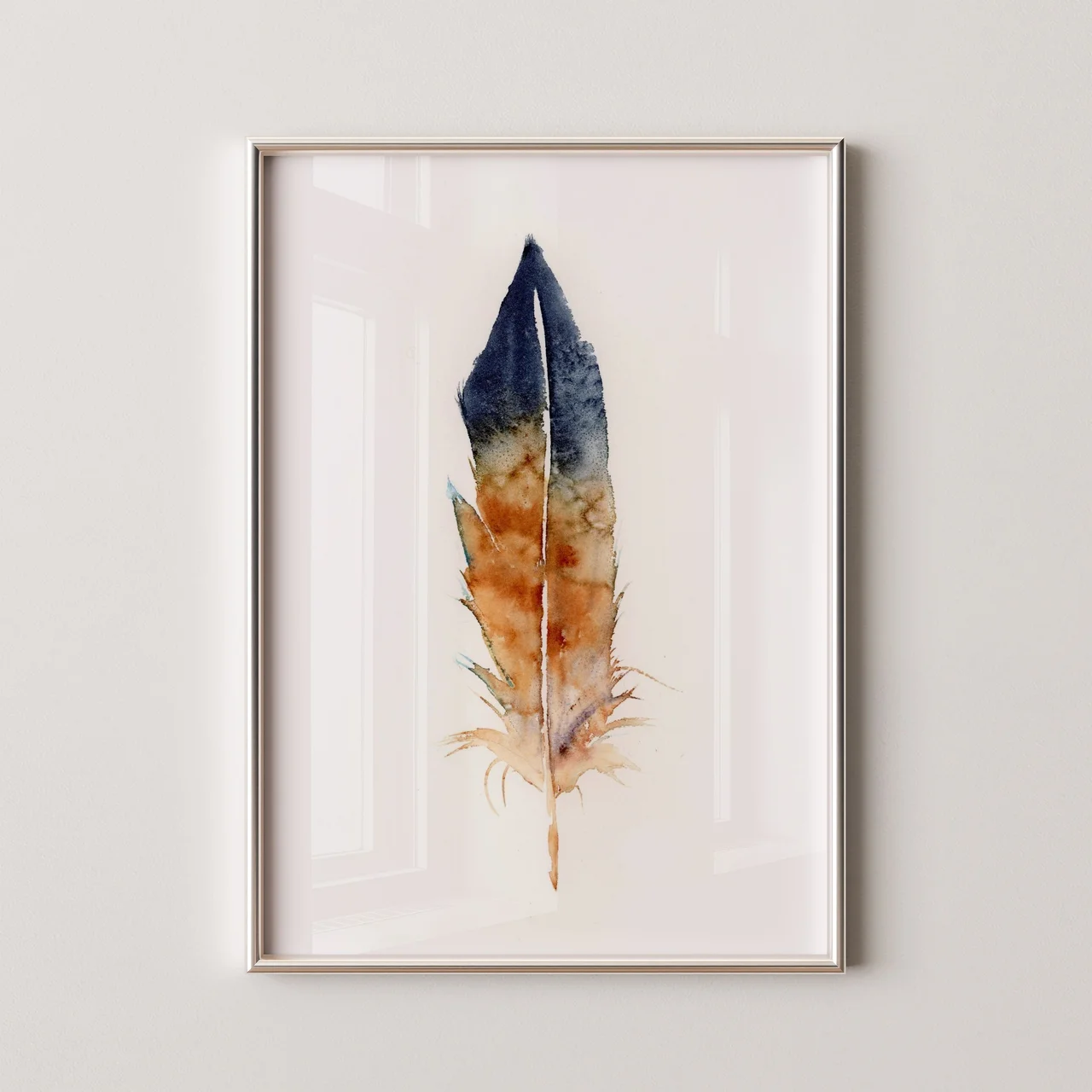 In this painting, I used deep indigos and warm browns to create a sense of calm and reliability. I let the watercolor flow naturally, creating soft transitions and delicate drips to mimic the gentle strength of the feather. Each brushstroke is intentional yet free, capturing the fluid movement of nature, while the layering adds depth and subtlety, inviting you to believe in what you can't always see. — Shayna, November 2023