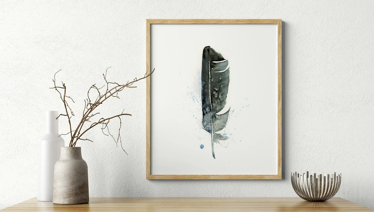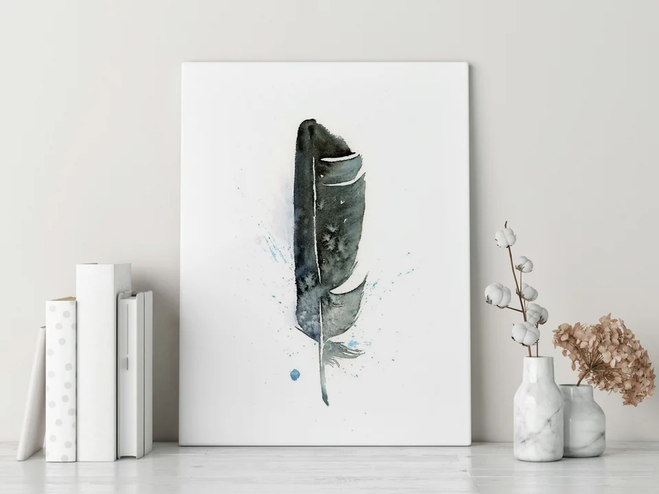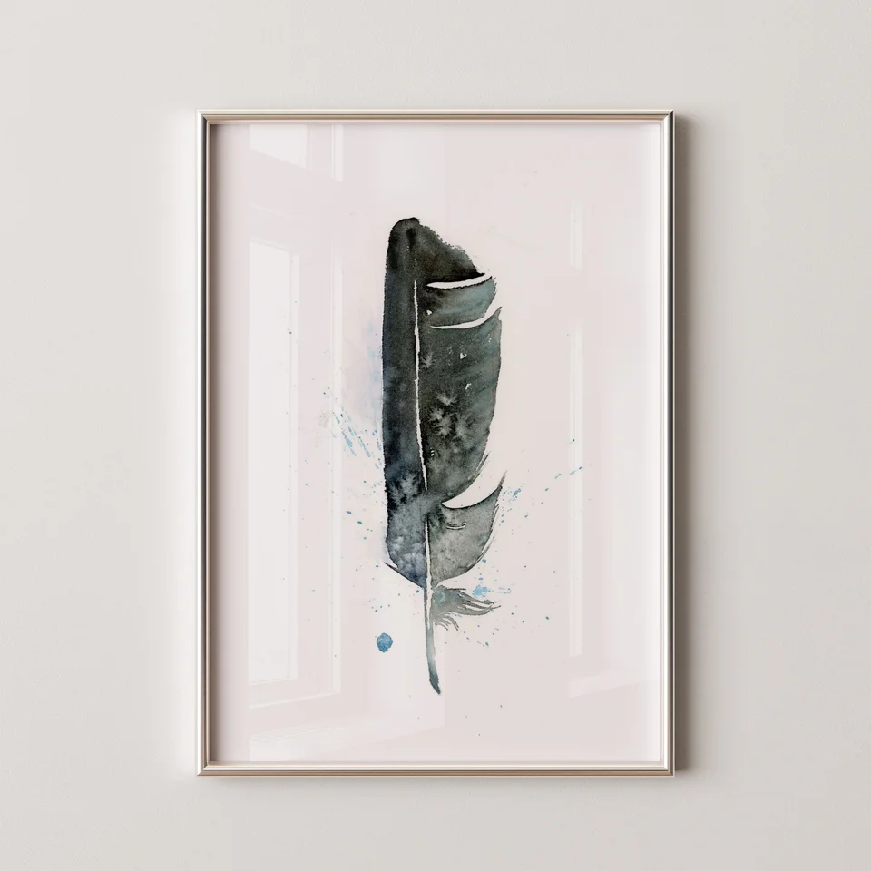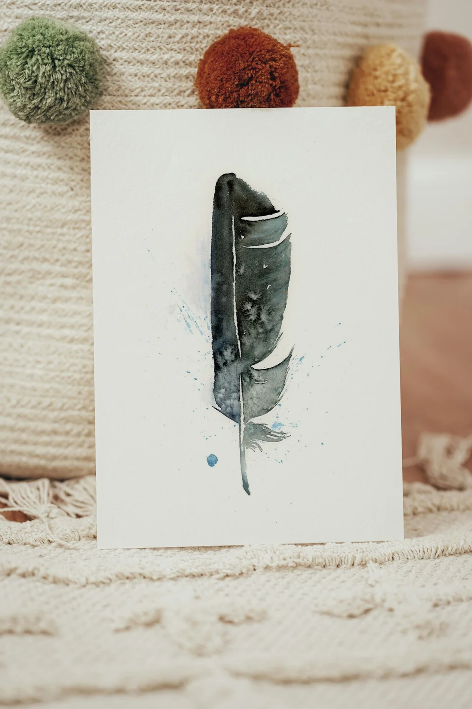 In this piece, I carefully used subtle grays and soft blues to create a feather that feels as though it's floating gently in mid-air. The delicate transitions and smooth layering of watercolors allow the feather to have a soft edge, while intentional splatters and gentle drips introduce a sense of breeziness and openness. My brushstrokes are light and free-flowing, capturing a sense of quiet movement that invites a moment of calm and possibility into any space. — Shayna, November 2023