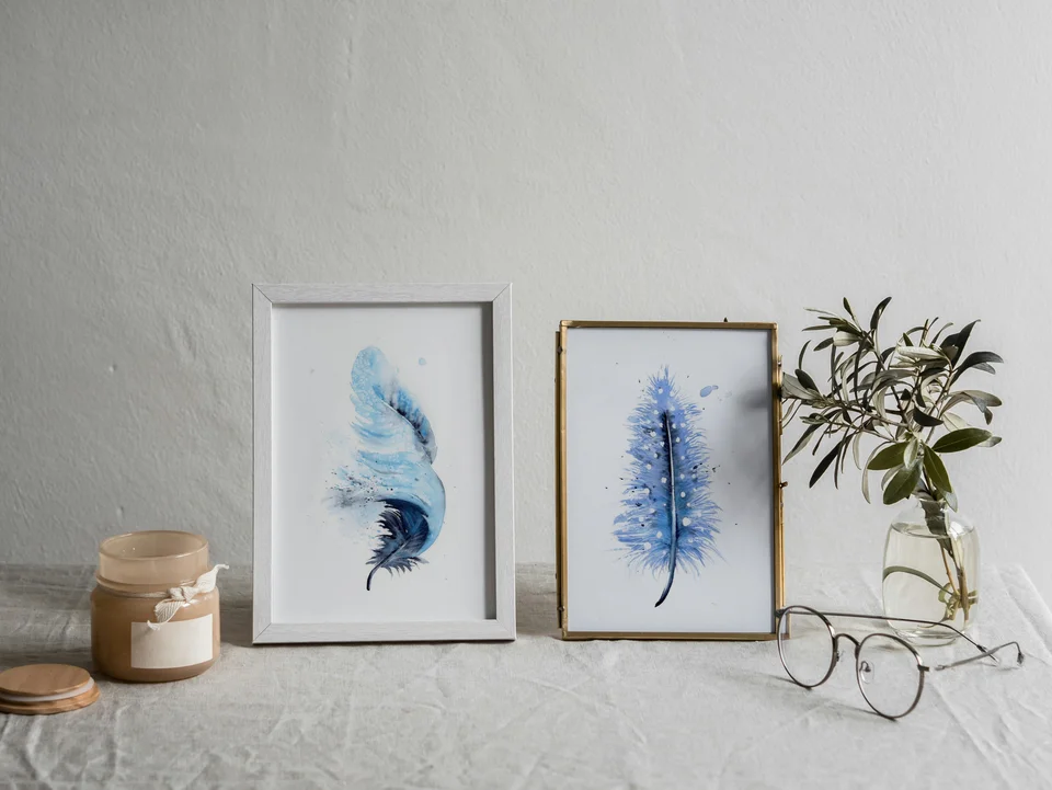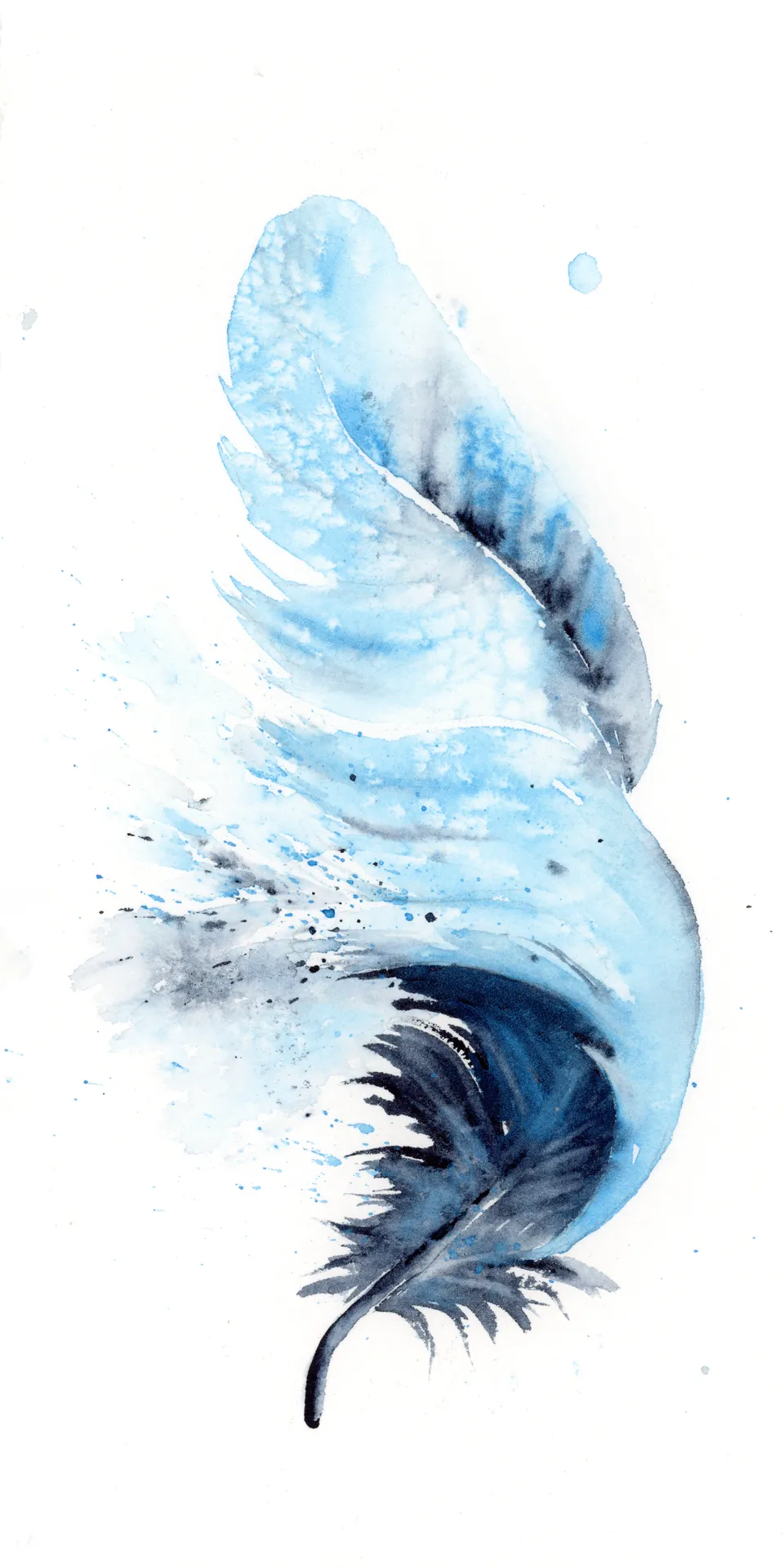 In this painting, I focused on gentle blues that flow into deeper indigos, capturing the lightness and serenity of a single feather. The smooth transitions and subtle layering create a sense of peace and connection, with delicate brushstrokes and light splatters adding to the feeling of natural freedom. By using these soft colors and fluid shapes, I wanted to remind you of those quiet moments when you feel truly connected and cared for. — Shayna, December 2023