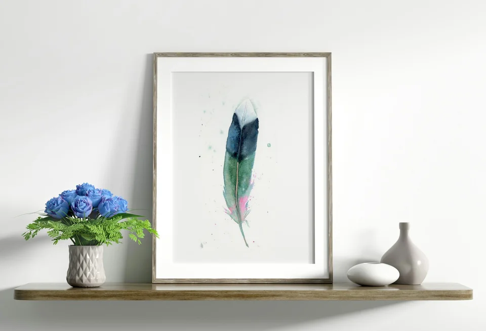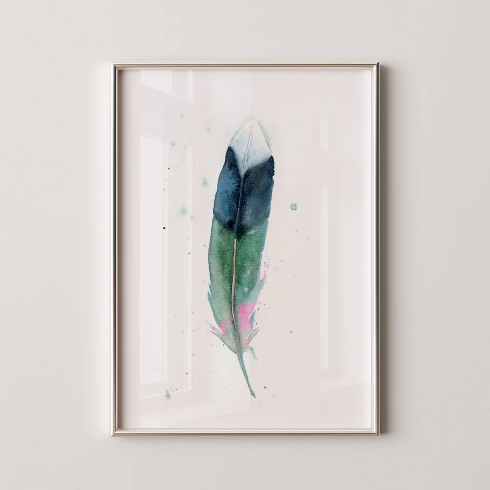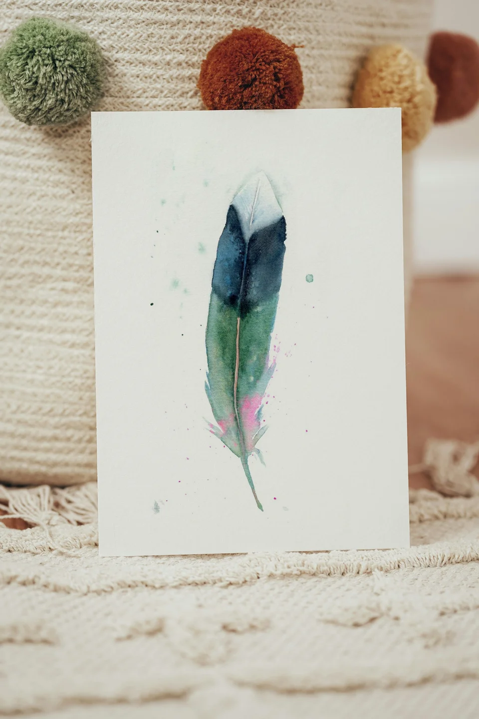 In this painting, I chose to use soft blues and greens to create a calming feather, with gentle transitions and delicate layers that reflect the ease and elegance of nature. My brushstrokes are subtle and carefully placed, allowing the colors to blend seamlessly and the edges to remain soft, inviting a sense of warmth and comfort. The splashes of pink add a dynamic contrast, creating a focal point that feels both fresh and reassuring, much like a quiet morning or a gentle breeze inviting you to pause and breathe deeply. — Shayna, December 2022