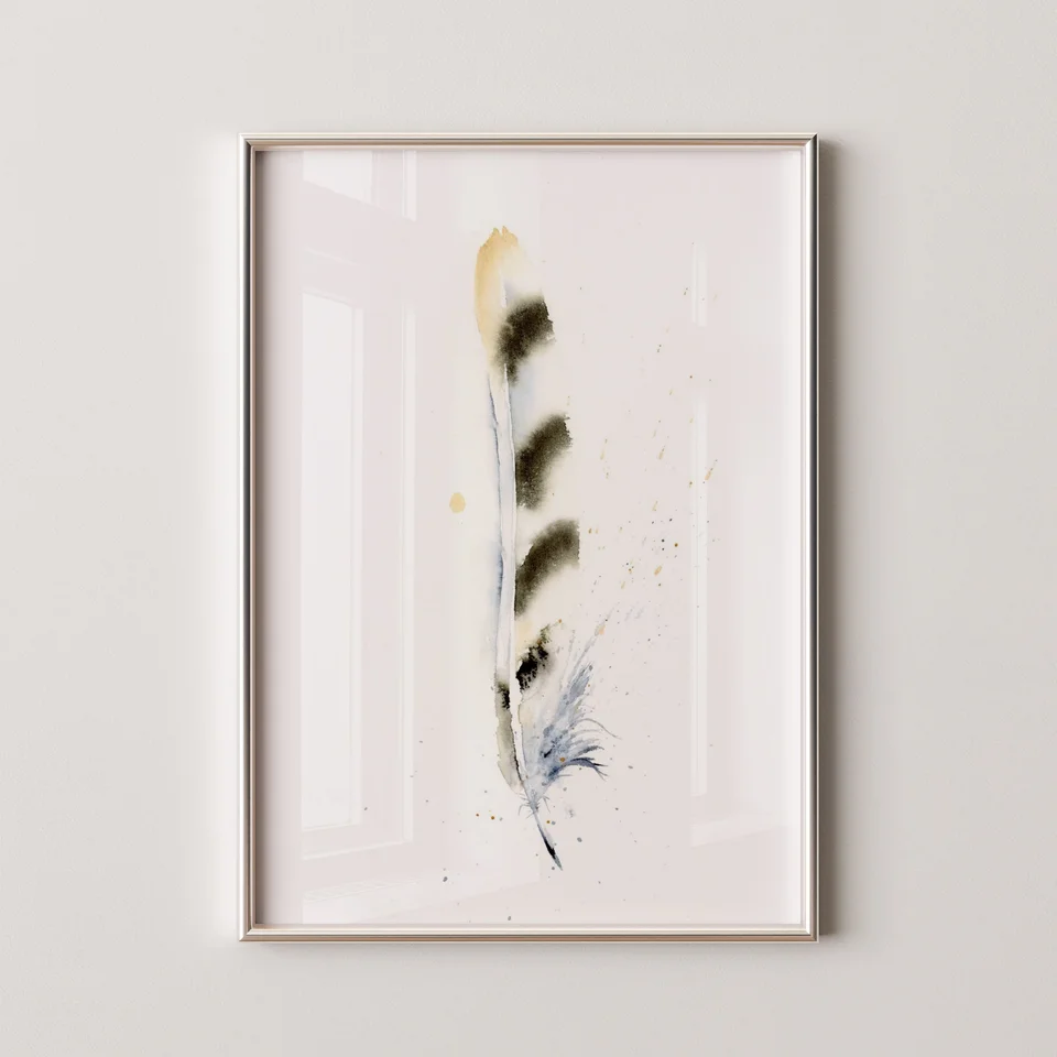 In this piece, I used the hand-made pigment Rocky Mountain #5 to capture the delicate beauty and subtle power of a single feather. The gentle transitions from soft beige to deep charcoal create a sense of depth, while the light, fluid brushstrokes make the feather appear to float lightly on the canvas. The splatters and drips hint at the unexpected turns life takes, and the way the edges softly blur into the background speaks to strength found in gentle persistence. — Shayna, January 2024