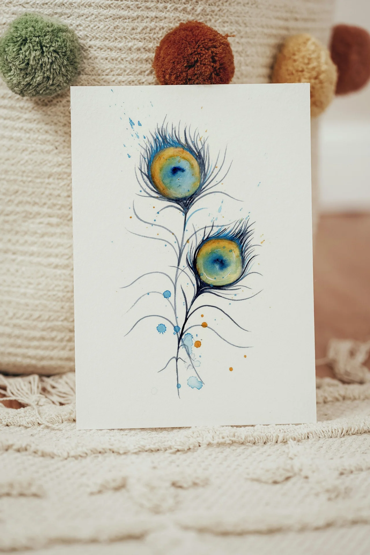 In this painting, I intentionally used a vibrant palette of blues and oranges to capture a sense of calm strength. The delicate layering of colors, with fluid transitions and gentle brushstrokes, creates a dynamic movement that reflects nature’s ability to adapt and thrive. I love how the splatters and drips add an element of spontaneity, while the elegant shapes of the feathers seem to dance, whispering stories of overcoming challenges with grace. — Shayna, February 2024