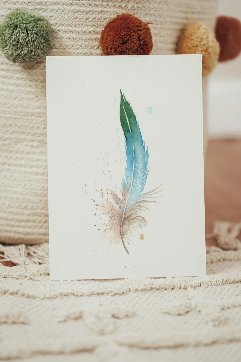 I gently layered handmade Rocky Mountain #6 pigments to create this piece, blending soft greens and blues with warm, earthy tones. The feather's edges are delicately defined, yet they flow into each other with a seamless transition, giving a sense of calm movement. As I painted, I felt a deep sense of contentment, imagining the gentle drift of the feather inspiring a quiet appreciation for life's simple, beautiful moments. — Shayna, February 2024