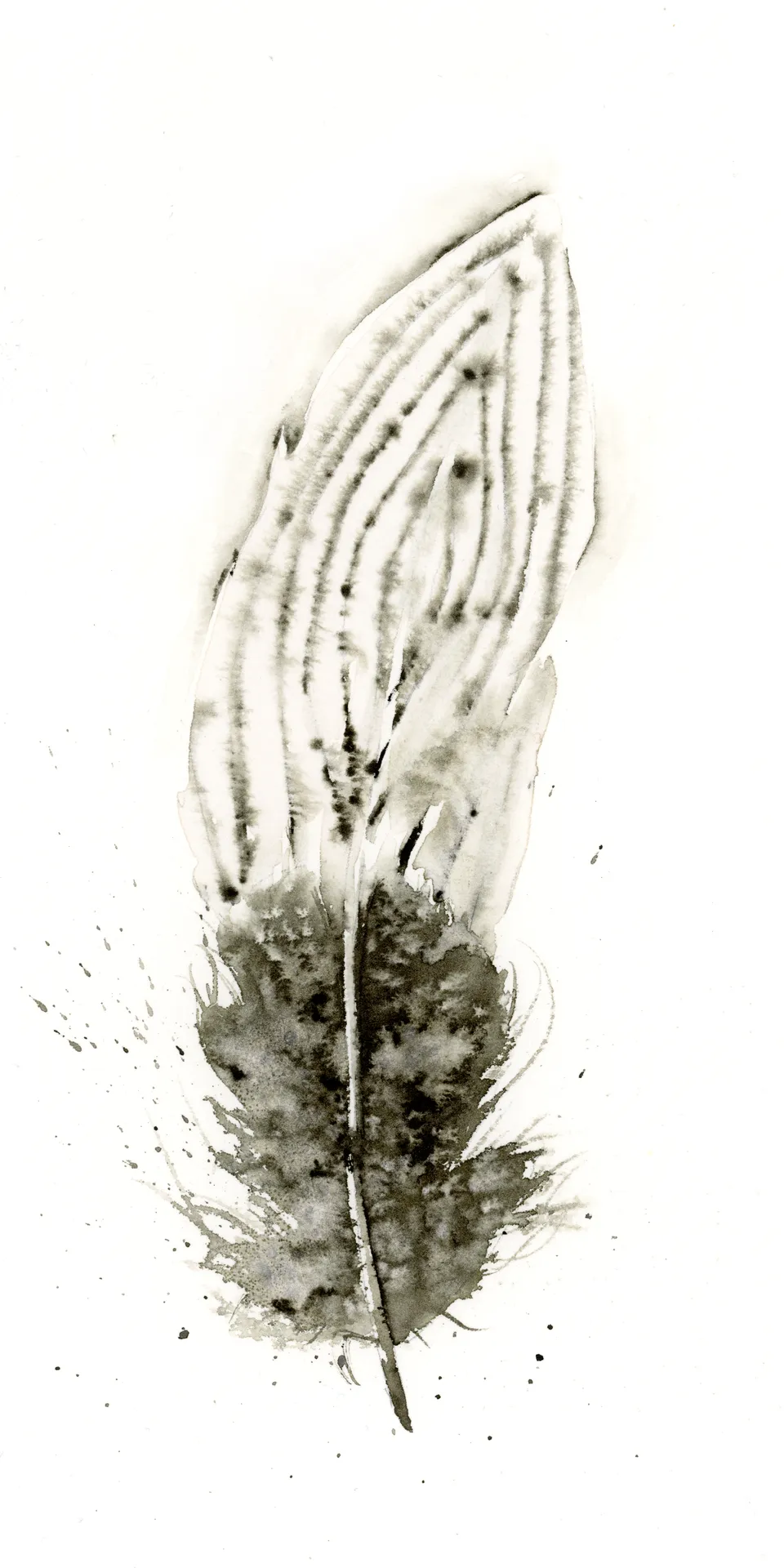 In creating this painting, I chose a monochromatic palette of soft blacks and grays, allowing the gentle transitions and delicate feather details to breathe. The subtle brushstrokes and careful layering bring the feather to life, with splatters and drips giving it texture and movement. I feel that these elements guide the viewer's eye naturally, offering a sense of calm and steady assurance. — Shayna, February 2024