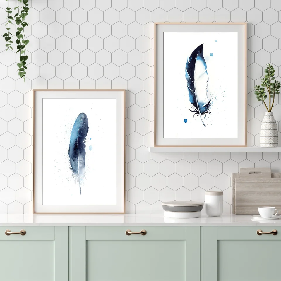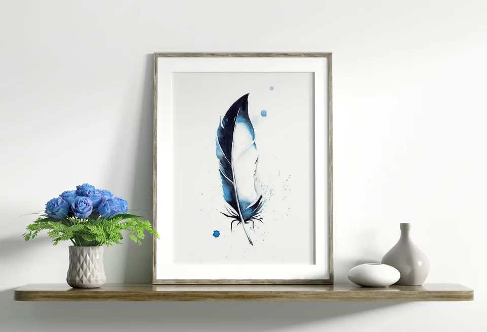 I carefully chose a palette of deep blues and crisp whites to create a soothing balance, allowing the feather to stand out boldly against the simplicity of the background. With each brushstroke, I focused on gentle transitions and soft blending to capture the delicate nature of feathers, while the splatters and drips add a spontaneous energy that invites viewers to pause and connect. As I painted, I felt a deep sense of calm, knowing my intuitive approach would resonate with anyone seeking a moment of quiet reflection. — Shayna, March 2024