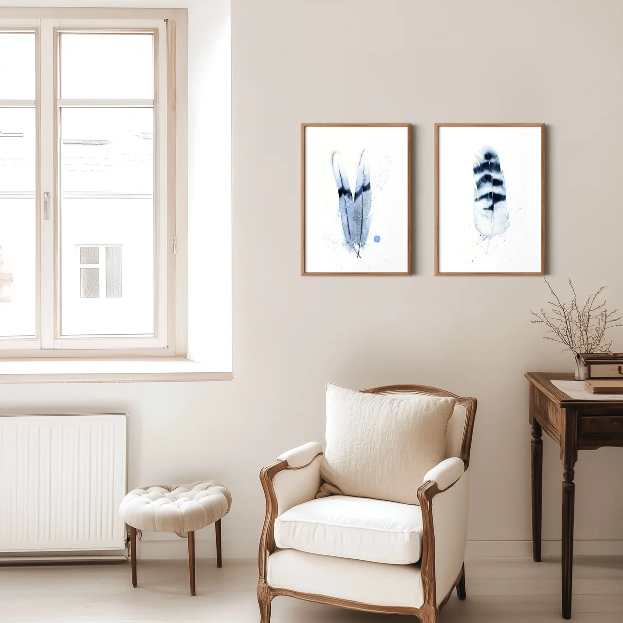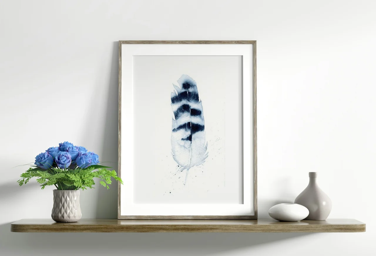 I began this piece with deep indigo hues, allowing them to flow naturally into softer, lighter shades, creating a delicate transition that mirrors the fluidity of life’s journey. My brushstrokes are deliberately gentle yet assertive, capturing the intricate pattern of a feather—a symbol of resilience and potential. With subtle splatters and soft edges, I aimed to convey a sense of rising above challenges, much like the feather’s graceful, upward movement, representing strength and new beginnings. — Shayna, December 2022