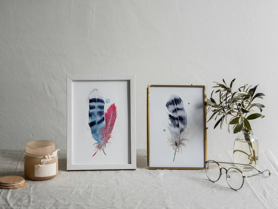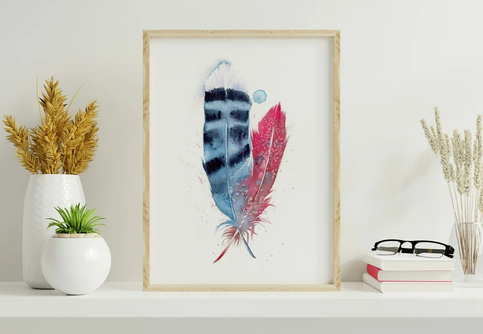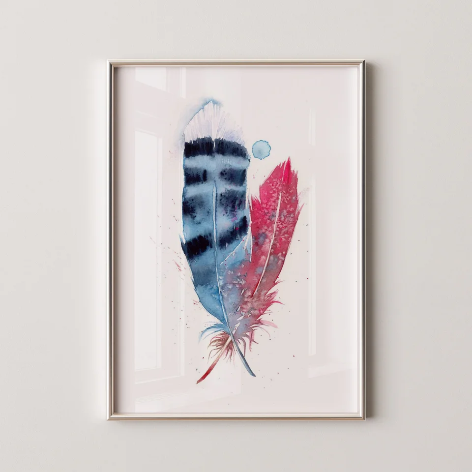 In creating this painting, I focused on the contrasting yet harmonious blend of vibrant red and calm blue, using watercolors with a soft touch to allow these colors to bleed gently into one another. The feathery strokes capture delicate movement and the interplay of light and shadow, while the splatters and drips add a bold, unexpected layer of texture. As I painted, I imagined the feathers as symbols of strength, unyielding in their presence yet graceful in their form, reflecting a quiet determination that speaks to the heart. — Shayna, April 2024