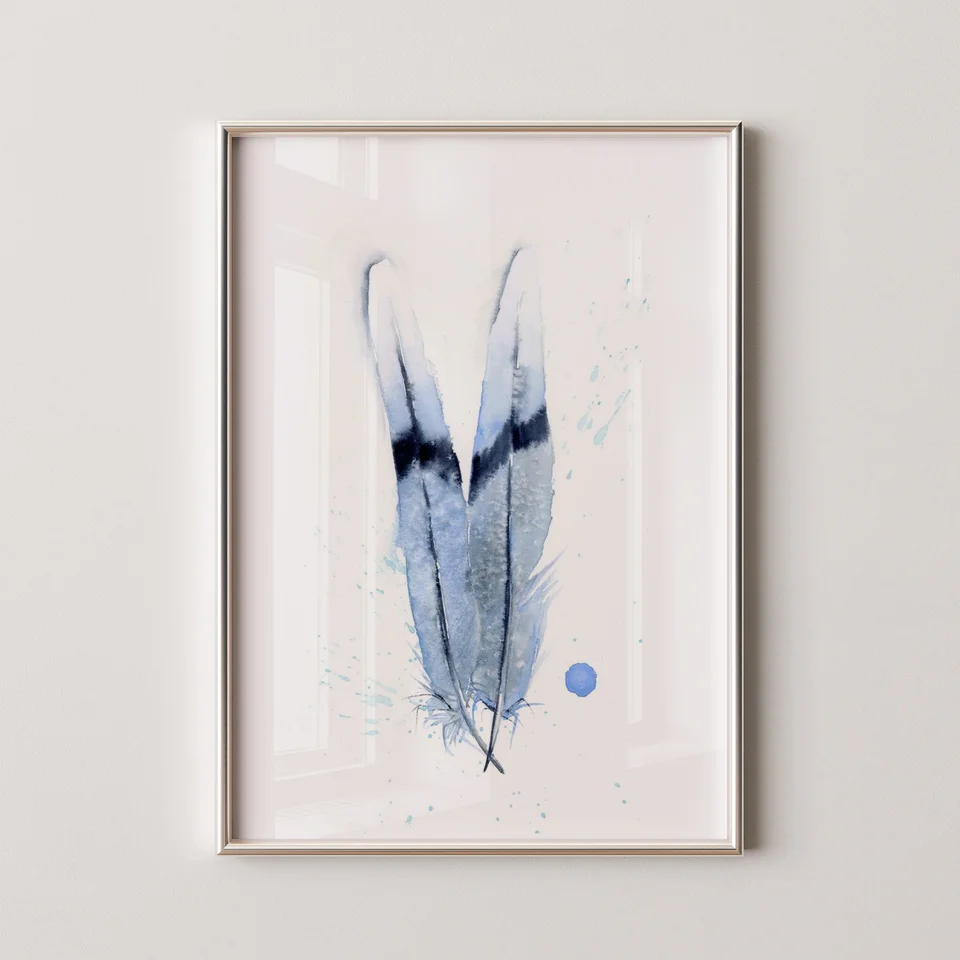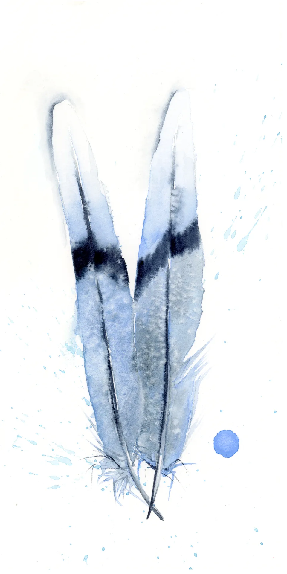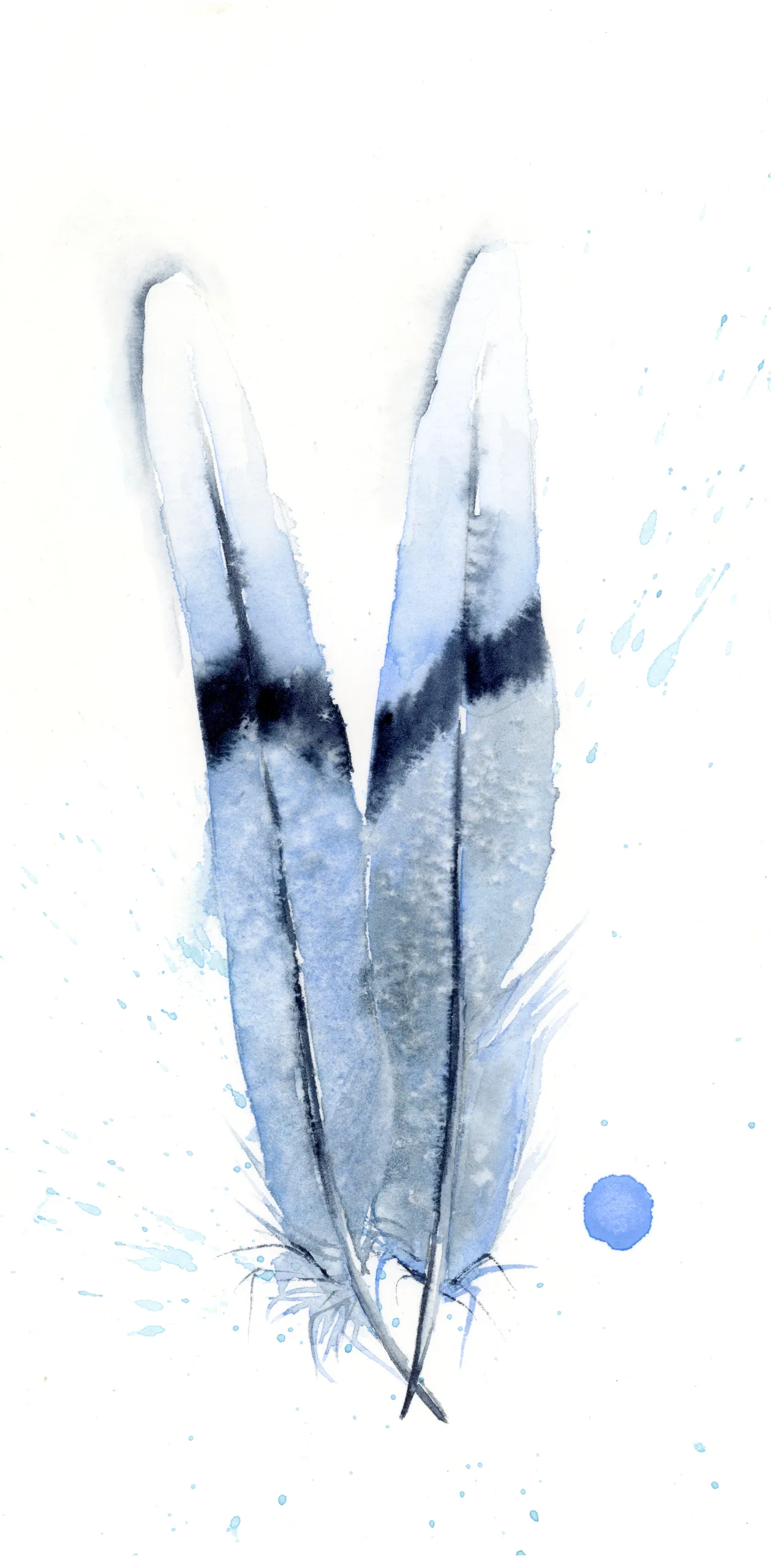 In this painting, I gently layered shades of soft blue and hints of gray using precise brushstrokes to create the delicate look of feathers. The subtle transitions between colors highlight their airy, free nature, while the deeper shades lend strength and depth. As I added splatters and drips around the edges, I wanted to show the unexpected beauty in life's imperfect moments and the quiet strength that arises from embracing them. — Shayna, April 2024