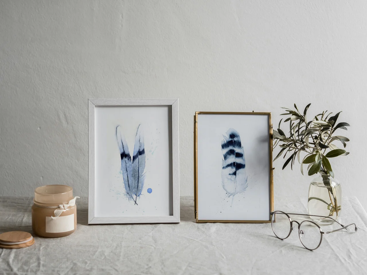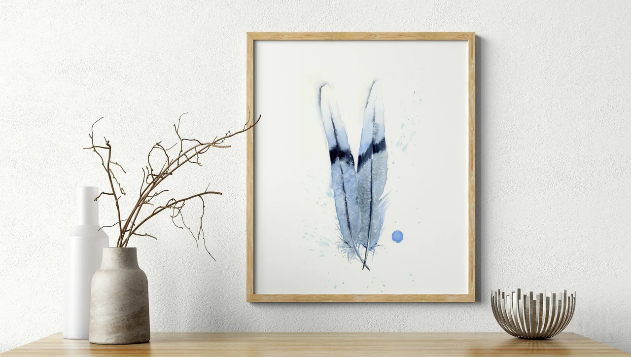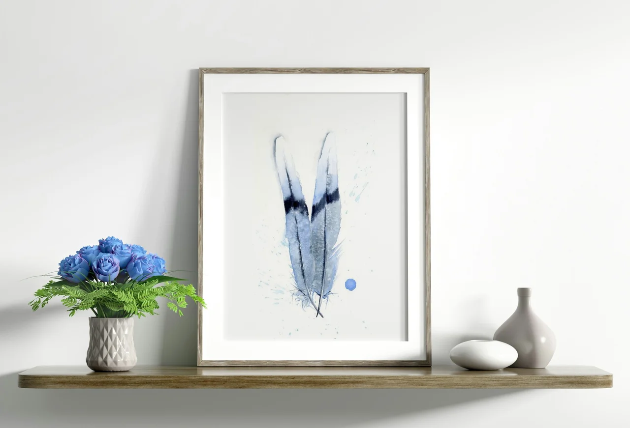 In this painting, I gently layered shades of soft blue and hints of gray using precise brushstrokes to create the delicate look of feathers. The subtle transitions between colors highlight their airy, free nature, while the deeper shades lend strength and depth. As I added splatters and drips around the edges, I wanted to show the unexpected beauty in life's imperfect moments and the quiet strength that arises from embracing them. — Shayna, April 2024