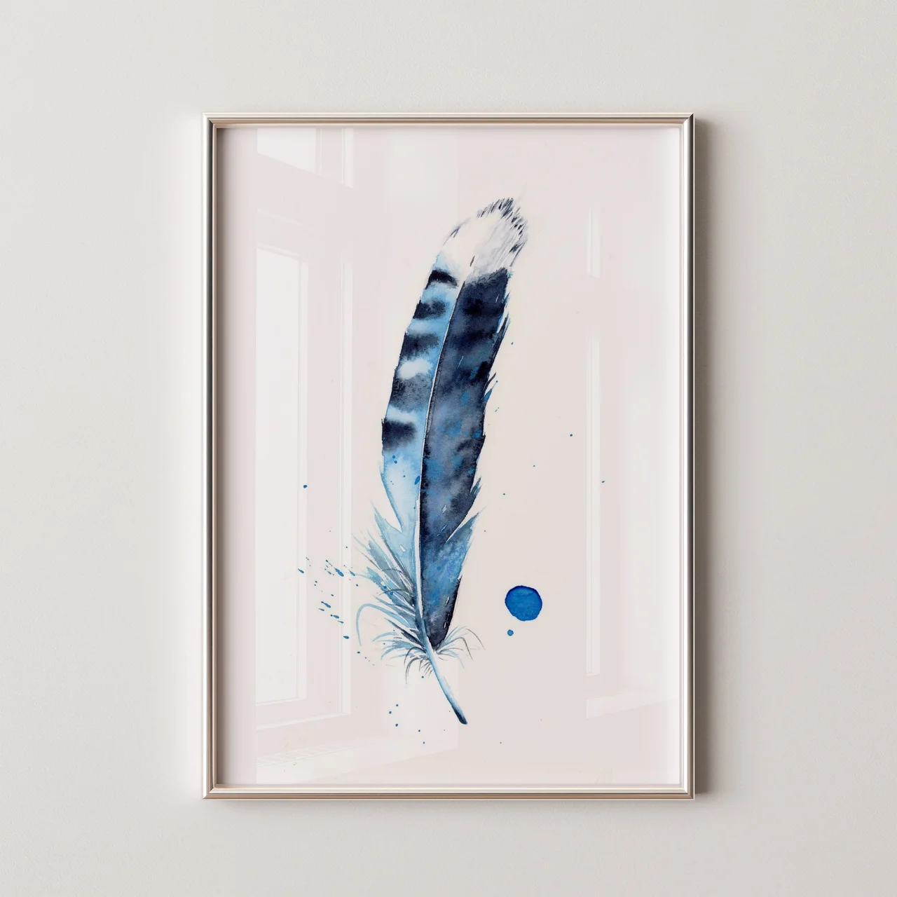 I chose deep blues and soft grays to capture the delicate nature of this feather, using watercolors to create gentle transitions and flowing shapes. I let the colors bleed into each other naturally, highlighting the feather's softness and grace. The splatters and drips add a touch of spontaneity, embodying a sense of freedom and resilience that speaks to something deeper within us all. — Shayna, April 2024