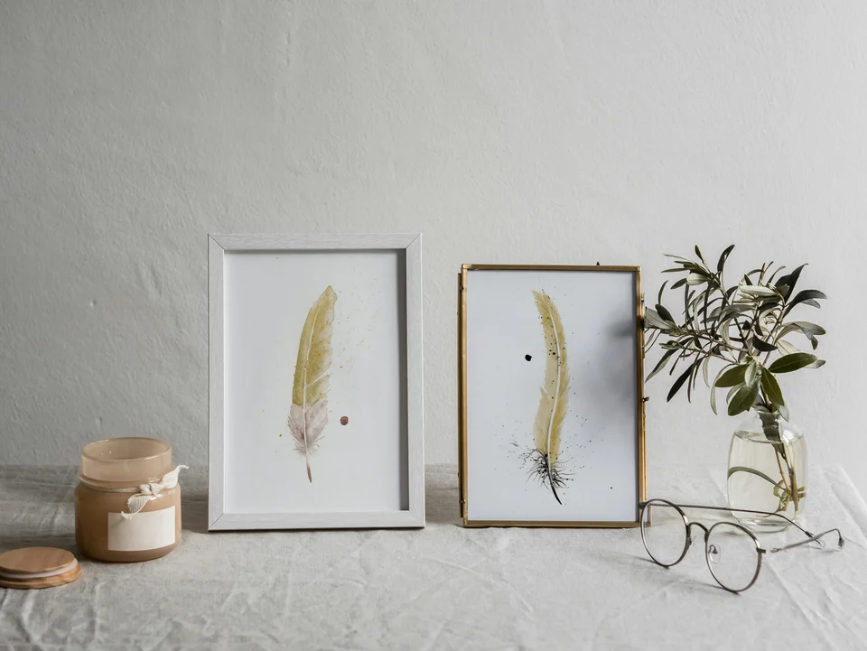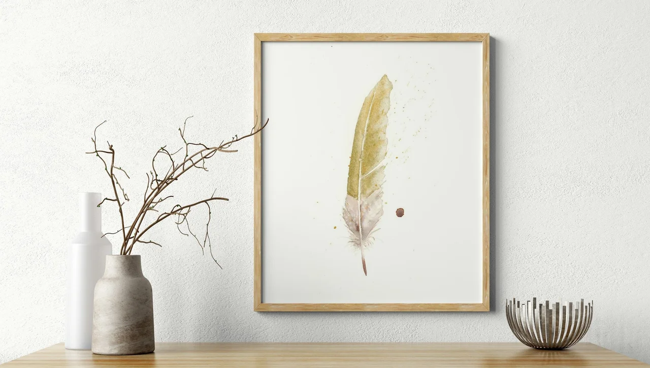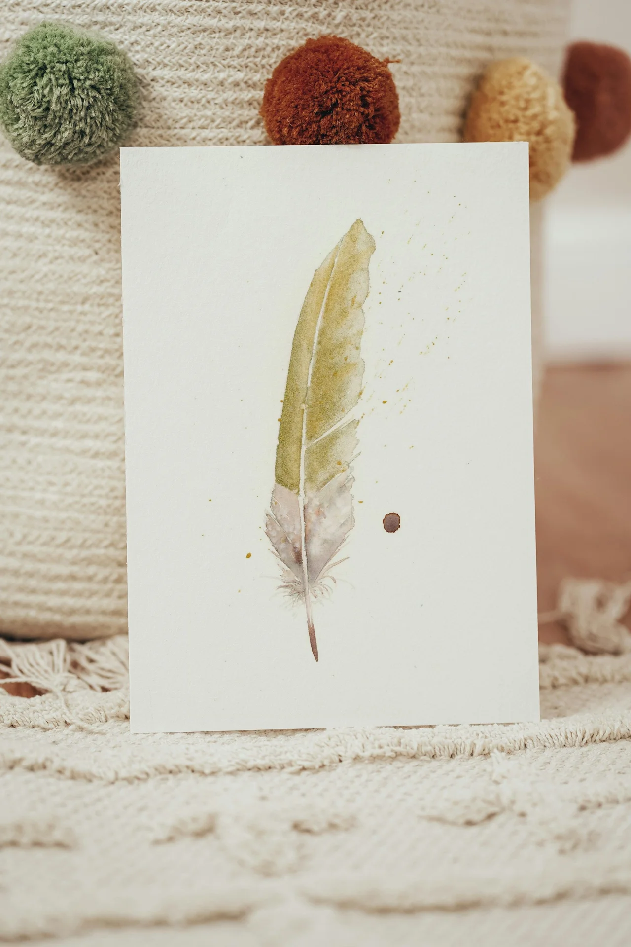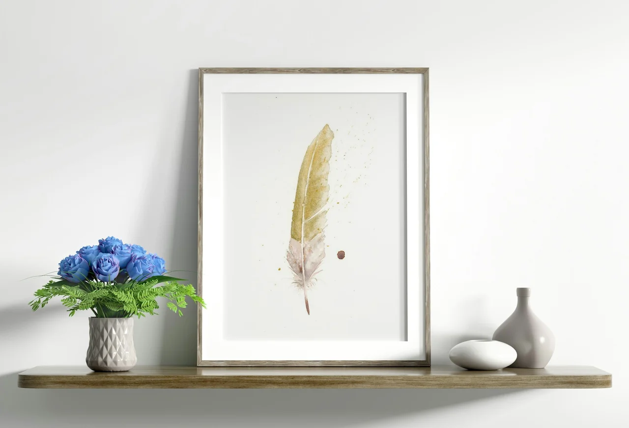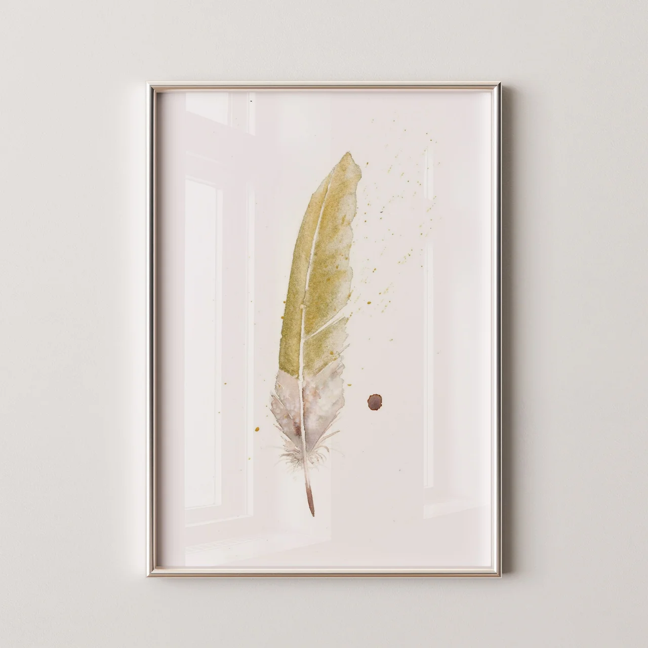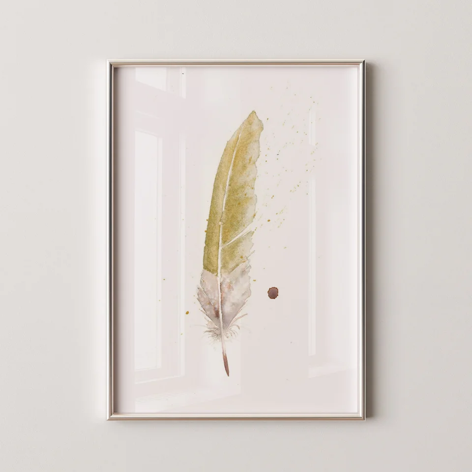 In painting this delicate feather, I focused on capturing its lightness and complexity through soft earth tones that gently blend from warm brown to muted olive. I used a wet-on-wet watercolor technique to create smooth transitions and subtle textures, allowing the feather to feel both grounded and ethereal. The splatters and slight drips around it suggest a gentle release or a whisper of movement, inviting a sense of new beginnings and understanding. — Shayna, April 2024