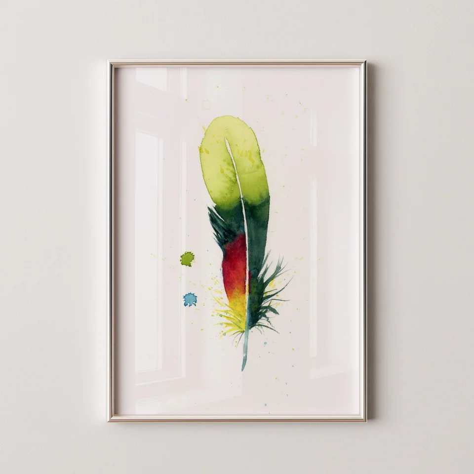 I chose vibrant greens, deep blues, and rich reds to breathe life into the feather, with colors blending smoothly into one another like nature's own transitions. The gentle flow of my brushstrokes creates a sense of movement, while the splatters… read more
