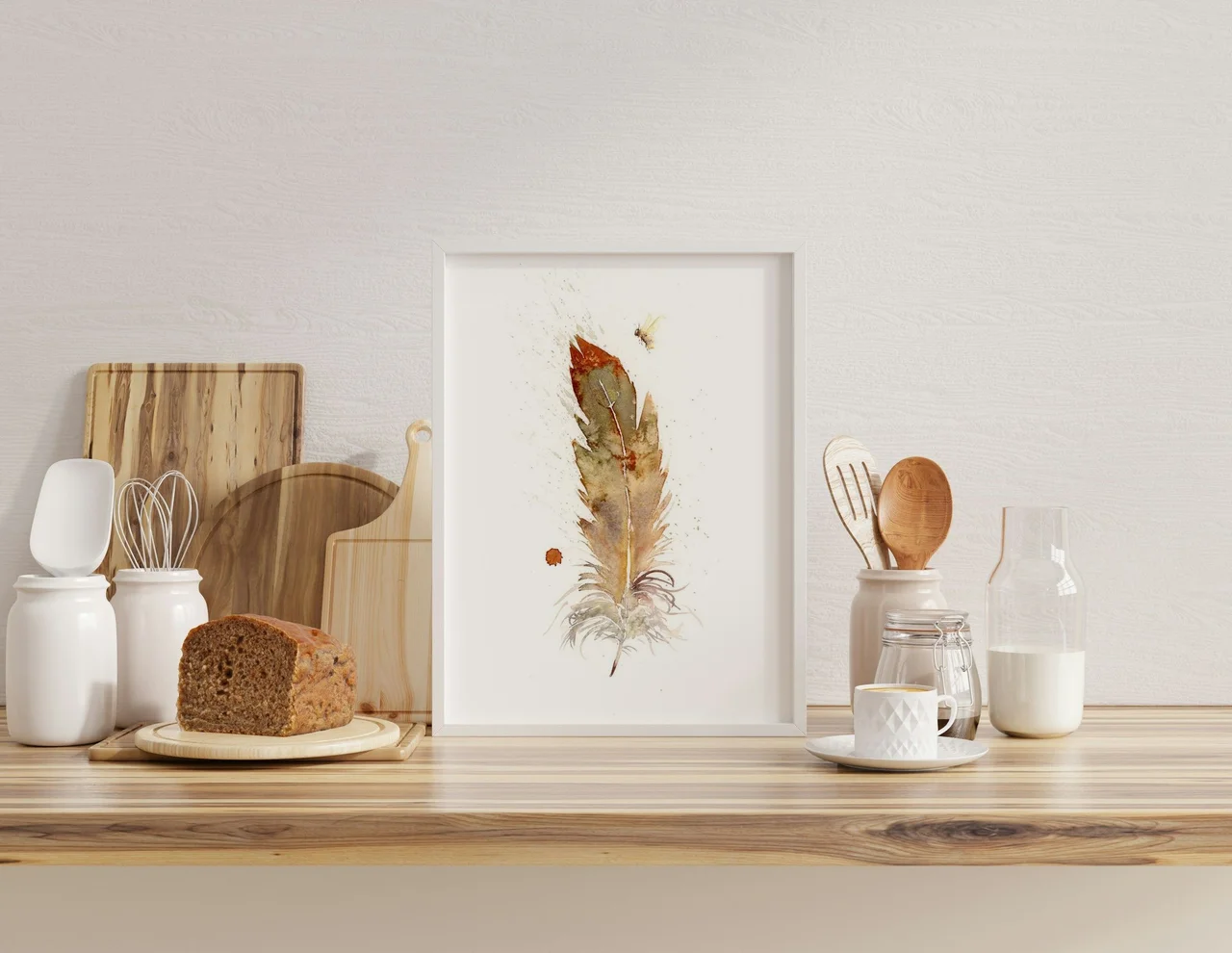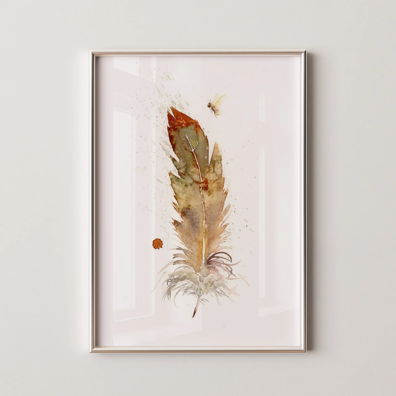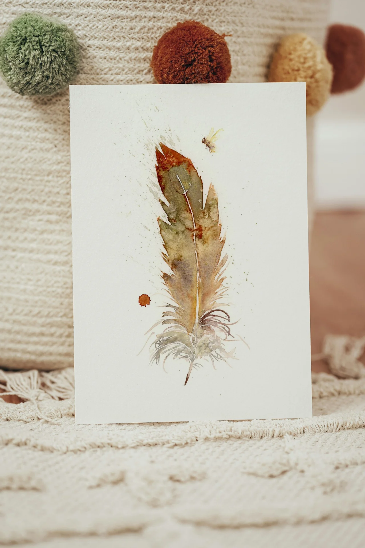 I used soft earth tones like burnt sienna and olive to create a warm, comforting feel in this piece. My brushstrokes are delicate yet intentional, allowing the feather to gently unfold against the canvas, while subtle splatters and wisps speak to its fragility. Each transition from deep hues to lighter shades holds a story, reminding us of nature's whispers in the quiet moments of our lives. — Shayna, May 2024