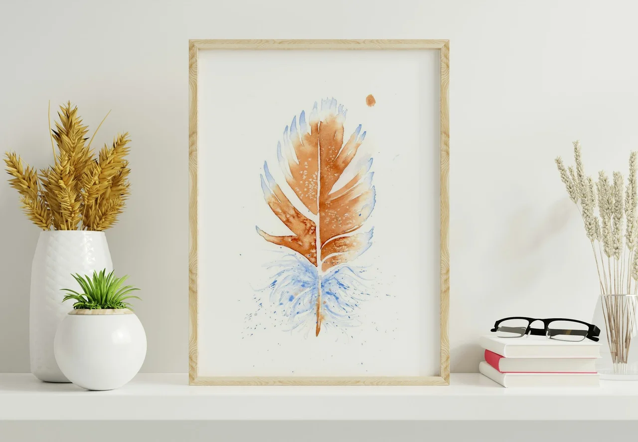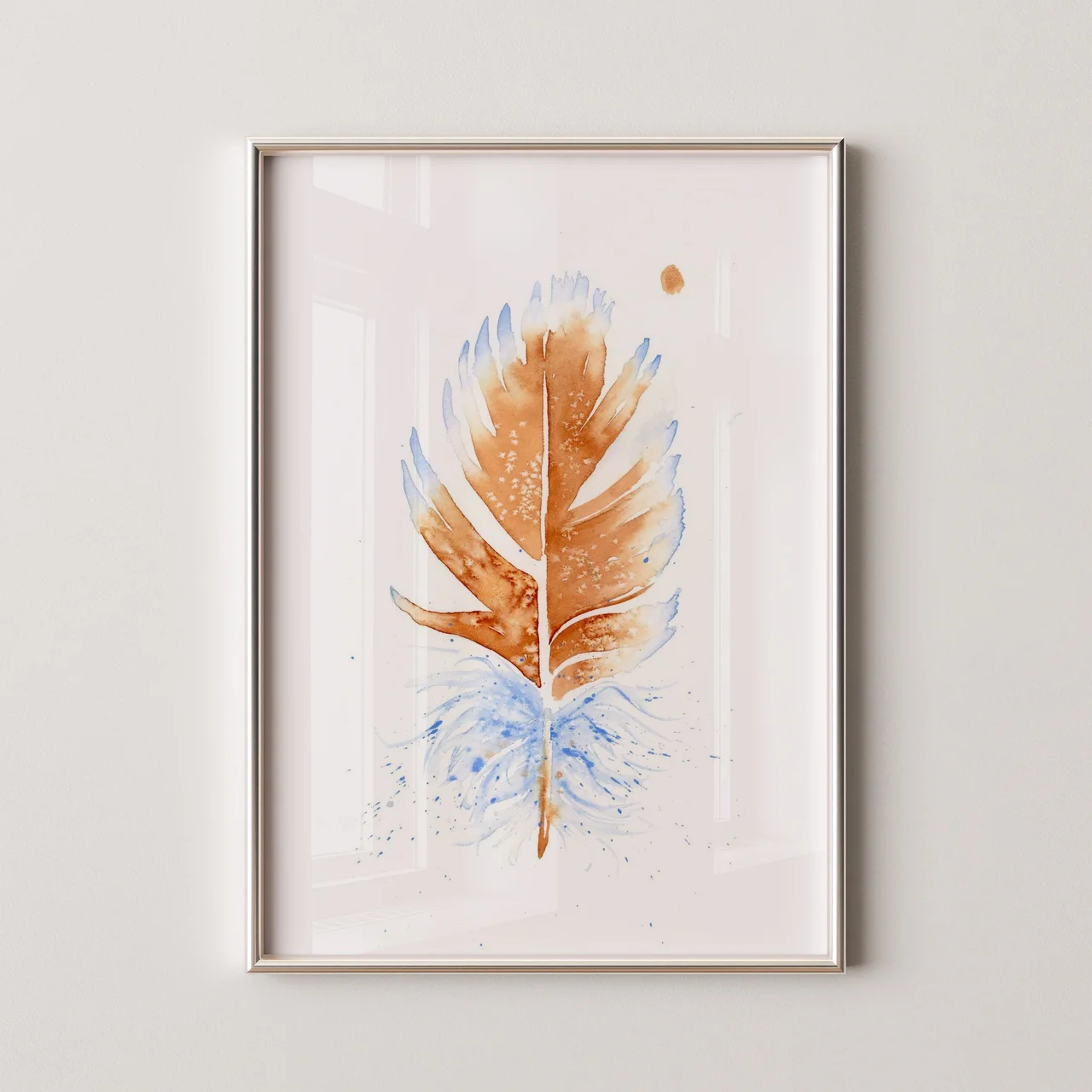 In this piece, I used a warm, earthy brown pigment called Rocky Mountain #6, which I crafted by hand, complemented by soft blues to create a delicate feather-like form. I applied gentle brushstrokes to convey a sense of grace and strength, with subtle transitions and soft edges that blend seamlessly. The subtle splatters and drips add a spontaneous energy, symbolizing the unwavering spirit that dances through life's challenges. — Shayna, August 2024