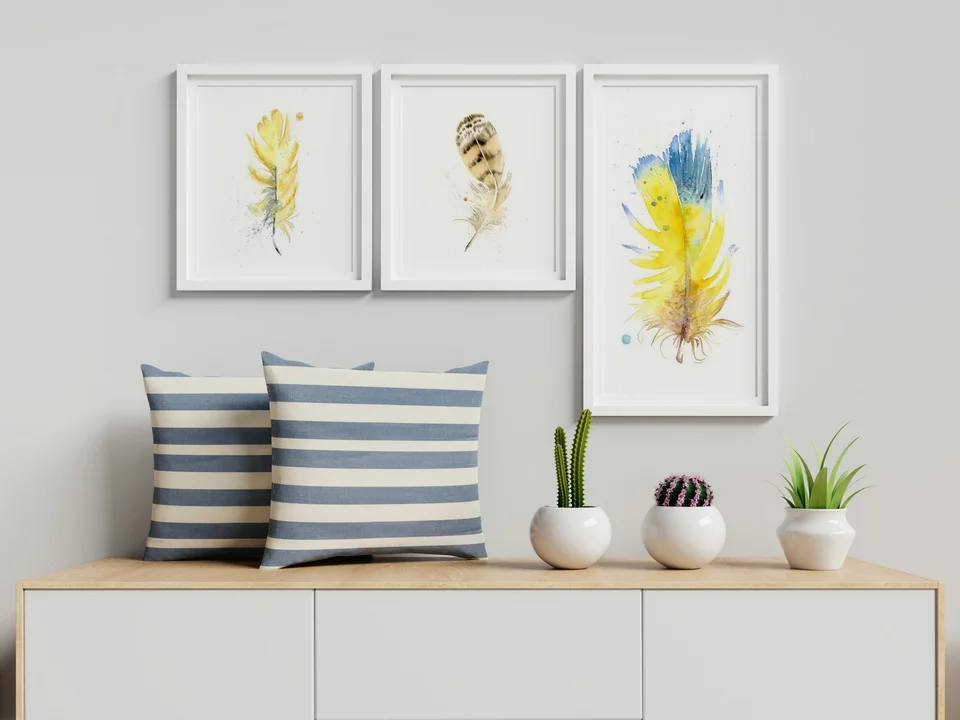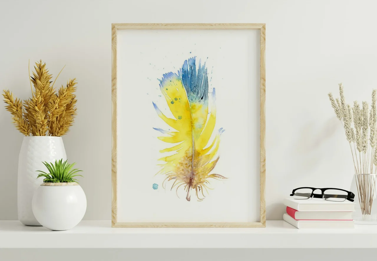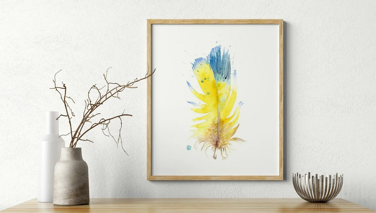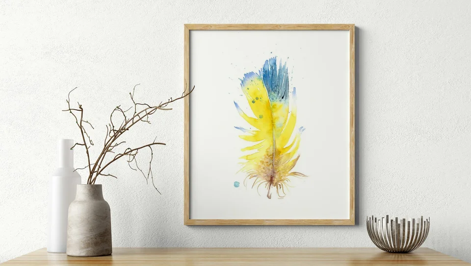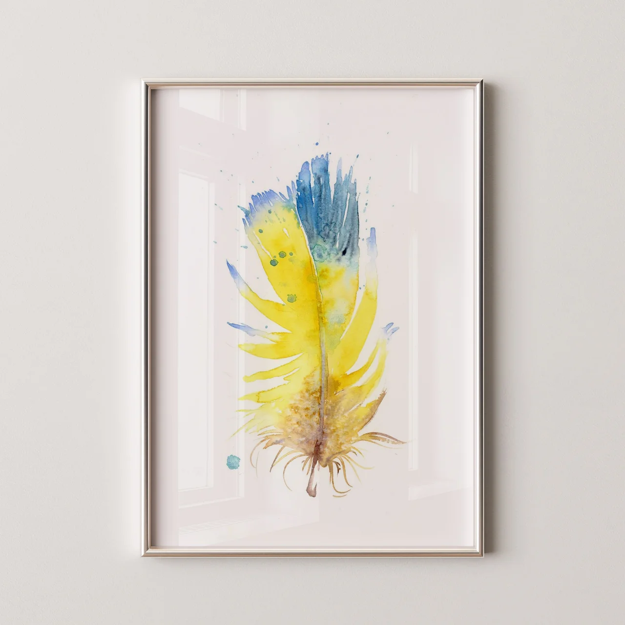 In this piece, I played with the delightful contrast of vibrant yellows and deep blues, letting them mingle softly across the paper. The transitions are gentle and flowing, with a few playful splatters and drips that add character. Using delicate brushstrokes, I aimed to capture the feather's natural grace and subtle movement, inviting you to feel a sense of warmth and kinship with its gentle elegance. — Shayna, August 2024