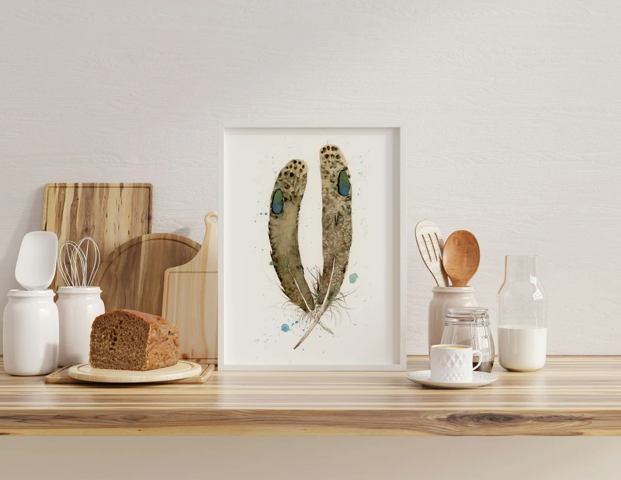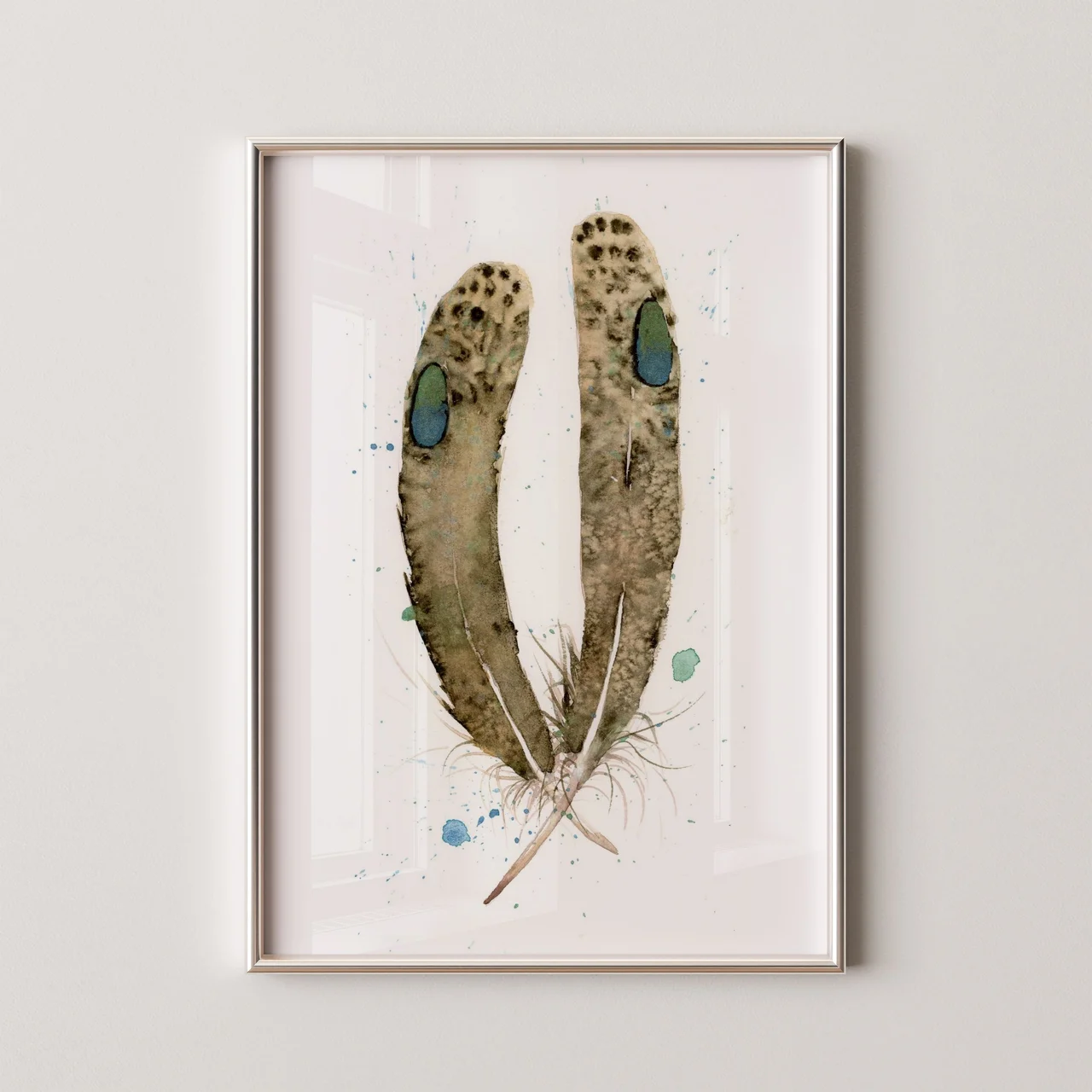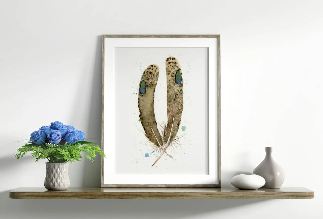 In creating this piece, I focused on the gentle earth tones of browns and greens, bringing a naturally calming presence. The feathers rise with careful transitions from light to dark, accented by splatters of blue and green that add life… read more
