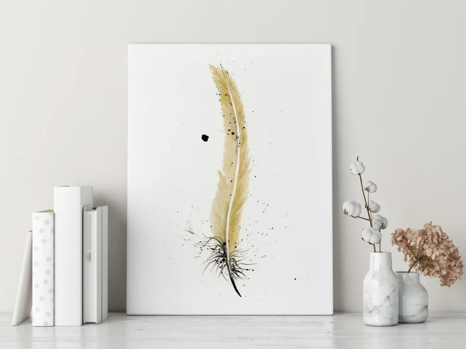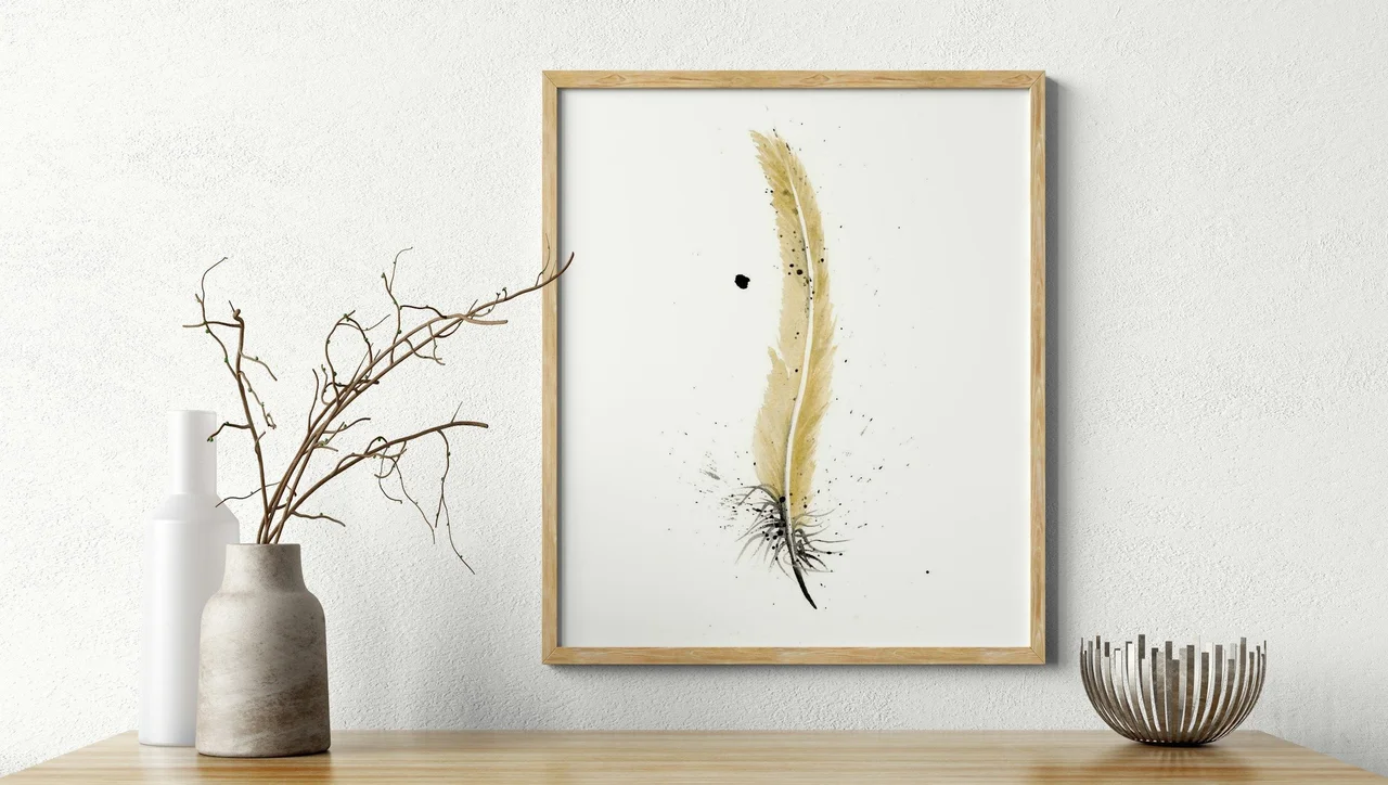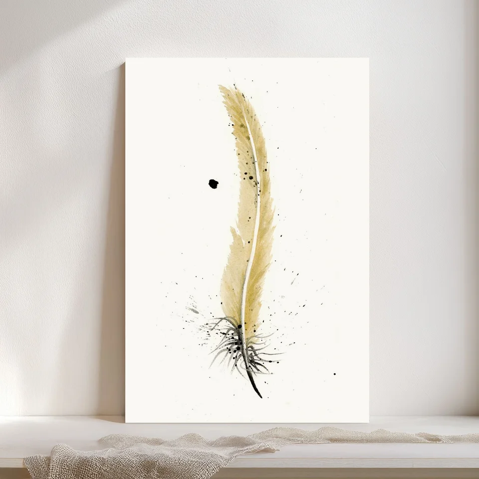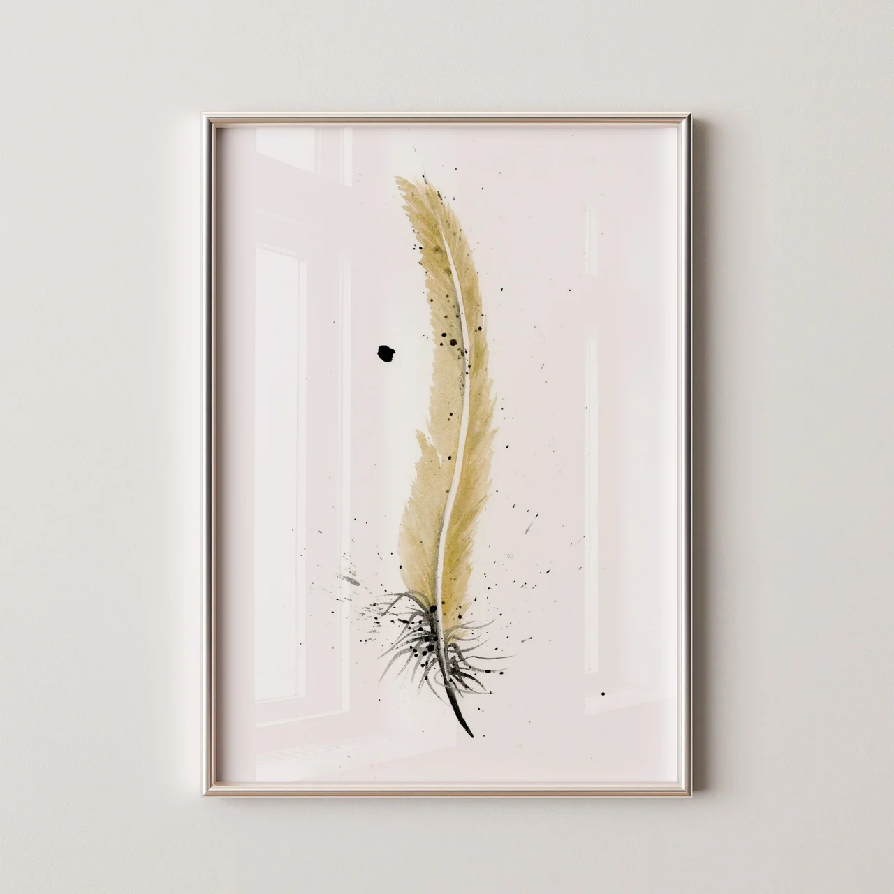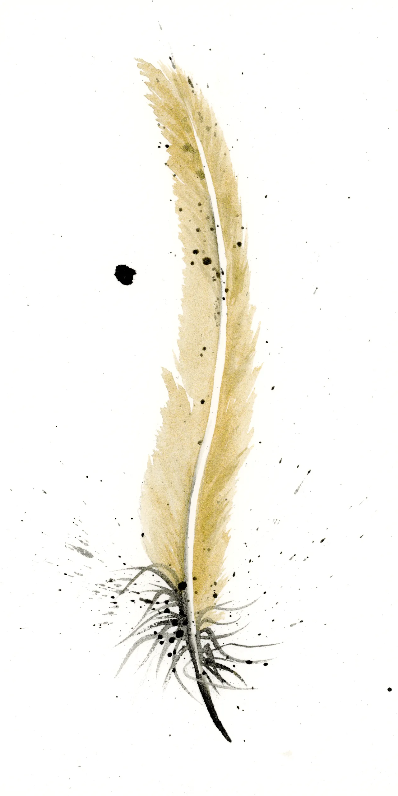 In this piece, I used hand-made pigment Marshall Fire #1 to create warm, earthy tones, alive with rich, organic depth. The gentle transition from the soft, creamy edges to the bold, delicate splatters reflects a seamless journey. My brushstrokes are intentionally fluid, allowing the feather's form to dance upward, revealing a quiet strength and a soft determination that feels like a whisper growing into a confident song. — Shayna, September 2024