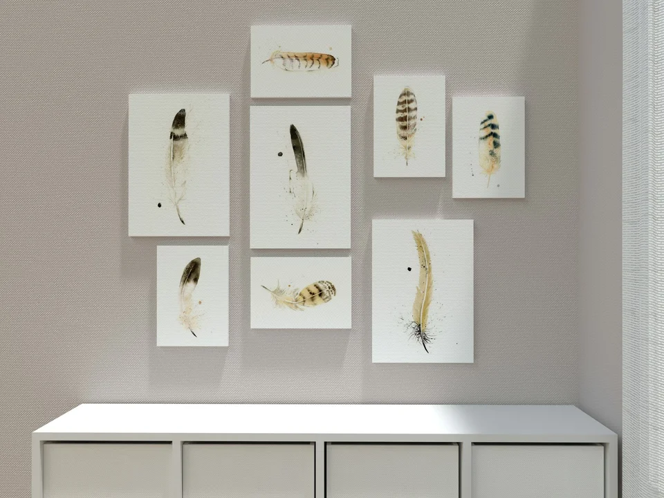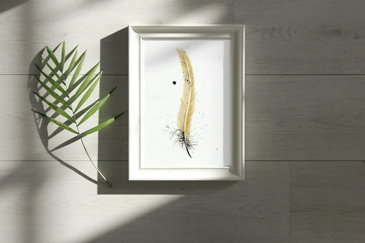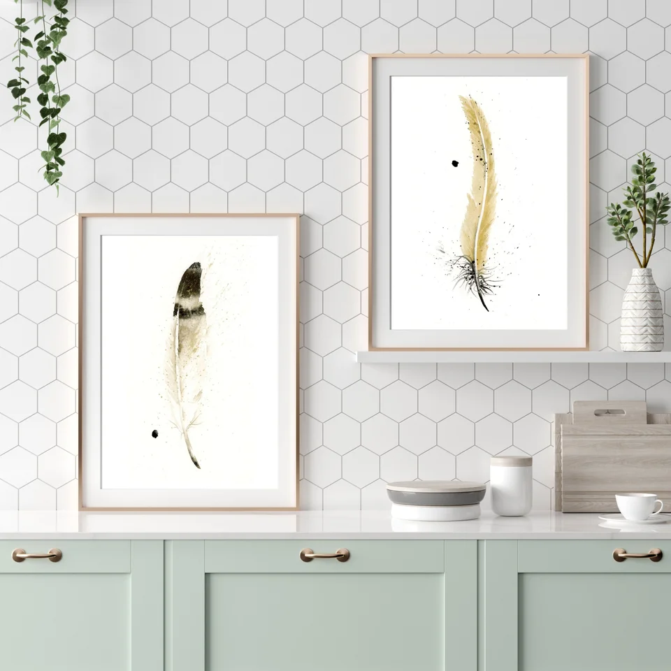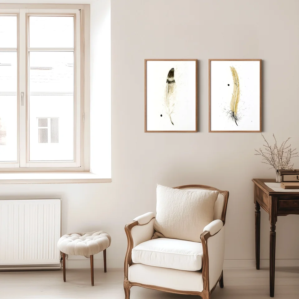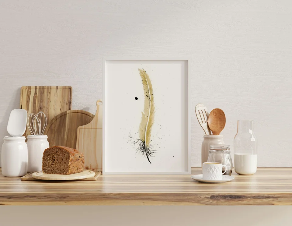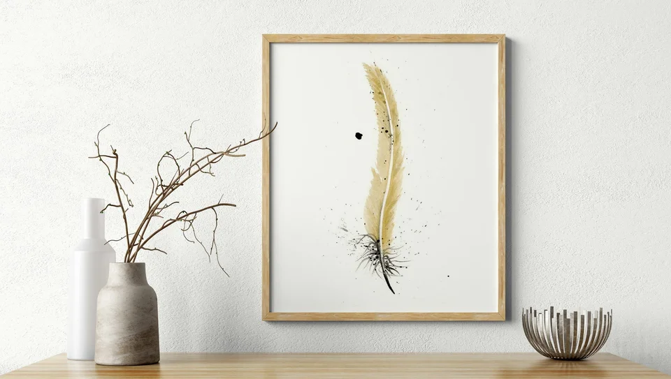 In this piece, I used hand-made pigment Marshall Fire #1 to create warm, earthy tones, alive with rich, organic depth. The gentle transition from the soft, creamy edges to the bold, delicate splatters reflects a seamless journey. My brushstrokes are intentionally fluid, allowing the feather's form to dance upward, revealing a quiet strength and a soft determination that feels like a whisper growing into a confident song. — Shayna, September 2024