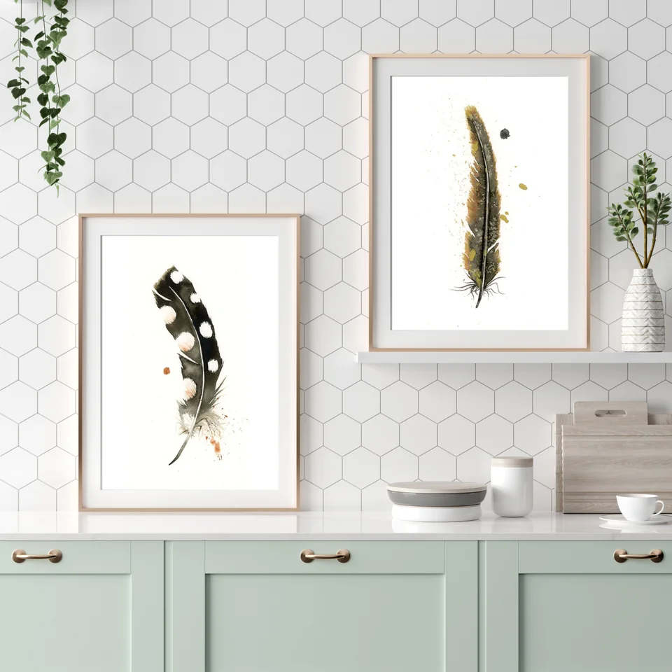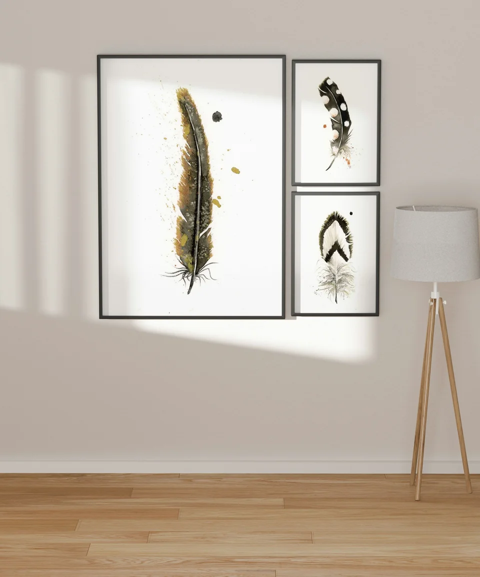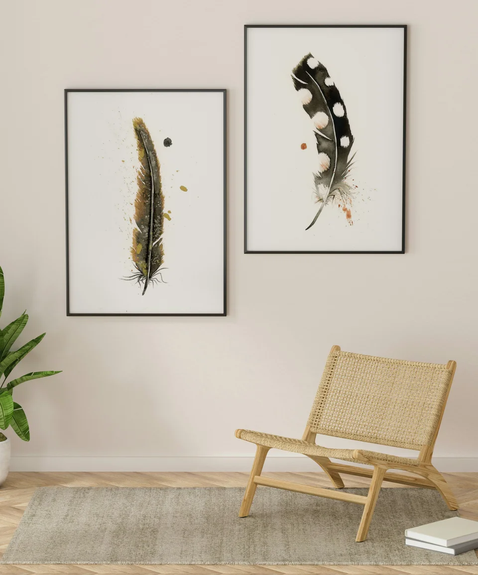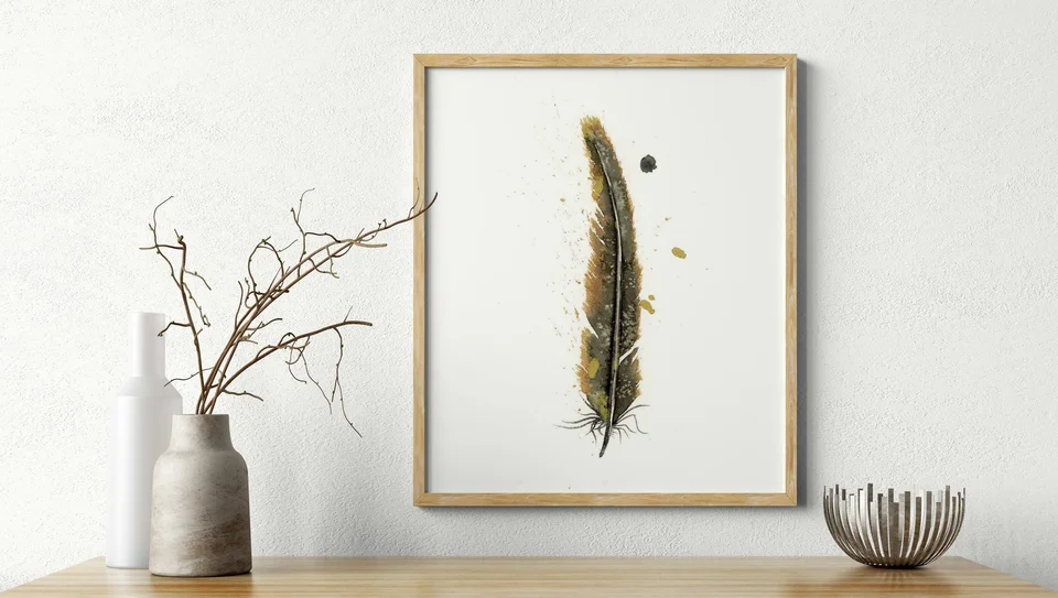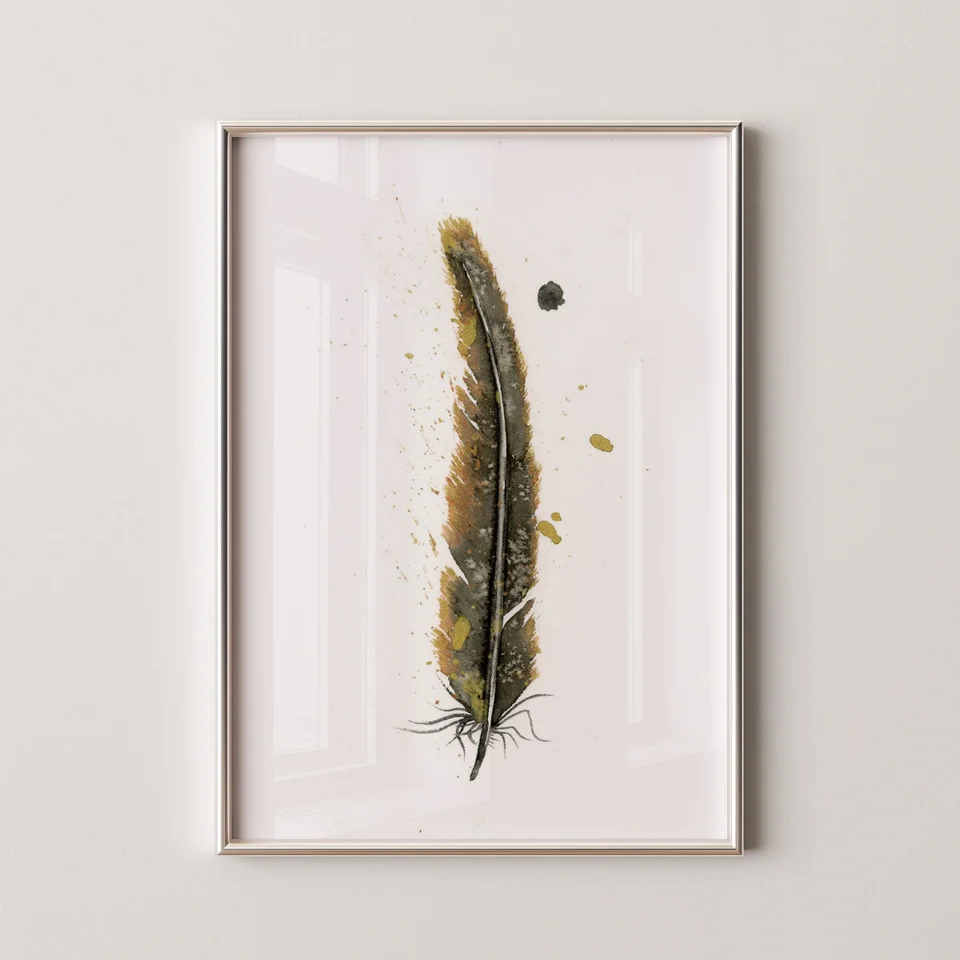 I carefully layered the earthy tones of handmade pigment Marshall Fire #1 to capture the soft intricacy of a single feather. The feather's dark spine contrasts with the softer edges where color gently fades, while subtle splatters and drips add spontaneity. As I painted, I felt a quiet rhythm emerge, the gentle flow and texture naturally creating that inner calm I love to share. — Shayna, September 2024