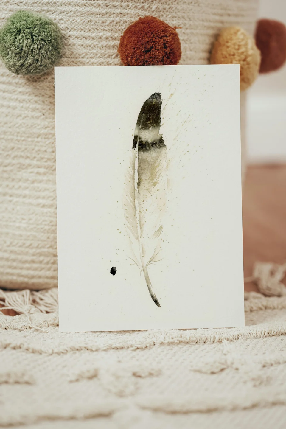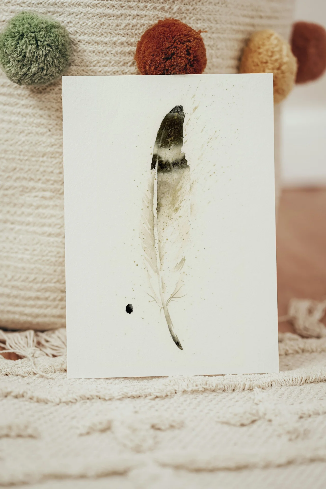 I chose to paint this feather using a delicate palette of earthy and muted tones, infused with my hand-made pigment, Marshall Fire #1. The gentle layering and soft transitions create a sense of movement, as if the feather could take flight at any moment, reminding us of the strength we carry within ourselves. Through the subtle brushstrokes and splatters, I aimed to capture a balance of grace and resilience that resonates deeply and personally with me. — Shayna, October 2024