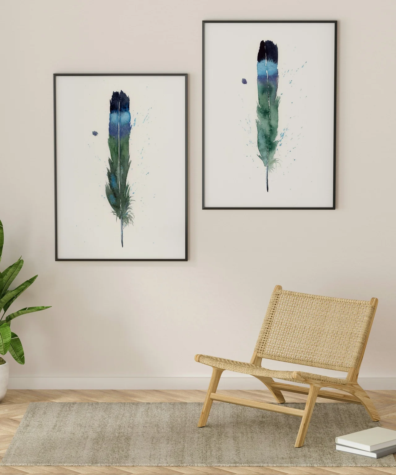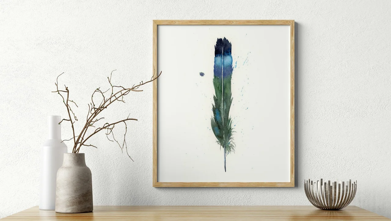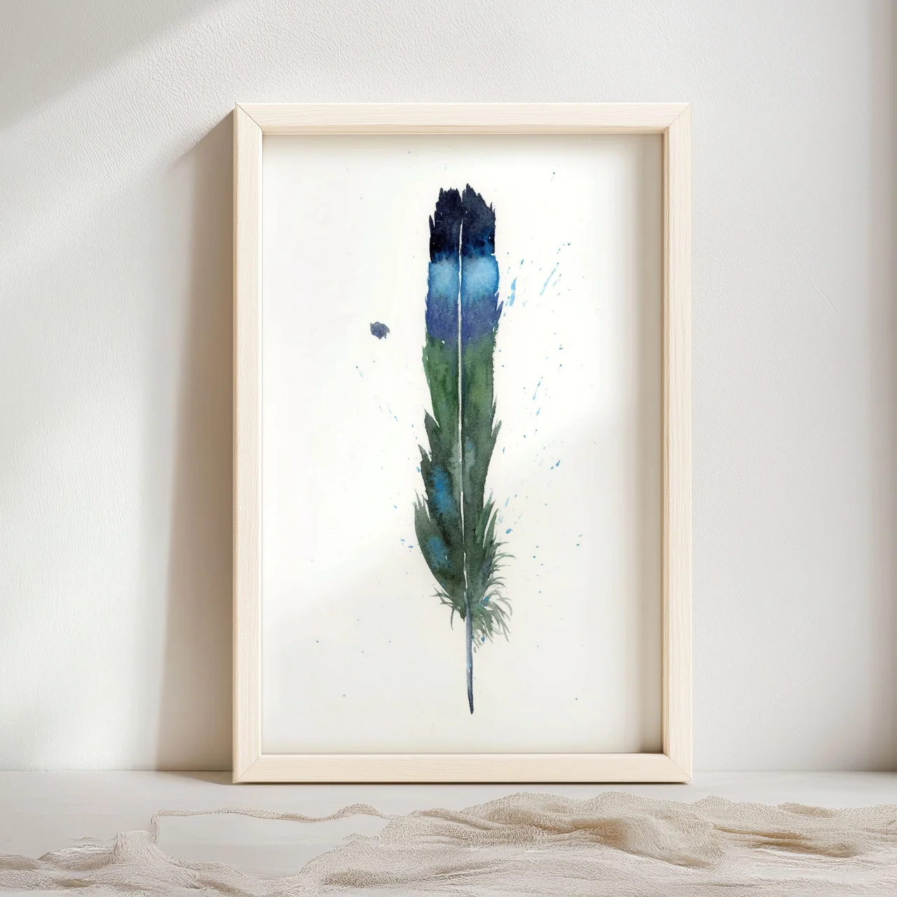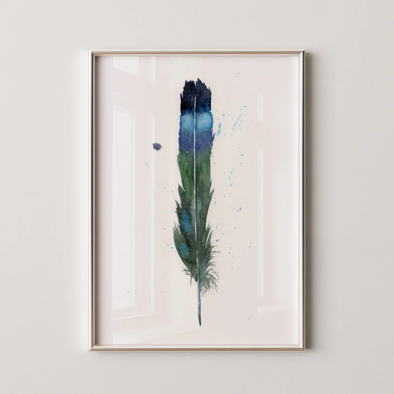 In this painting, I used deep blues and soft greens to create gentle transitions that flow together effortlessly. My brushstrokes are light and intentional, capturing the delicate movement and intricate details of the feather, while the subtle splatters surrounding it… read more