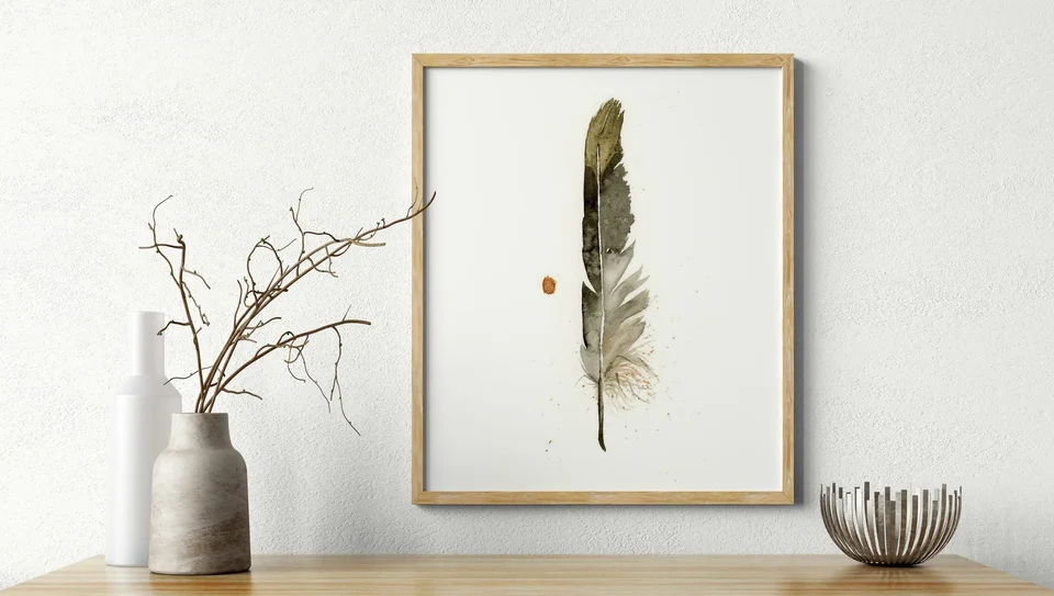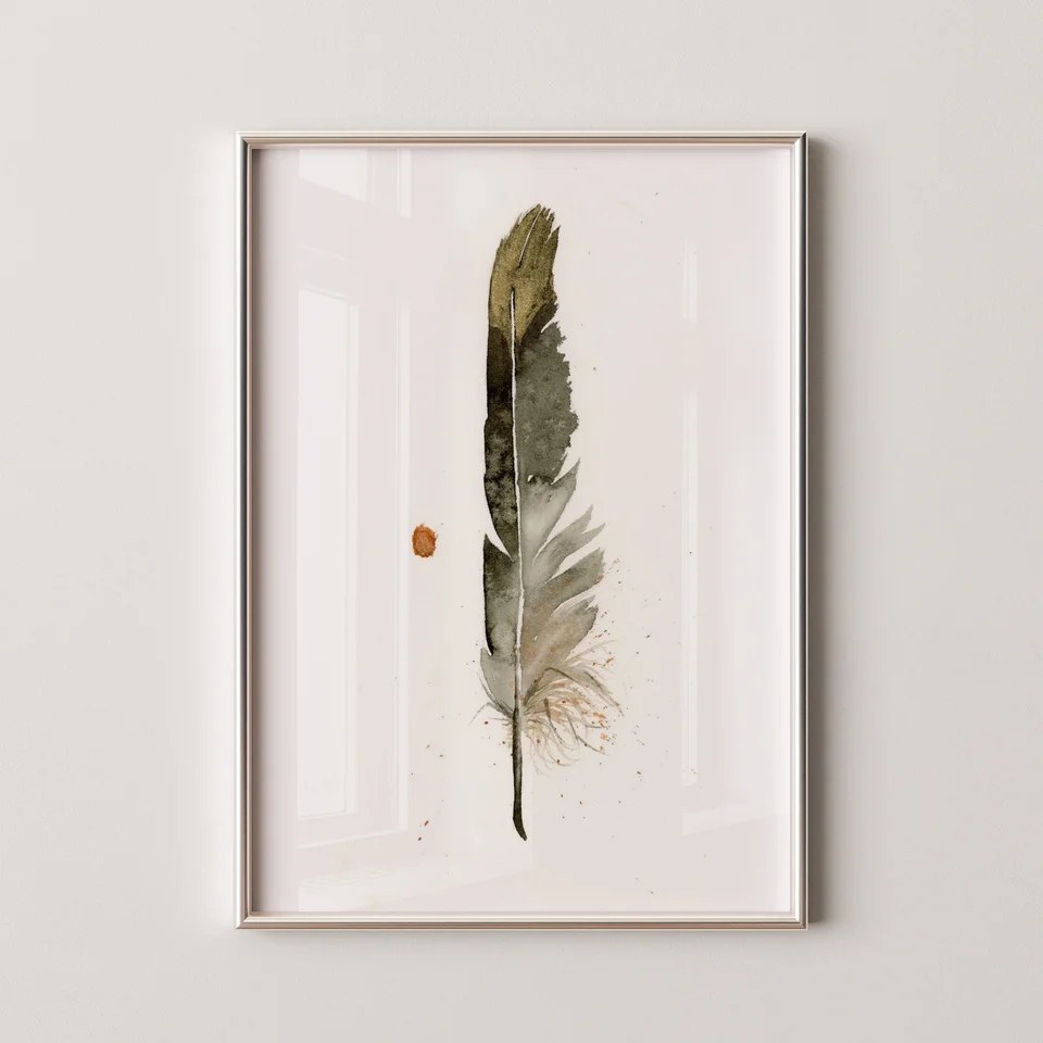I chose a subtle and earthy palette for this piece, including my hand-made pigment Rocky Mountain #6. The gentle transitions and delicate layers bring a softness to the feather, allowing the simple brushstrokes to capture its fragility and grace. The small, unexpected splatters and precise details invite you to pause and find meaning in the present moment, almost like a quiet whisper of the natural world around us. — Shayna, October 2024