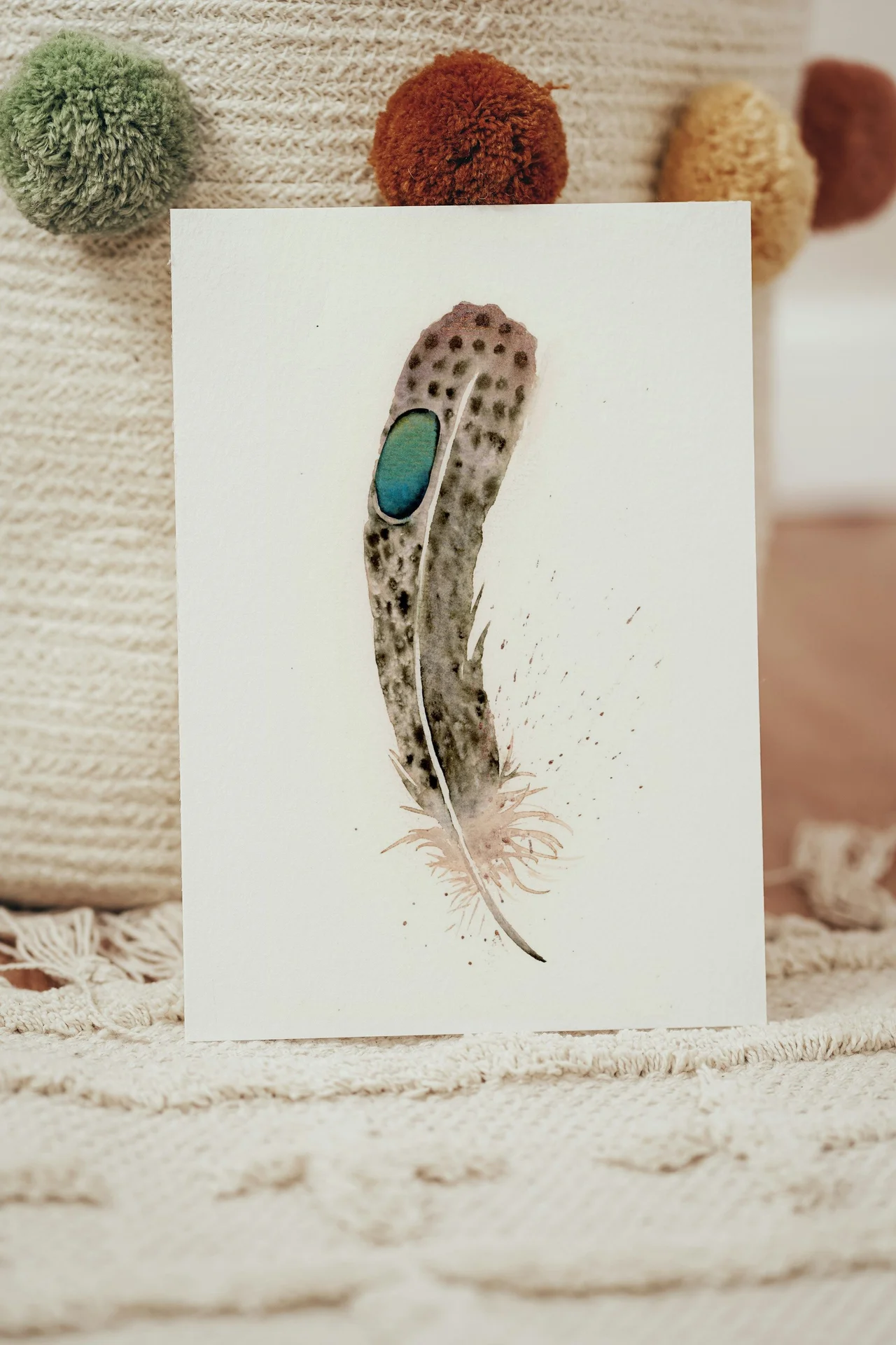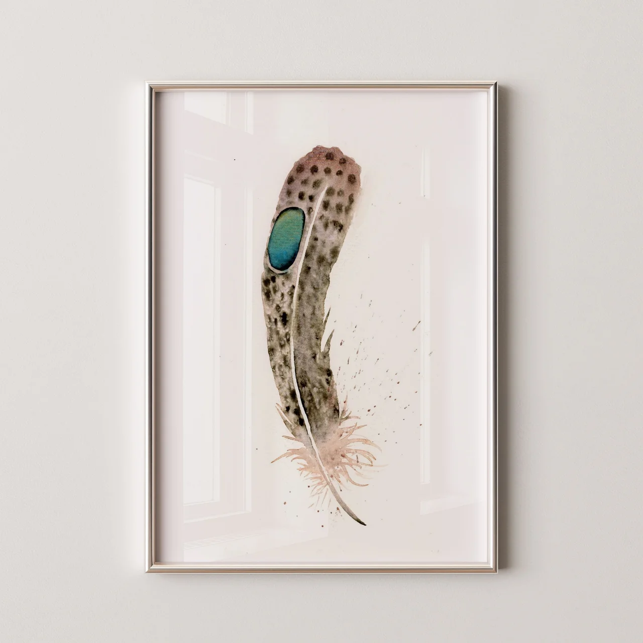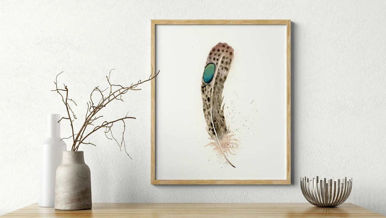 In this painting, I used a palette of soft browns and grays to capture the delicate nature of the feather, contrasted with a vibrant blue for the eye. The gentle transitions and subtle layering highlight the feather's texture, while the splatters and drips suggest movement and life. As I painted, I wanted to encourage an intimate connection with the viewer, inviting them to reflect on the beauty and strength found in simple, everyday wonders. — Shayna, November 2024