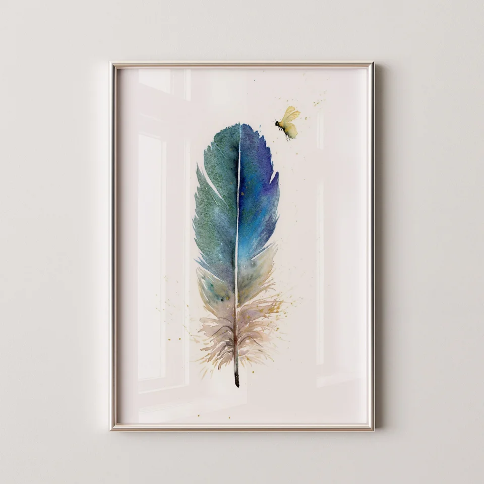 In creating this piece, I embraced the soothing blend of cool blues and warm browns to convey the delicate strength of the feather and the whimsical nature of the nearby bee. The gentle transitions and subtle layering were achieved with watercolor’s soft washes, allowing the colors to bleed into each other naturally, creating a sense of unity and stillness. My brushstrokes were careful yet fluid, capturing both the detail of each feathered strand and the playful dance of the tiny bee, inviting the observer to feel a serene sense of connection and calmness. — Shayna, November 2024