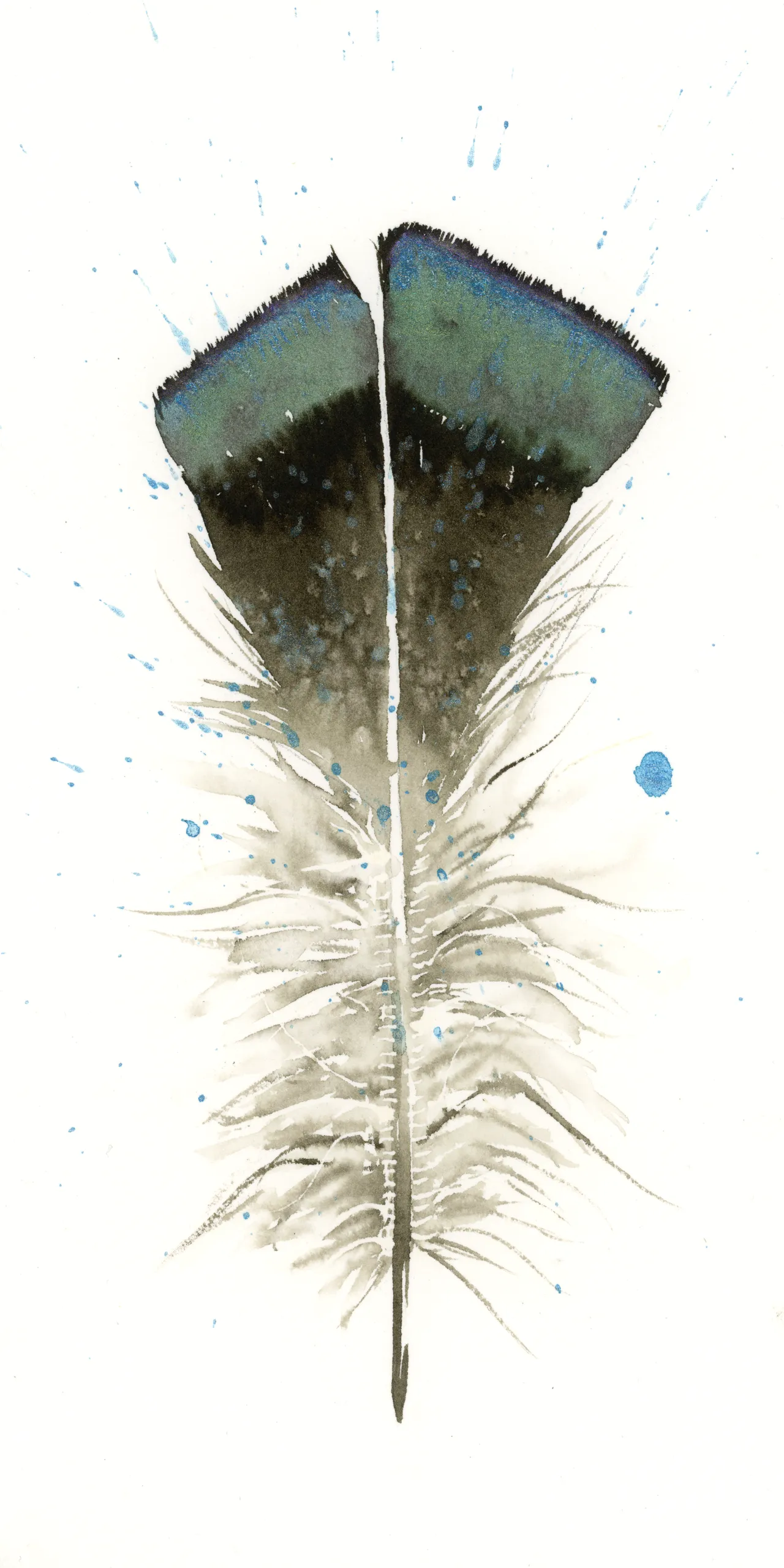 In this painting, I used soft blues and rich blacks to bring the feather to life, allowing the delicate transitions and splatters to create a sense of harmony and peace. The gentle blend of colors and subtle strokes suggest movement and growth, while the feather's airy texture is enhanced by the light splatters and drips around it. I aimed to capture the gentle embrace of nature, offering a reminder of comfort and connection. — Shayna, November 2024