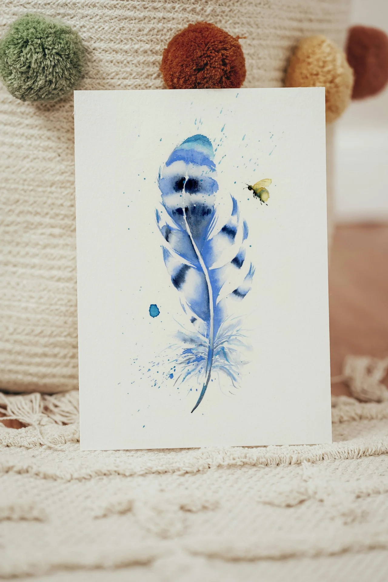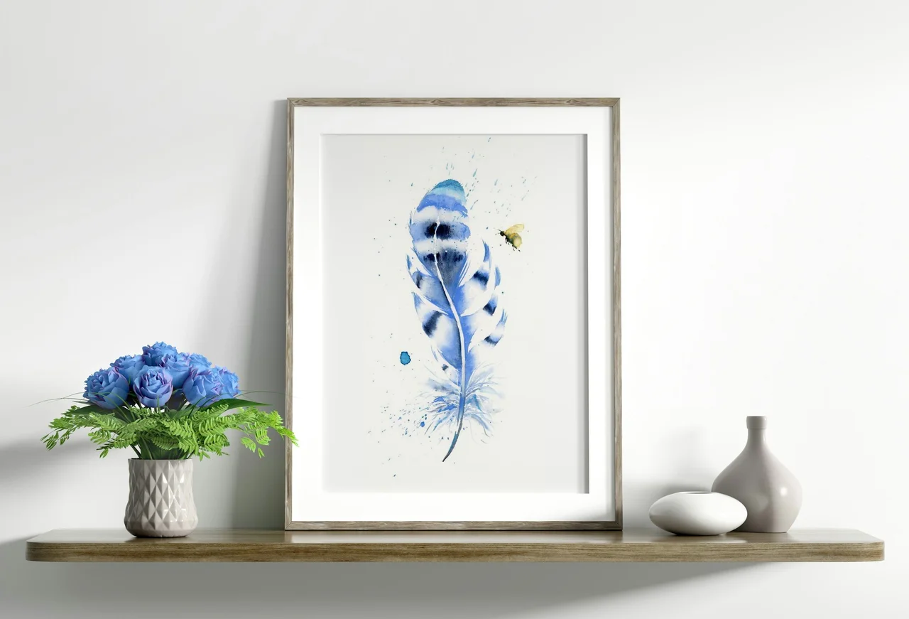 In creating this painting, I use soft blues, deep indigos, and light washes of teal to convey a sense of grace and gentle strength. The feather, with its subtle, fluid transitions and delicate splatters, signifies the delicate yet resilient nature of living things. With each brushstroke, I layer and blend to evoke a feeling of breaking free, much like the lone bee hovering beside it, ready to take on the world with quiet confidence. — Shayna, December 2024