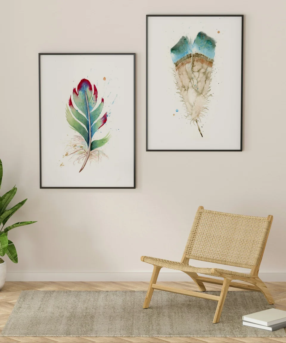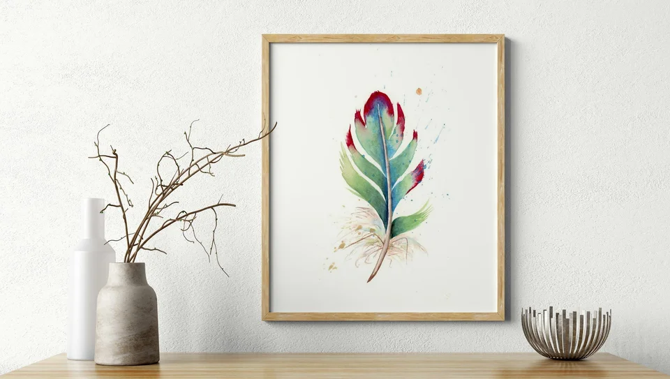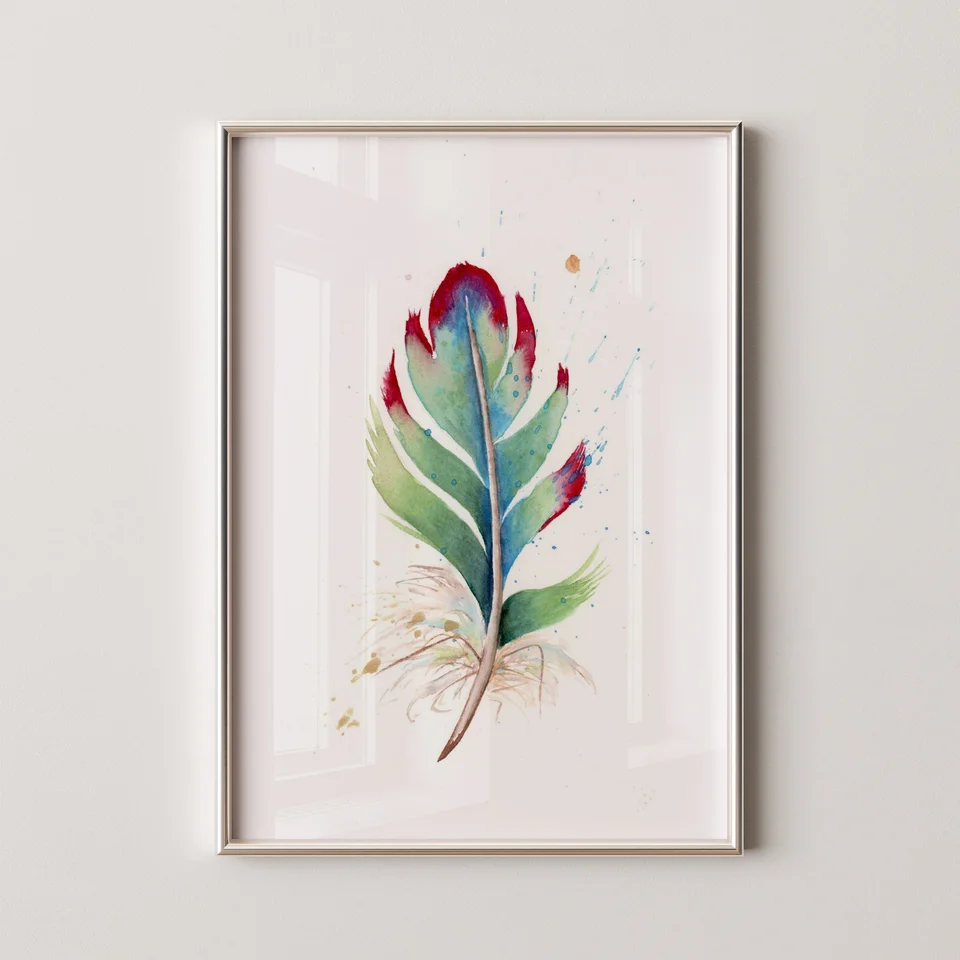 I chose vibrant greens and blues, with rich red tips to create a sense of gentle strength and movement in this feather. The soft edges and delicate layering reflect my careful brushstrokes, while the spontaneous drips and splatters bring an… read more