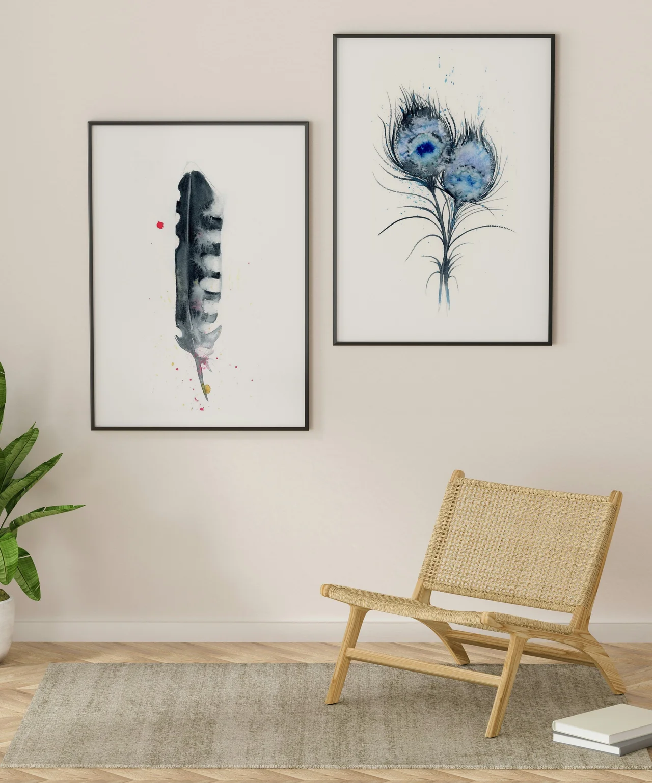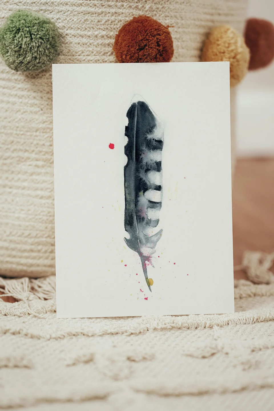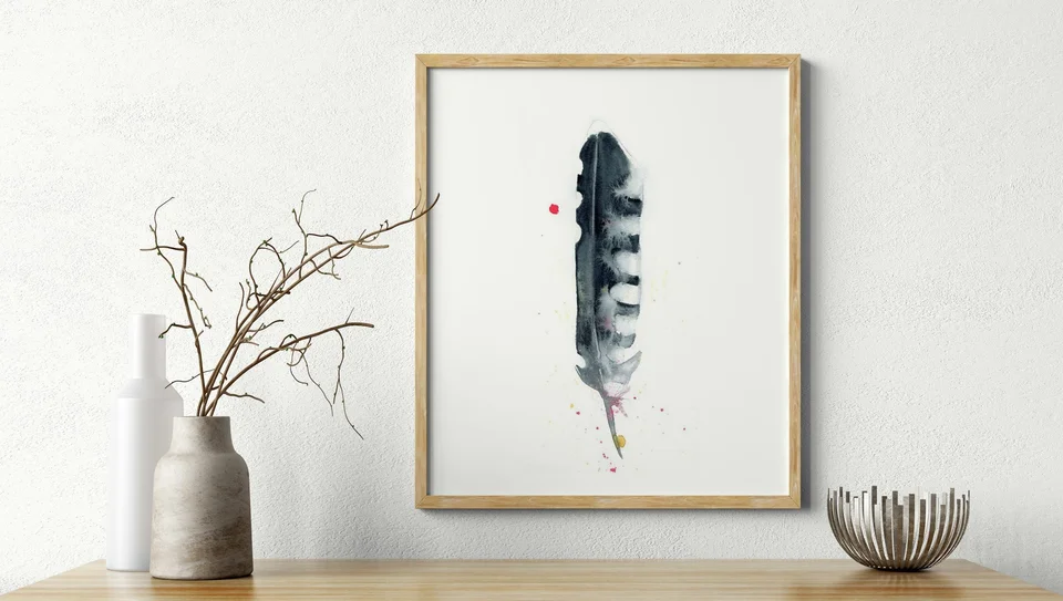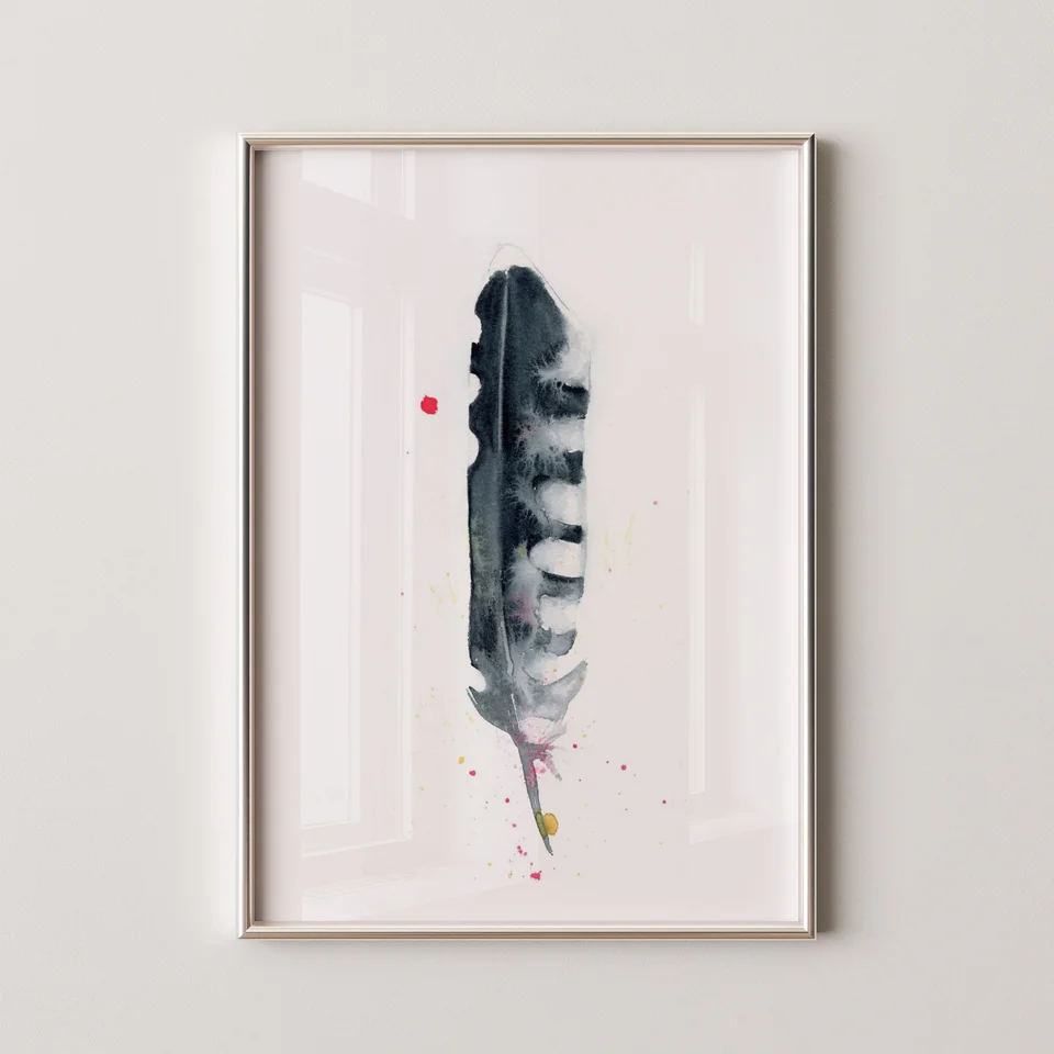 In this painting, I used soft washes of black and white to create a feather that feels both delicate and strong. The gentle transitions and layering give the piece a calming flow, while the splatters of pink and yellow add… read more