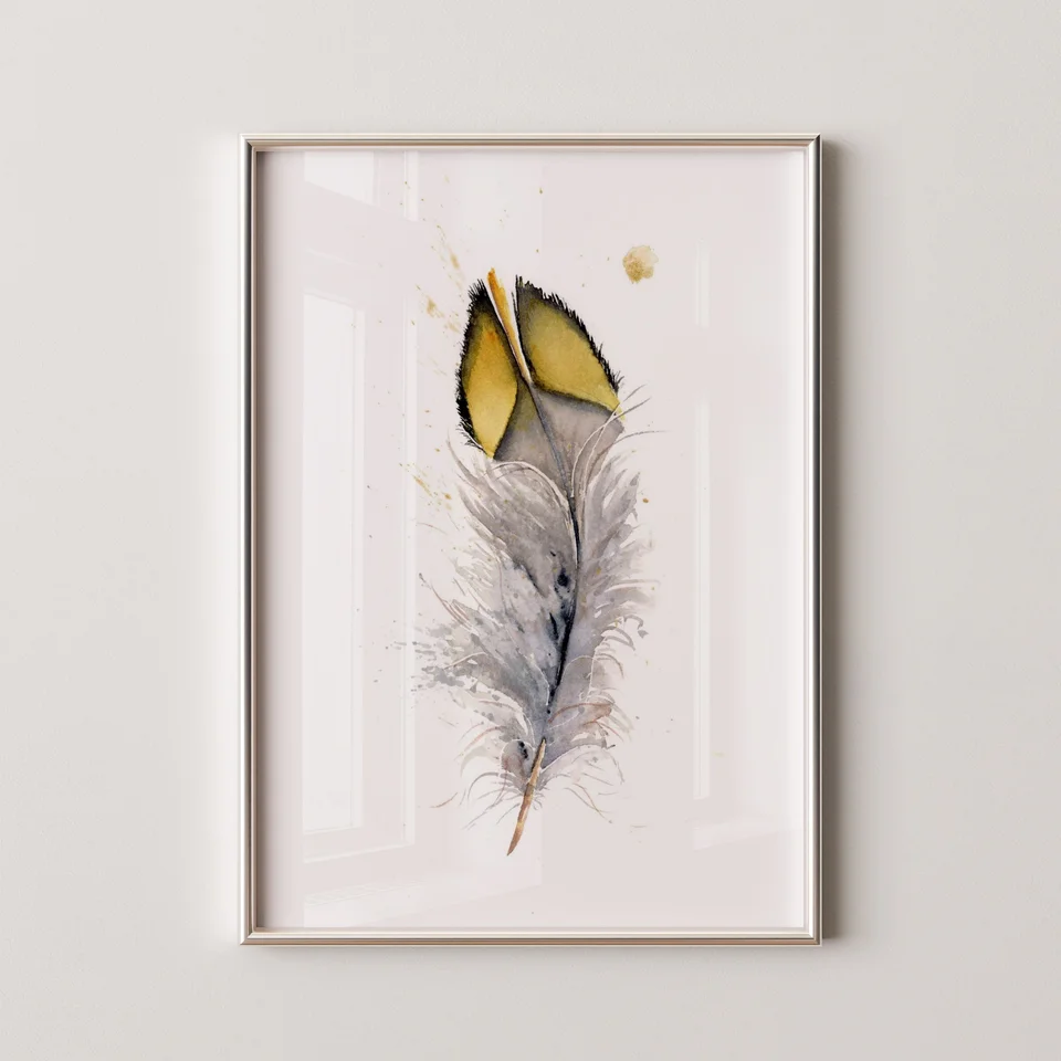 In this painting, I used soft, muted grays and warm yellows to create a sense of gentle strength and focus. The delicate transitions and subtle layering of watercolor bring out the feather's intricate details, while the light brushstrokes and splatters add a touch of spontaneity and movement. As I painted, I felt a quiet confidence, knowing that the simplicity and clarity of the feather would resonate with those seeking a moment of reflection and inner strength. — Shayna, May 2025