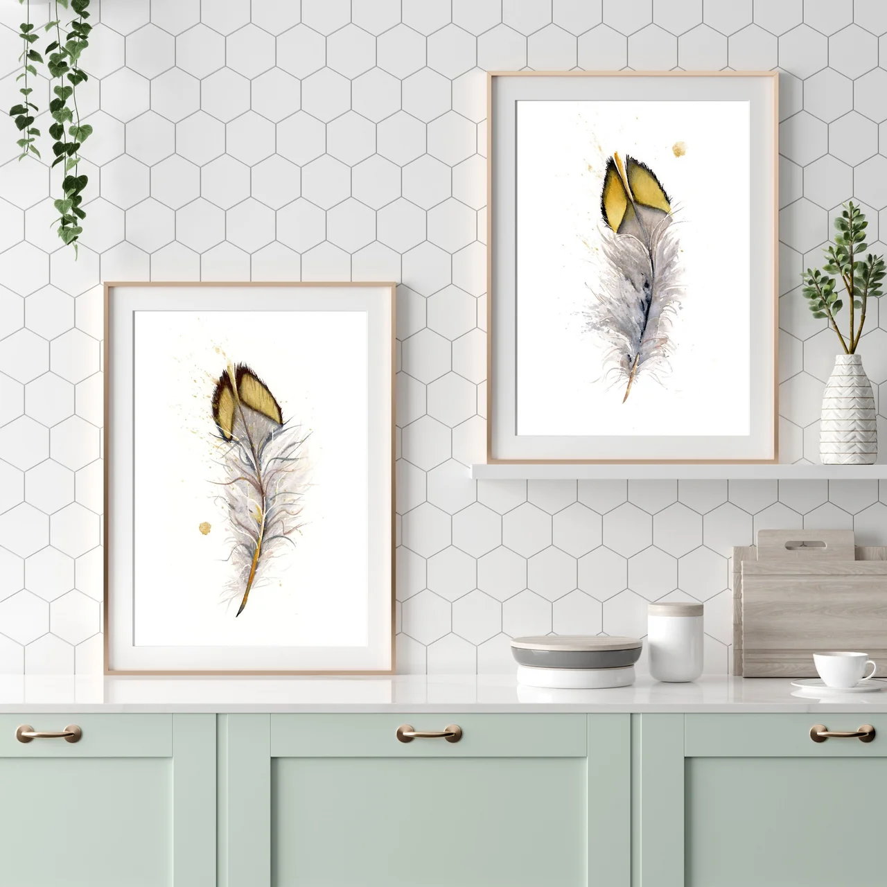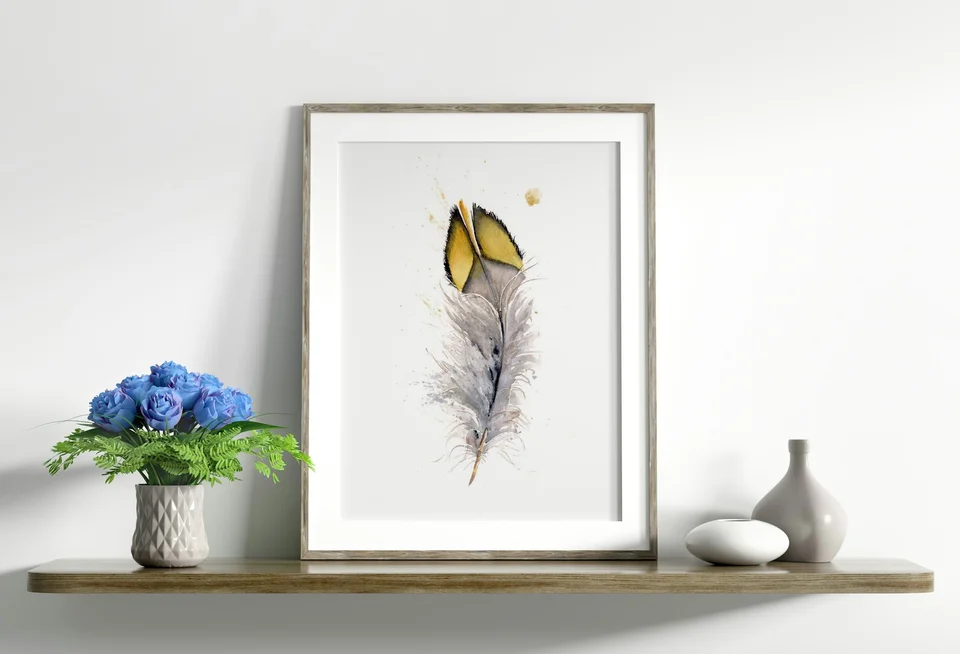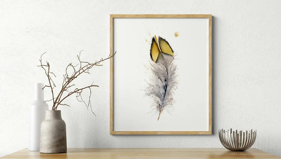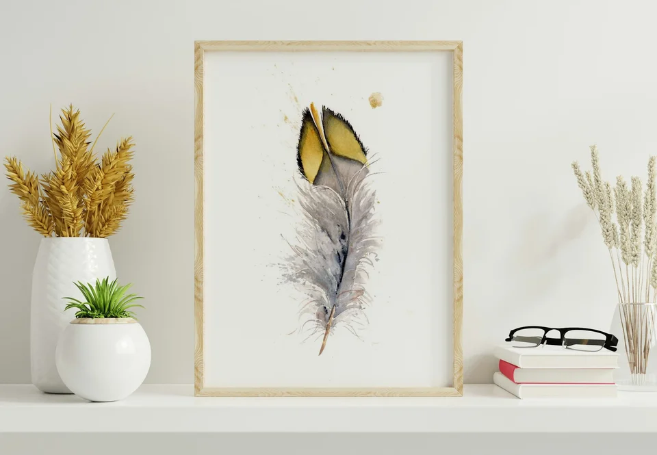 In this painting, I used soft, muted grays and warm yellows to create a sense of gentle strength and focus. The delicate transitions and subtle layering of watercolor bring out the feather's intricate details, while the light brushstrokes and splatters… read more