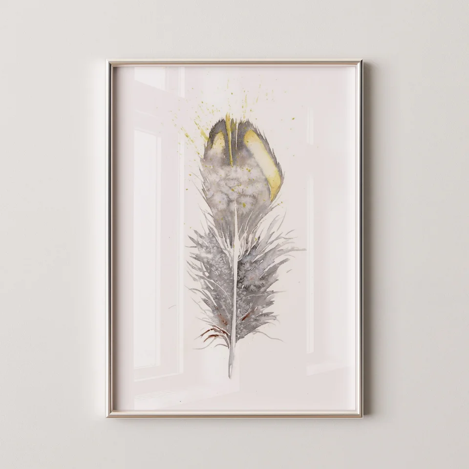 In this painting, I used soft grays and gentle yellows to create a feather that feels both delicate and strong. The watercolor technique allowed me to blend the colors seamlessly, with subtle splatters and drips adding a sense of spontaneity and life. As I painted, I focused on the gentle transitions and the lightness of the brushstrokes, aiming to capture a feeling of renewal and the quiet assurance that comes with new beginnings. — Shayna, May 2025
