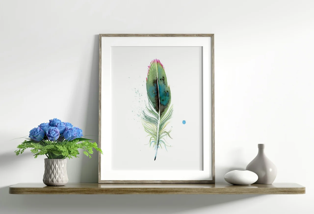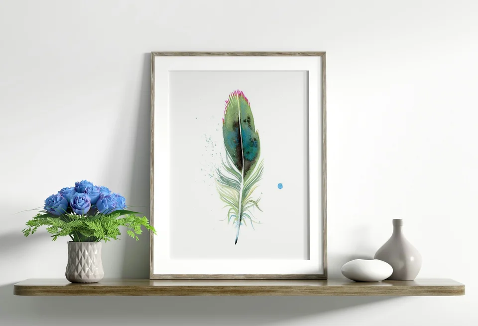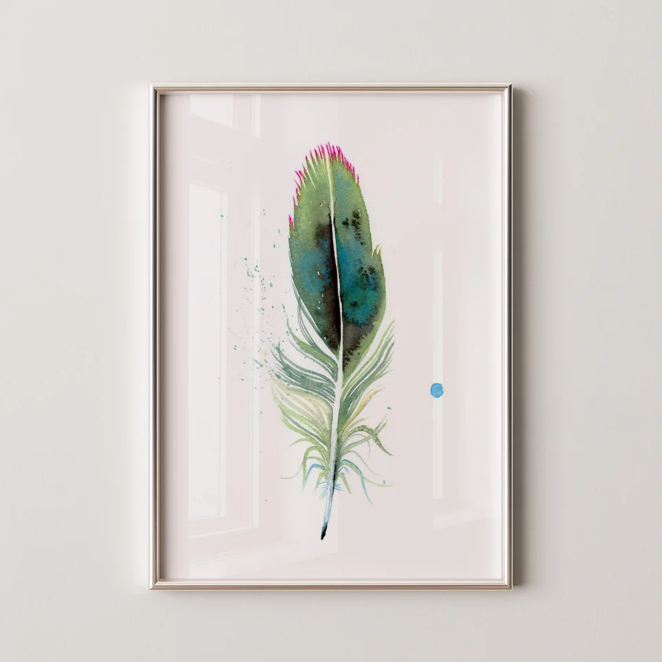 In this painting, I used a blend of deep greens and blues, accented with hints of pink at the tips, to create a feather that feels both delicate and strong. The soft transitions and gentle splatters around the edges suggest movement and freedom, while the fine brushstrokes capture the intricate details of each strand. As I painted, I felt a sense of calm and purpose, hoping to inspire others to find their own path and embrace the beauty in life's simple moments. — Shayna, May 2025