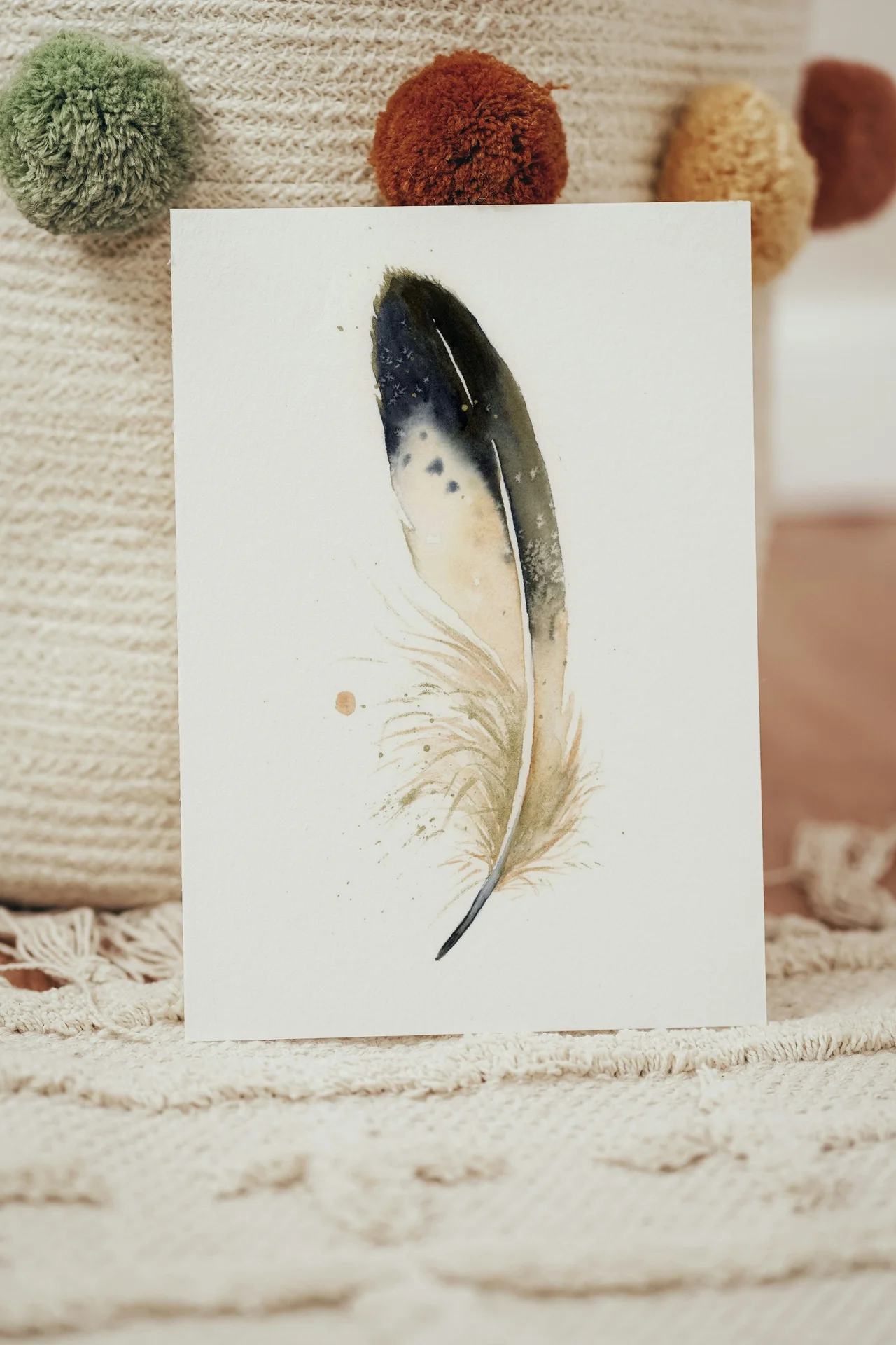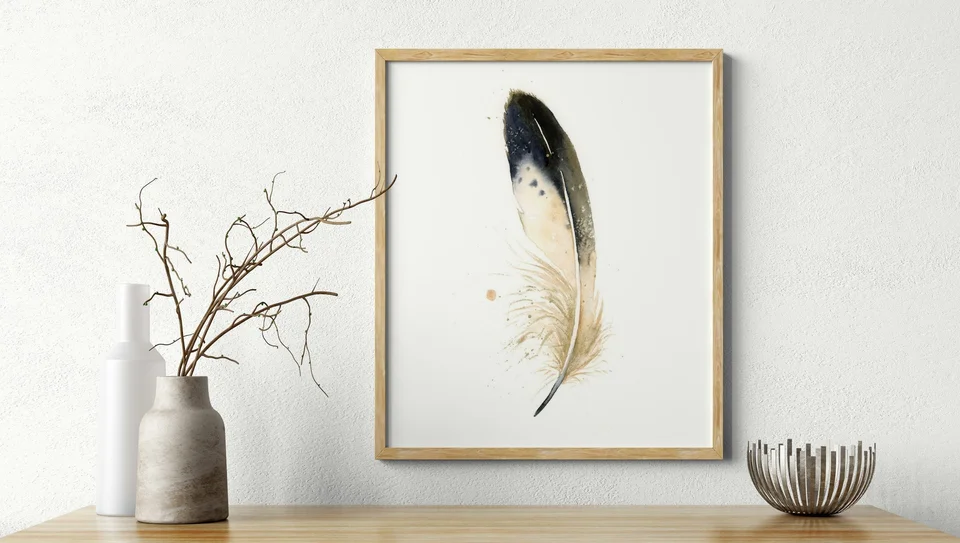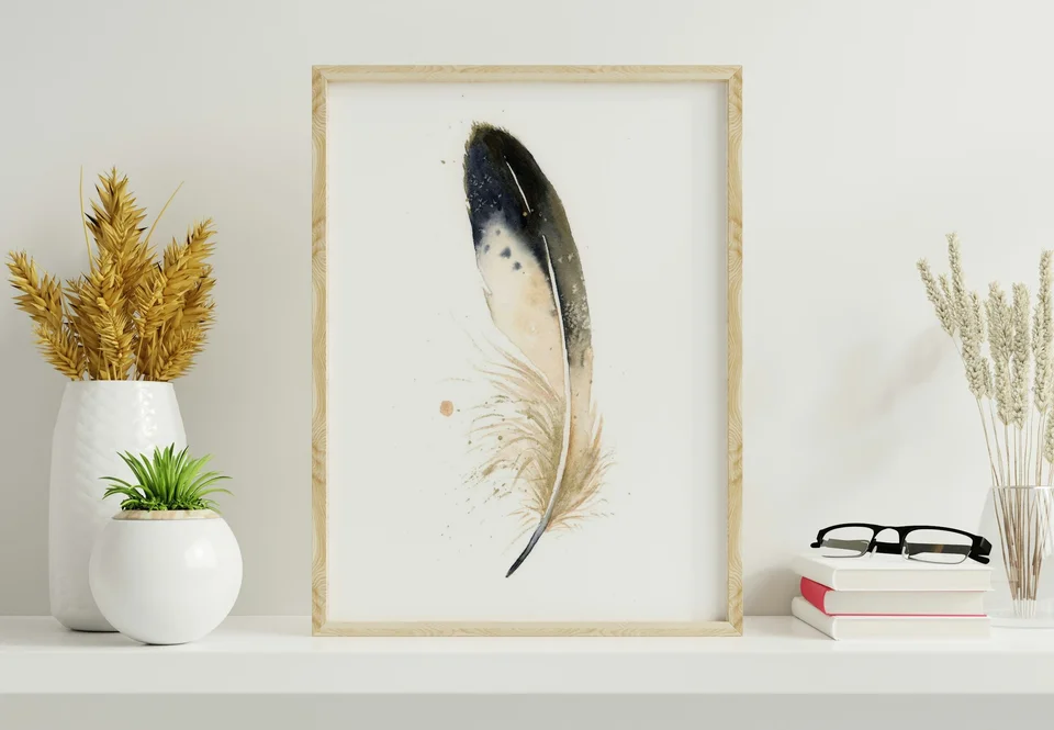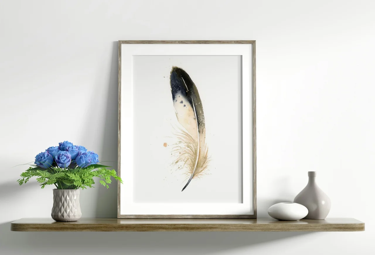 In this painting, I used soft, earthy tones of beige and deep blue to create a gentle yet striking feather. The delicate transitions and subtle layering of watercolor bring a sense of calm and direction, while the fine brushstrokes and gentle splatters add a touch of whimsy and warmth. As I painted, I felt a quiet confidence in the way the feather seemed to float, offering a sense of comfort and reassurance to anyone who gazes upon it. — Shayna, June 2025