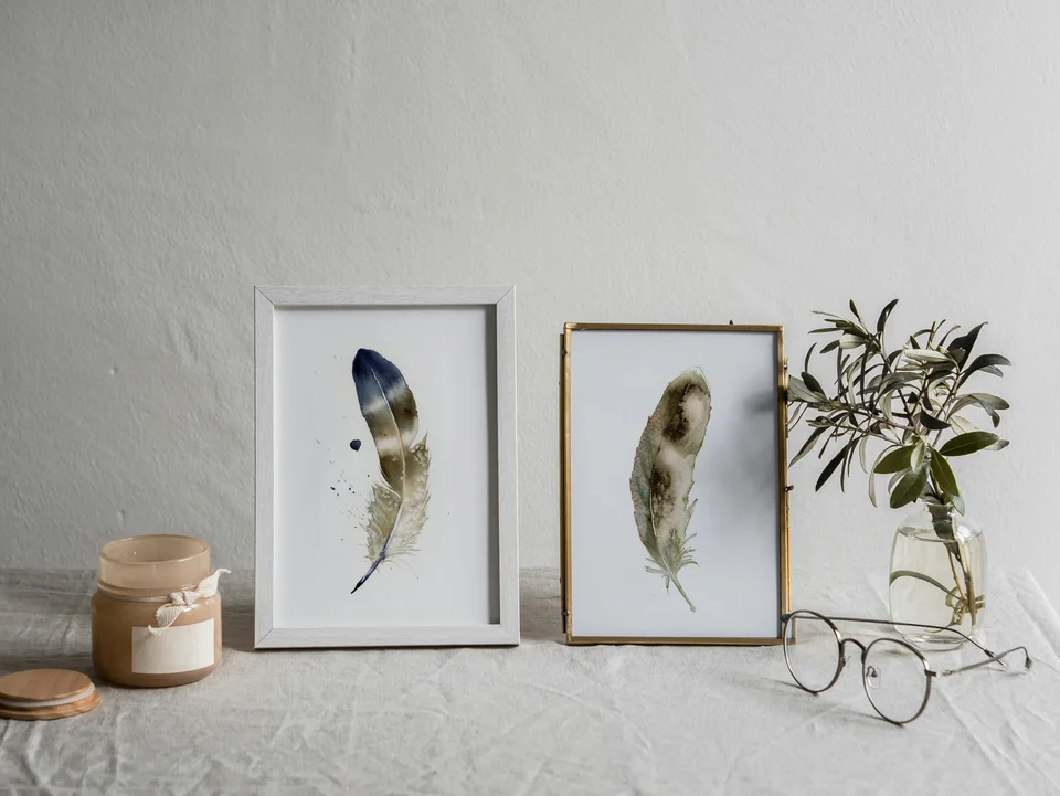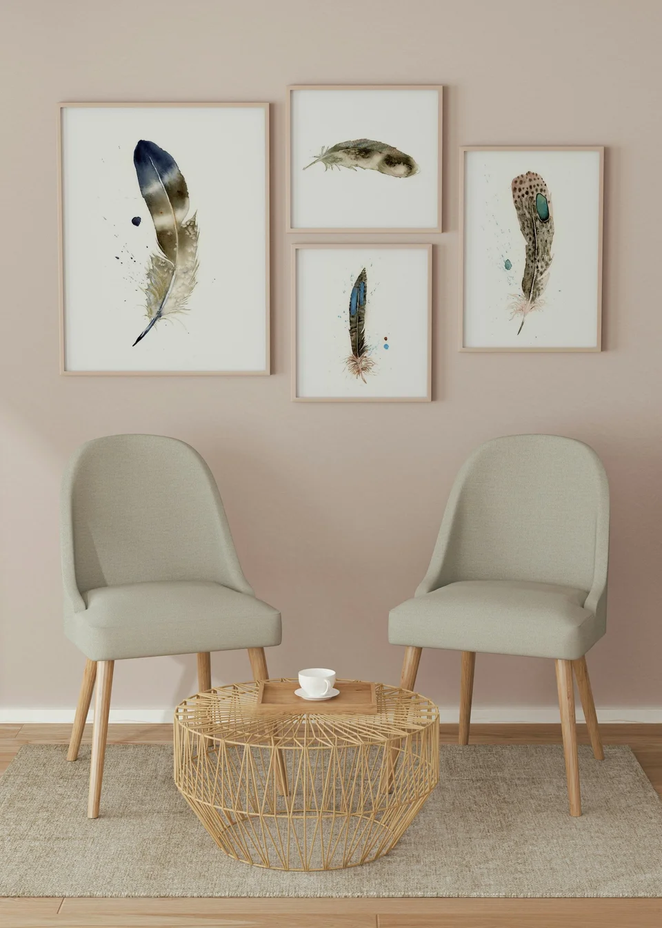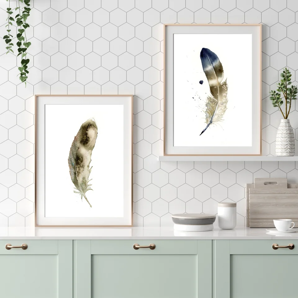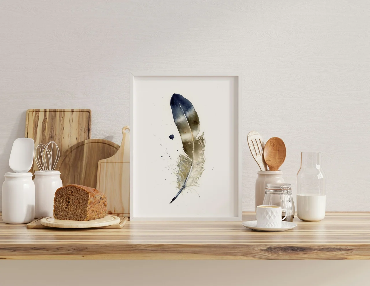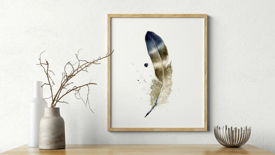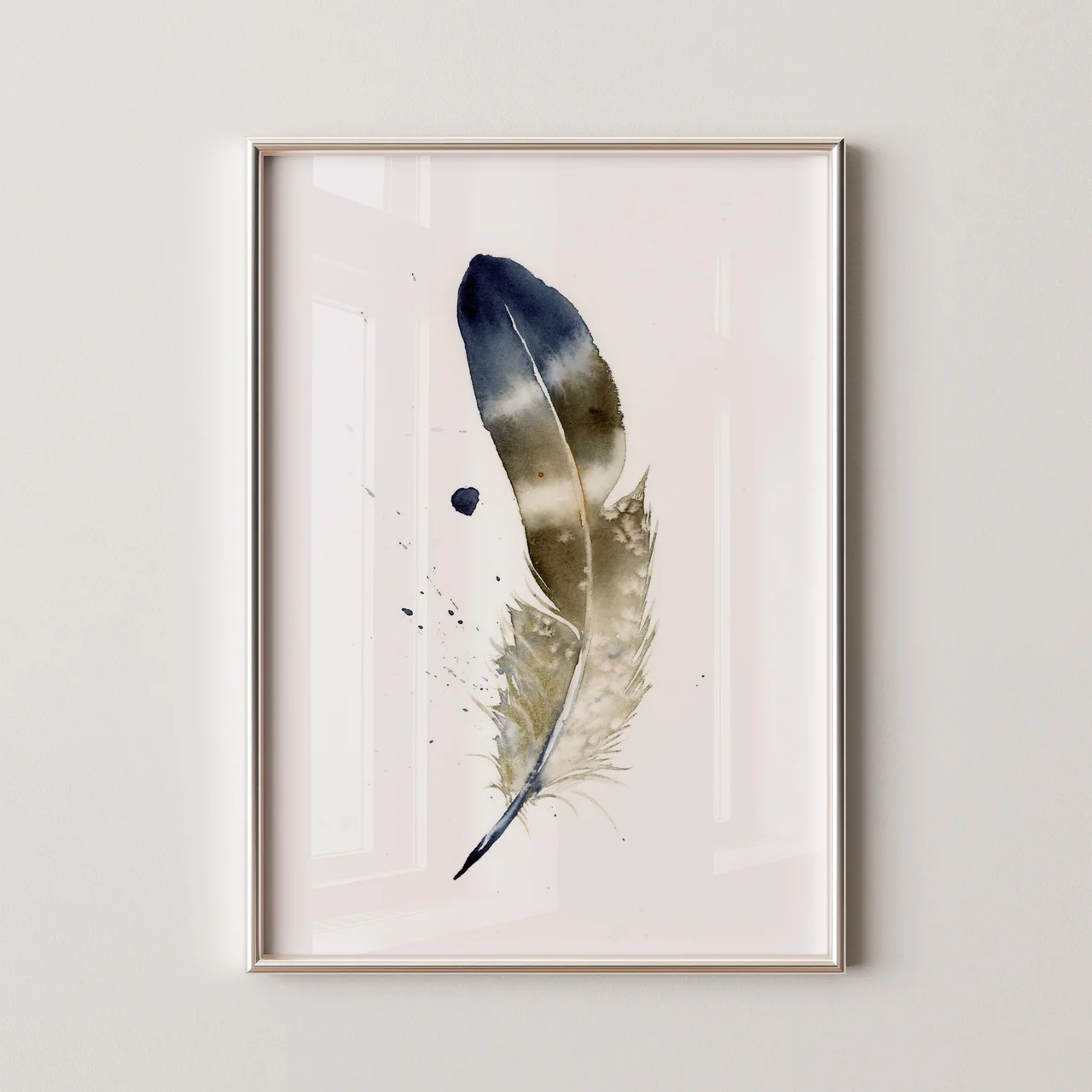I chose a soft, muted palette of deep blues and earthy browns to capture the delicate essence of the feather. The gentle transitions and subtle layering of watercolor create a sense of lightness and movement, while the splatters and drips… read more