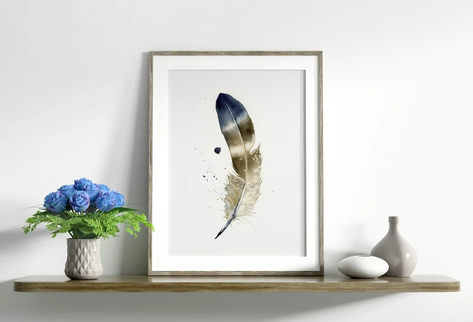 I chose a soft, muted palette of deep blues and earthy browns to capture the delicate essence of the feather. The gentle transitions and subtle layering of watercolor create a sense of lightness and movement, while the splatters and drips add a touch of spontaneity. As I painted, I felt a quiet connection to the past, honoring the simple beauty of nature and the memories it holds. — Shayna, June 2025