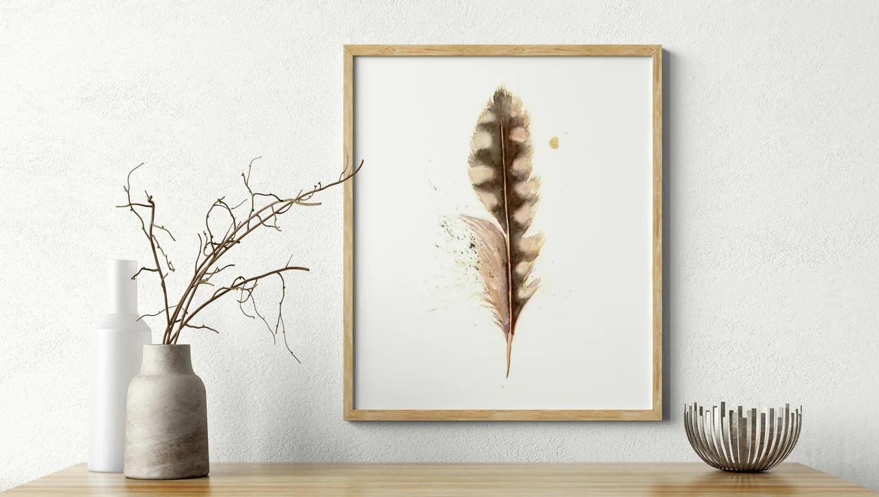 In this painting, I used the hand-made pigment Minnesota Lake #1 to create a soft, earthy palette that flows gently across the feather's form. The delicate transitions and subtle layering of browns and grays capture the feather's natural beauty, while the light splatters and drips add a sense of movement and life. As I painted, I felt a deep connection to the simple yet profound moments that shape our lives, hoping to inspire others to reflect on their own cherished memories. — Shayna, September 2025