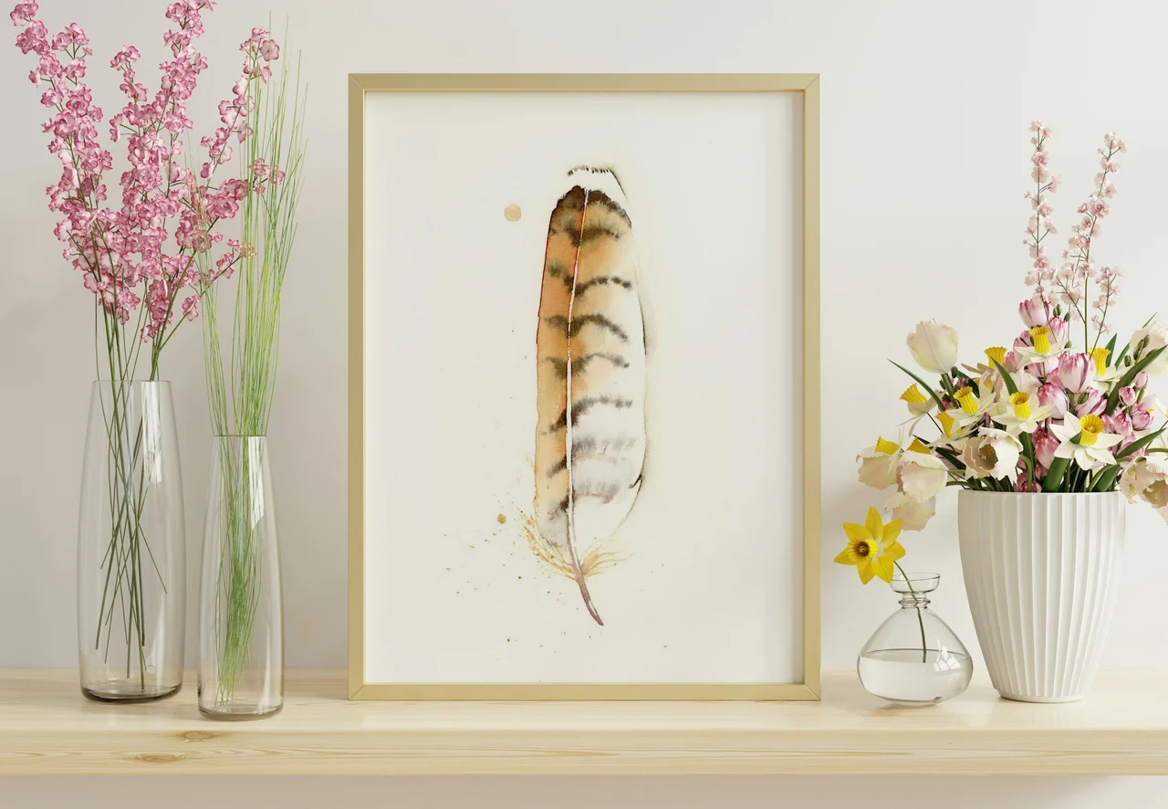 In this painting, I used the hand-made pigment Rocky Mountain #5 to create a warm, earthy palette that flows gently across the feather's form. The soft transitions and delicate layering of colors bring out the feather's natural beauty, while the subtle splatters and drips add a touch of spontaneity and life. As I painted, I felt a deep sense of unity with nature, and I hope this piece inspires you to embrace your inner strength and the bonds that lift us up. — Shayna, September 2025