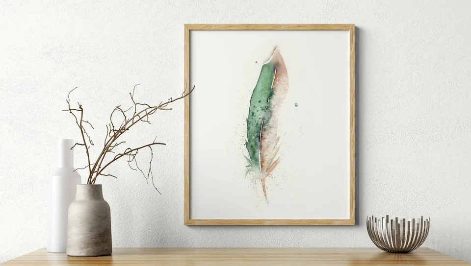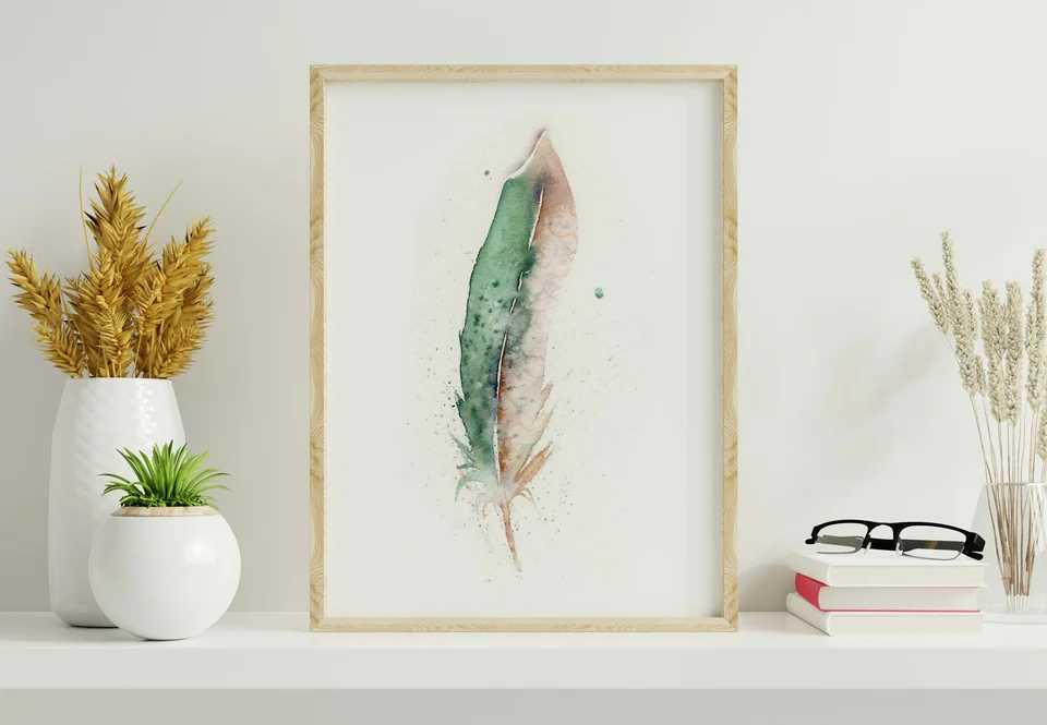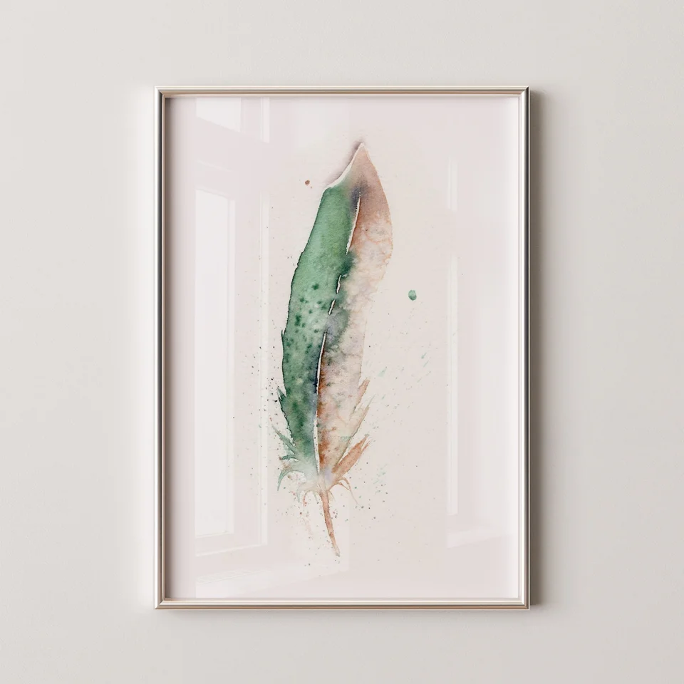 In this painting, I used my hand-made pigment, Rocky Mountain #7, to create a unique blend of earthy browns and deep greens, capturing nature's quiet strength. The gentle transitions and soft blends of color in the feather are achieved through delicate brushstrokes, with a few splatters and drips that add spontaneity. My choice of colors and technique is intentional, reflecting resilience and growth, inviting you to connect with your own inner strength and journey. — Shayna, February 2023