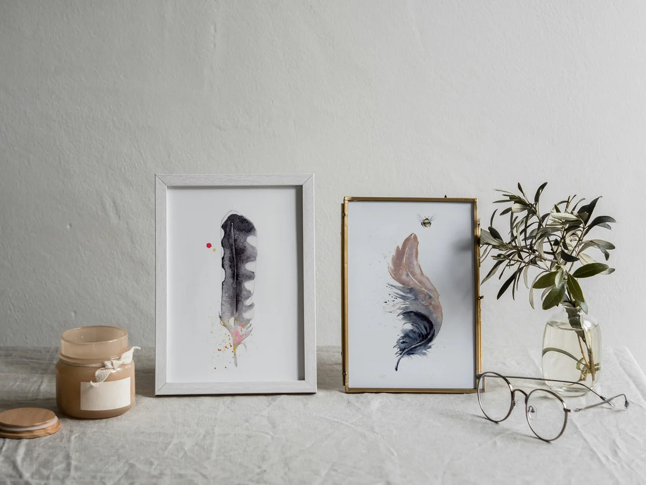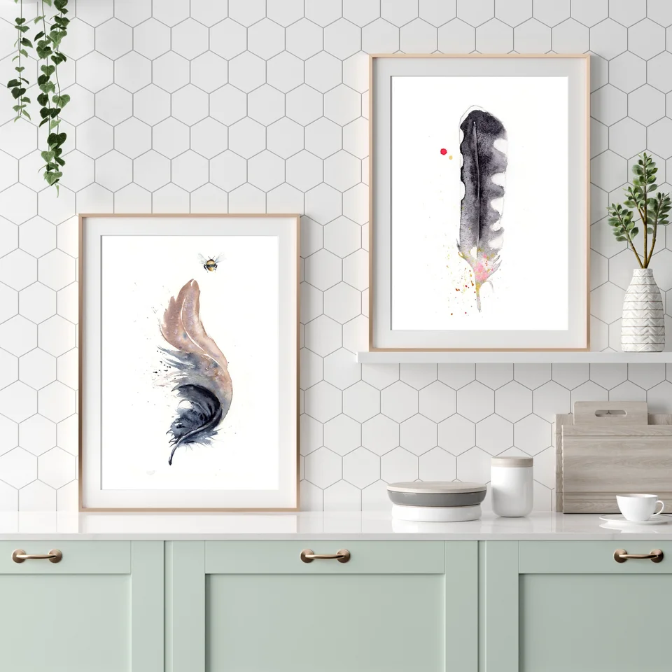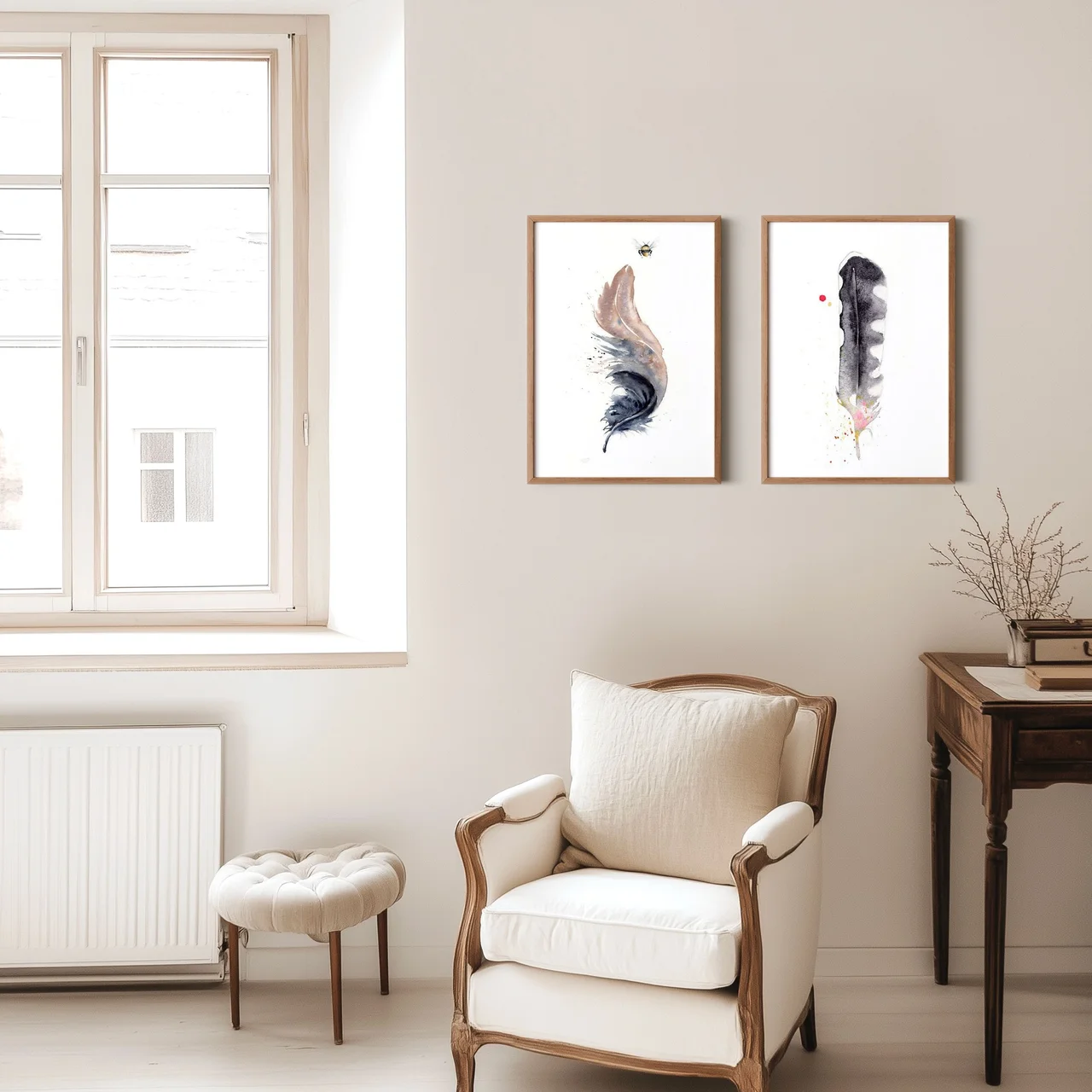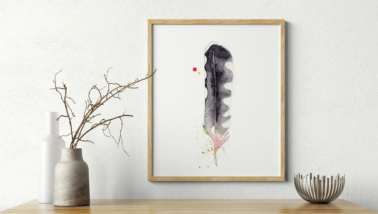 In this piece, I let the feather unfold naturally with washes of soft black and delicate white, creating a gentle play of light and shadow. The pink and orange splatters at the base, with their playful drips and speckles, breathe… read more