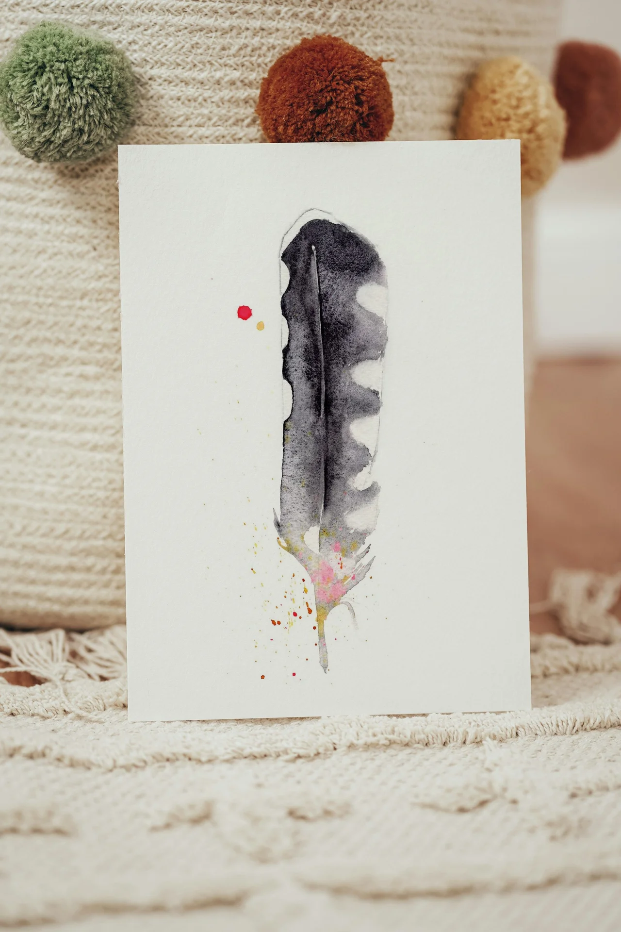 In this piece, I let the feather unfold naturally with washes of soft black and delicate white, creating a gentle play of light and shadow. The pink and orange splatters at the base, with their playful drips and speckles, breathe life and warmth into the composition, suggesting motion and transformation. As I painted, I felt a sense of unfolding and revelation, hoping to inspire others to see their own journeys within the delicate balance of colors and form. — Shayna, November 2022