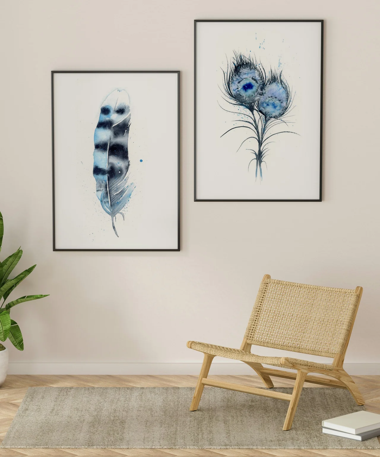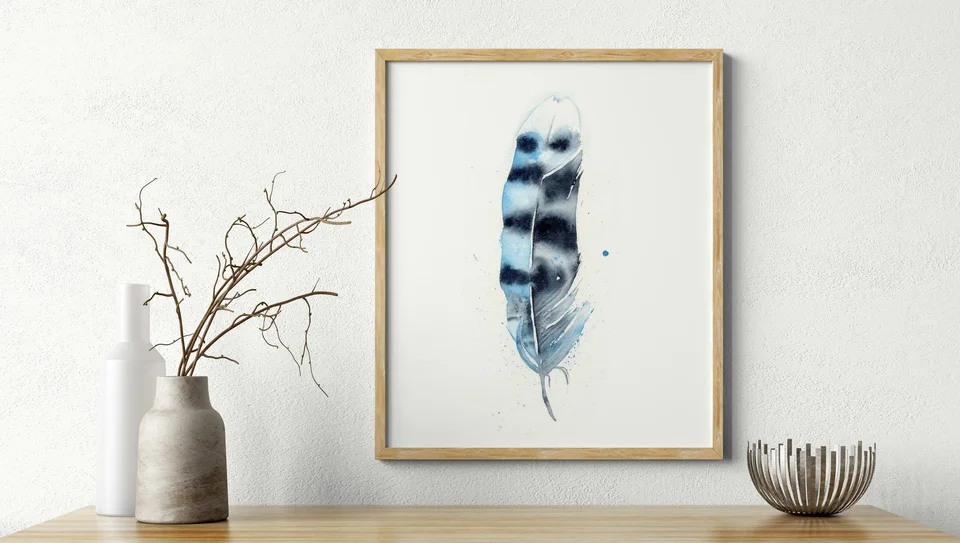 I painted this feather with gentle, flowing strokes of deep blue and soft gray to capture its delicate yet strong nature. The colors transition seamlessly from dark, bold lines to light, airy textures, using layers that intertwine like whispers on… read more