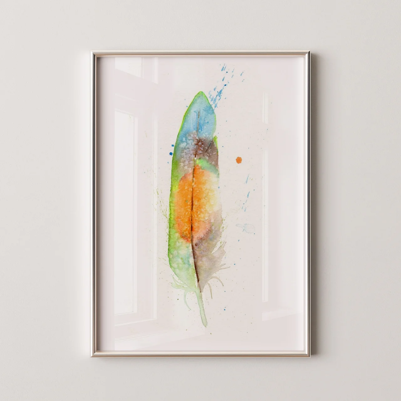 In this piece, I carefully layered hues of soft greens, vibrant oranges, and gentle blues to create a feather that speaks to both simplicity and elegance. Each brushstroke is intentional, capturing the natural flow and delicate edges that invite a sense of calm and assurance. The subtle transitions and splatters suggest a gentle movement, giving the feather a lightness that feels like a quiet promise. — Shayna, February 2023